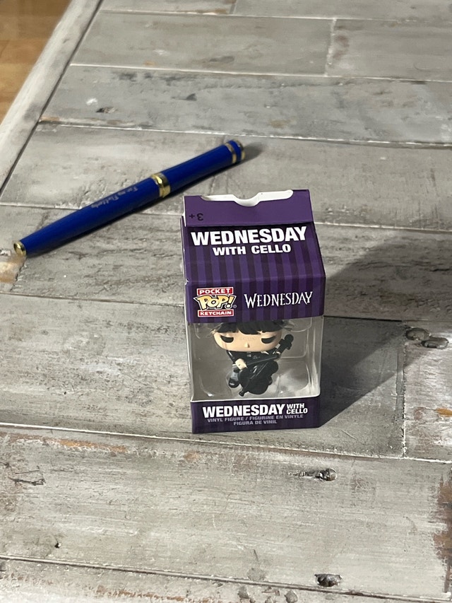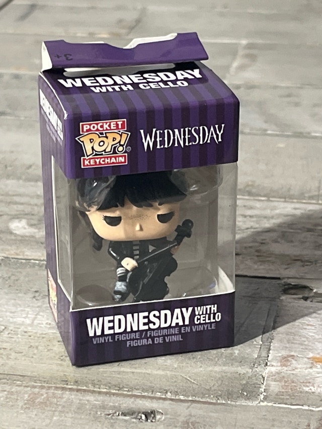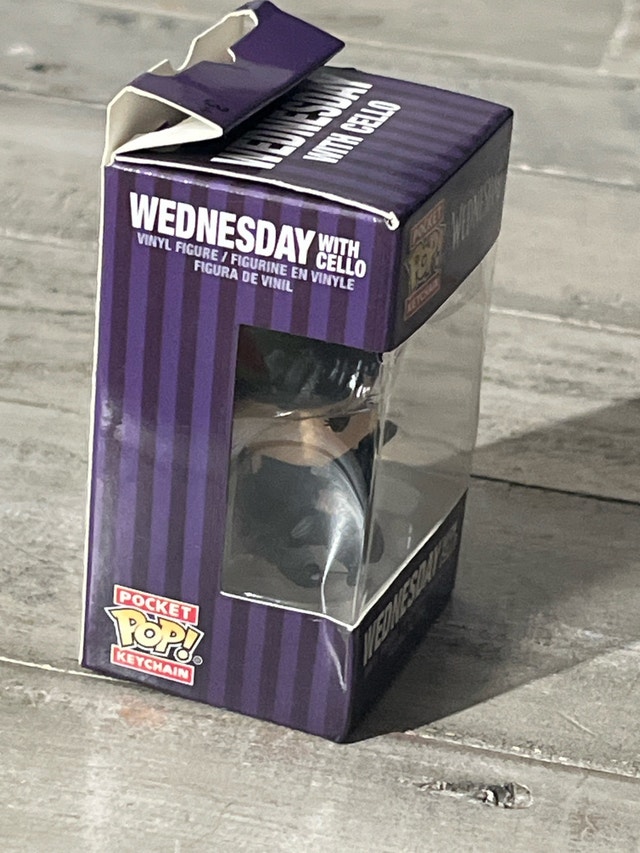 I'm offering a new Funko Pocket Pop! Keychain of Wednesday with Cello, still in its original packaging. This collectible keychain is perfect for fans of the iconic character Wednesday, adding a touch of dark charm to your everyday carry. The figure showcases Wednesday in her signature style, cello in hand, ready to serenade your keys or backpack. Pickup is in Brampton near Sheridan College.