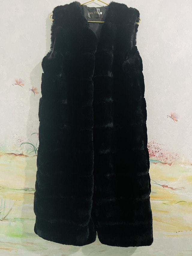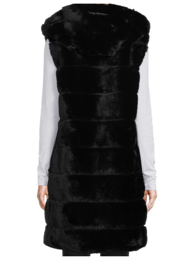 This brand new faux fur vest is a stylish and cozy addition to any wardrobe, featuring a longline silhouette and a warm hood, perfect for layering during cooler months.