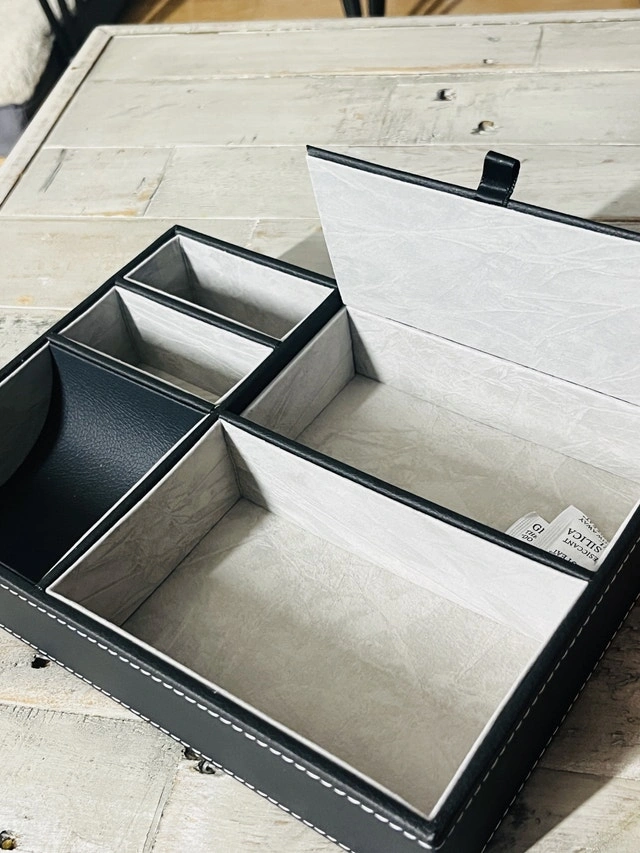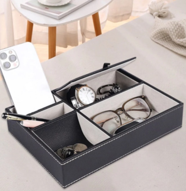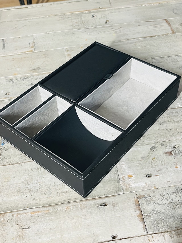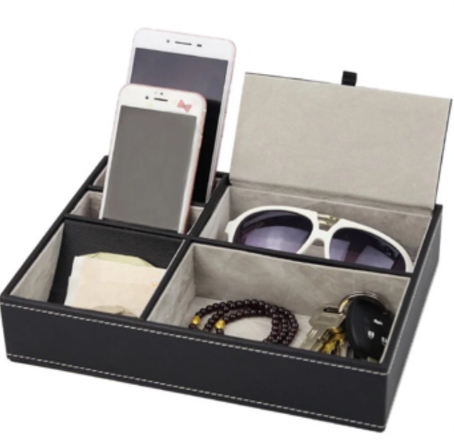 This valet tray is brand new, comfortable touching and strong. External surface is classic black, and the interior is in light color making it more convenient to find the needed items. This valet tray organizer features a single layer with 5 compartments design which is more convenient to organize different items. 2 slim compartments as slots and 1 compartment with lid, 1 curved section easy-grip compartment, and 1 extra-large compartment. Different styles compartments meets different storage needs. With different styles compartments, it will be easy to organize various items and make the nightstand and countertop tidy. 2 slim compartments are suitable for holding phone, remote control and wallet. curved section compartment for easier grip bracelets, watch and more. Compartments with lids cam protect individual valuable items and prevent them from dust. This valet tray organizer is suitable for men and women to store bedside table essentials. Storing razors, tweezers, nail clippers, jewelry, perfumes, cosmetics, stationery, and more. The valet tray organizer can be placed in bathroom, bedroom, office, dorm and more. This valet tray organizer is decent and elegant on the countertop and nightstand which can be a beautiful decoration. Perfect for entryway, bedside table, dresser, desktop Pickup is available in Brampton near Sheridan College.