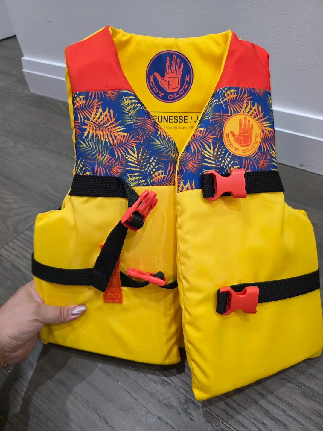 Youth size Body Glove life jacket in great condition! It's yellow with red and blue accents, perfect for keeping your little one safe and stylish at the lake or pool this summer
