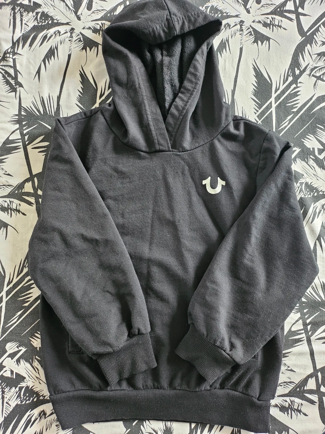 True Religion hoodie in black. Features the iconic True Religion logo on the front and back. Perfect for layering or wearing on its own!
