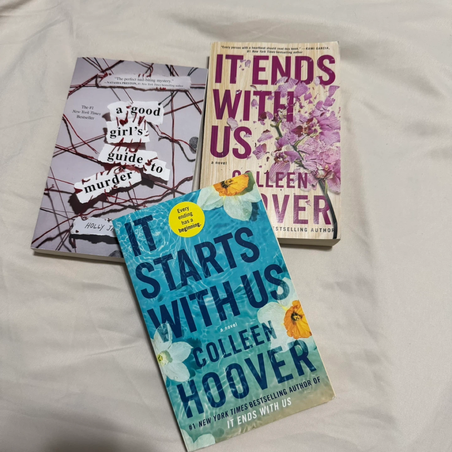 Selling a bundle of books by Colleen Hoover and Holly Jackson. Titles include "It Ends With Us," "It Starts With Us," and "A Good Girl's Guide to Murder". They're great reads!