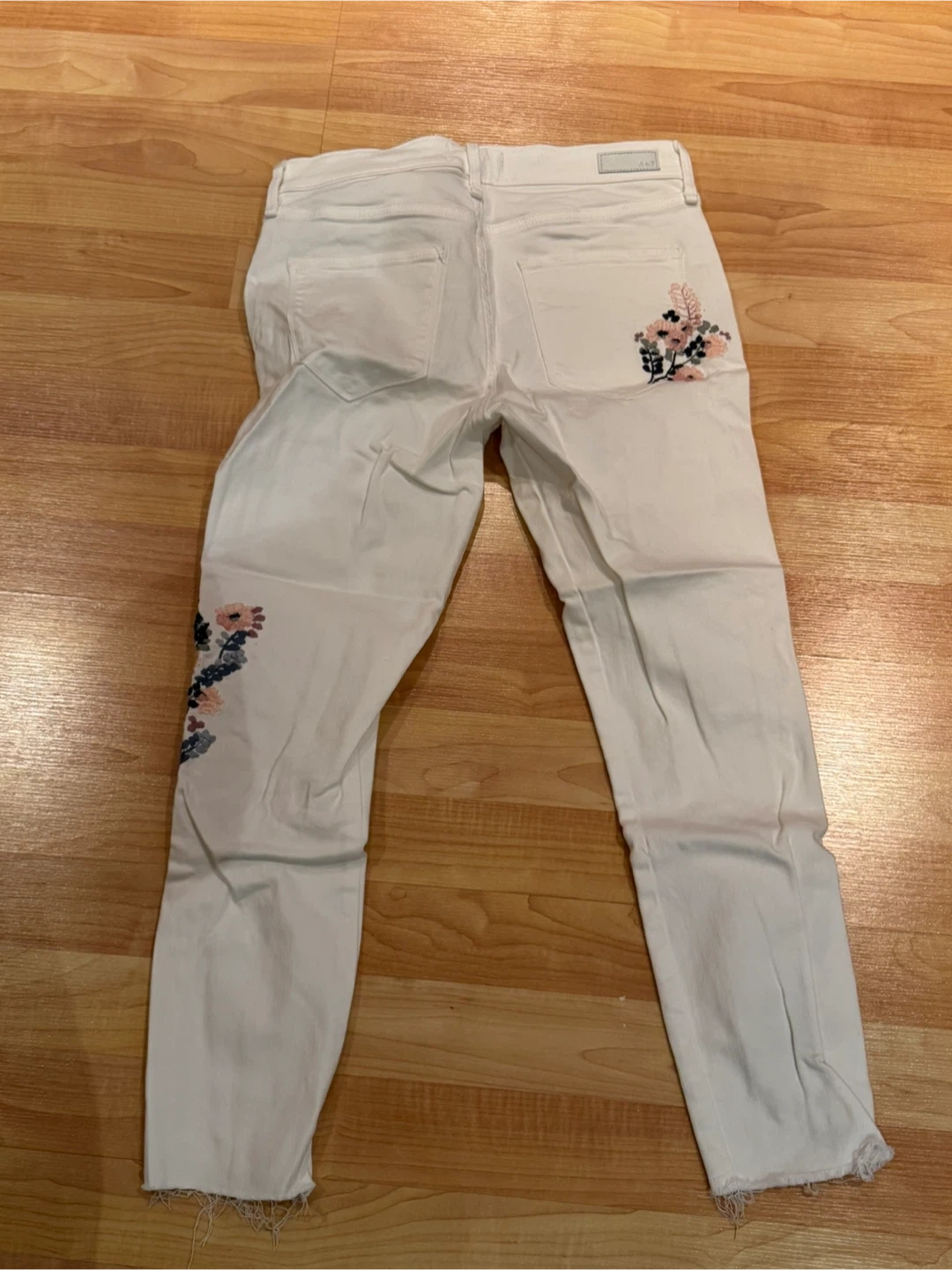 These are a pair of Abercrombie & Fitch white jeans in size 4S (27). They feature a cute floral embroidery design on the legs and back pocket. They're in great condition!