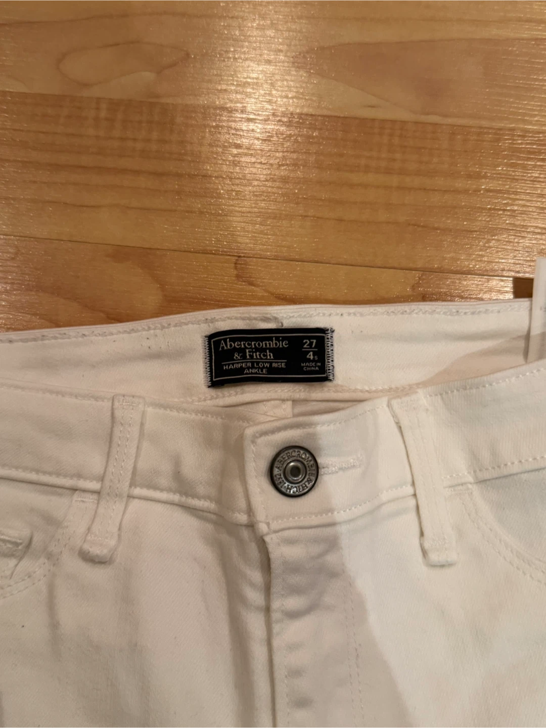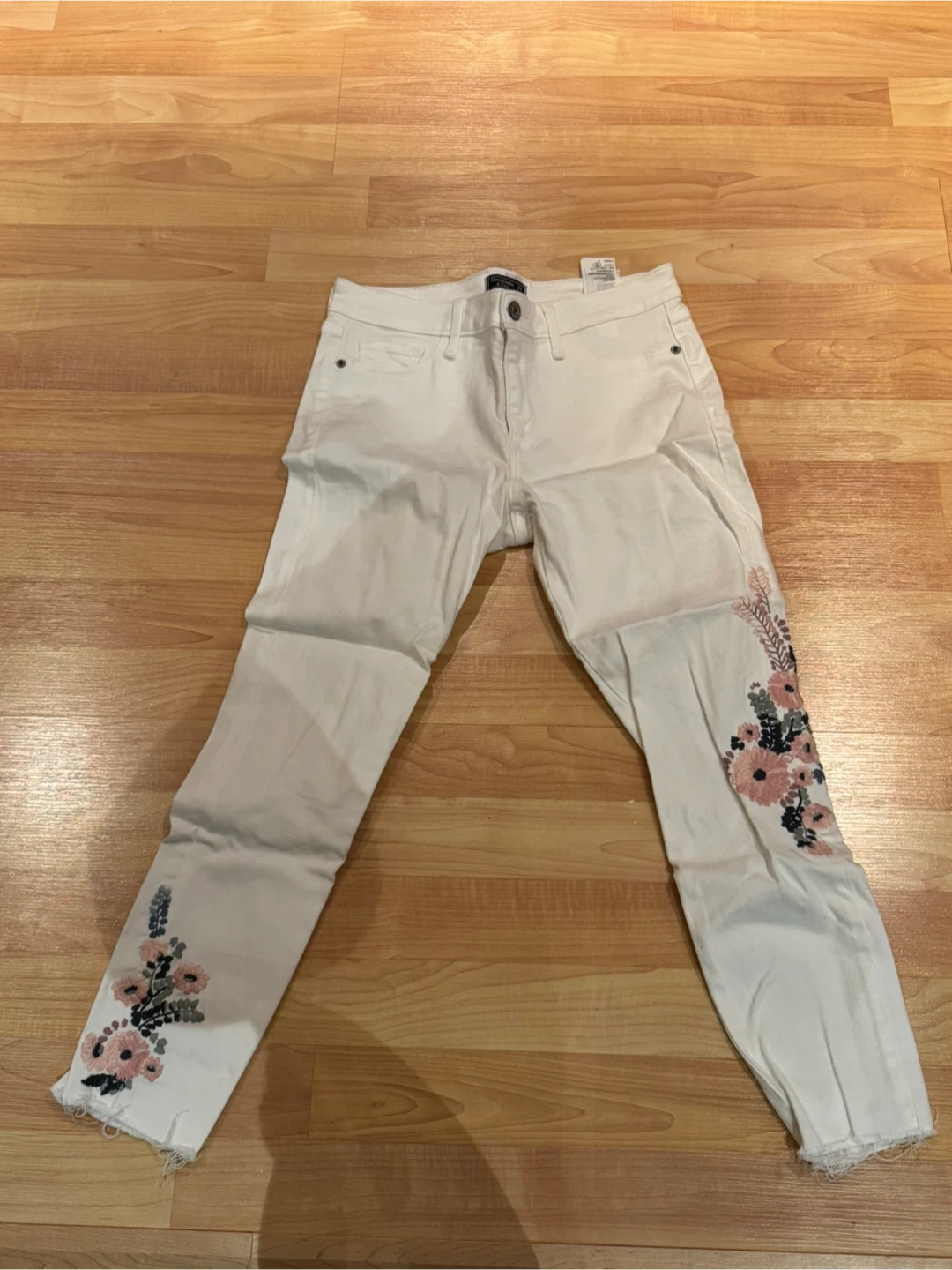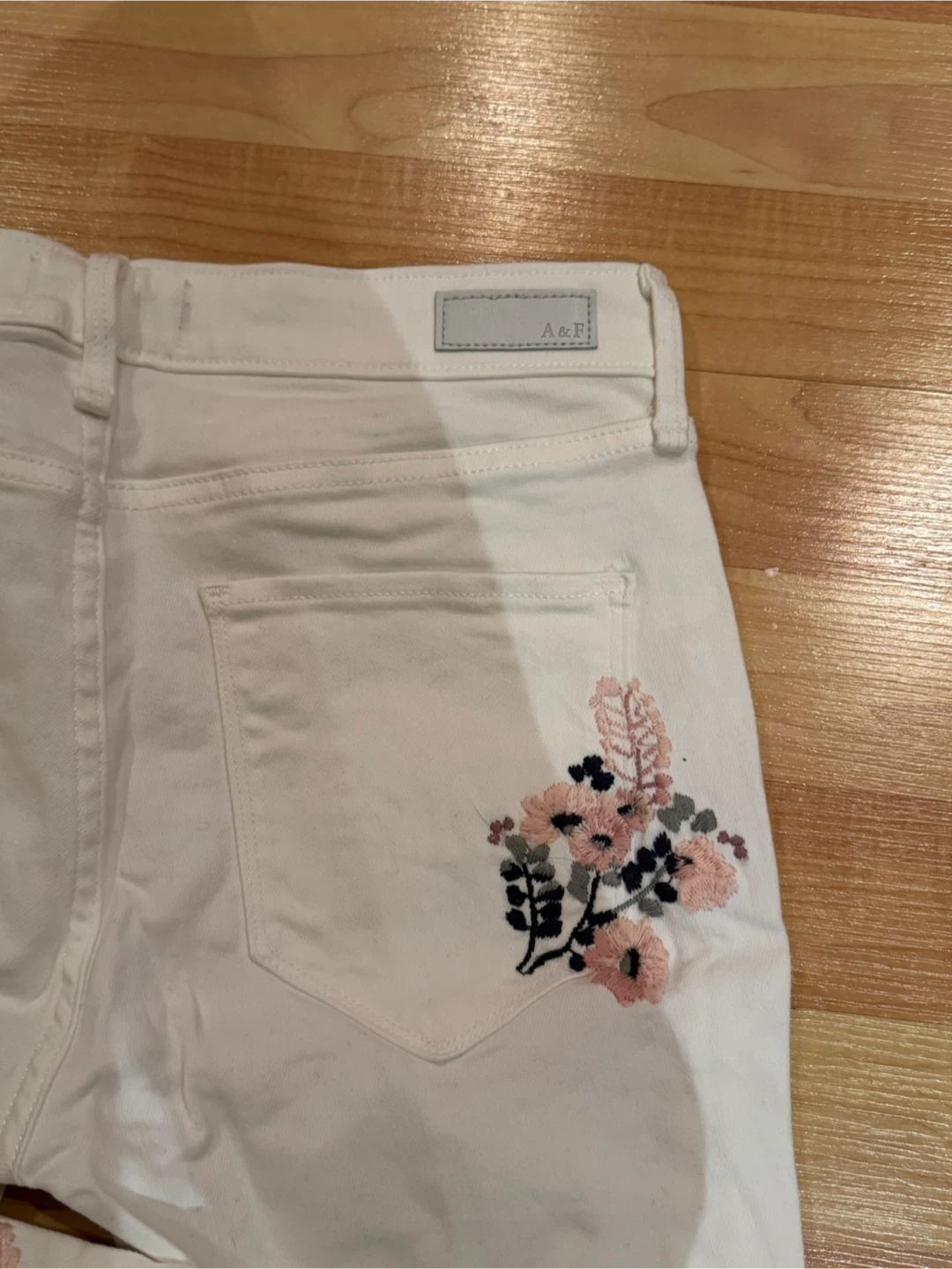 These are a pair of Abercrombie & Fitch white jeans in size 4S (27). They feature a cute floral embroidery design on the legs and back pocket. They're in great condition!
