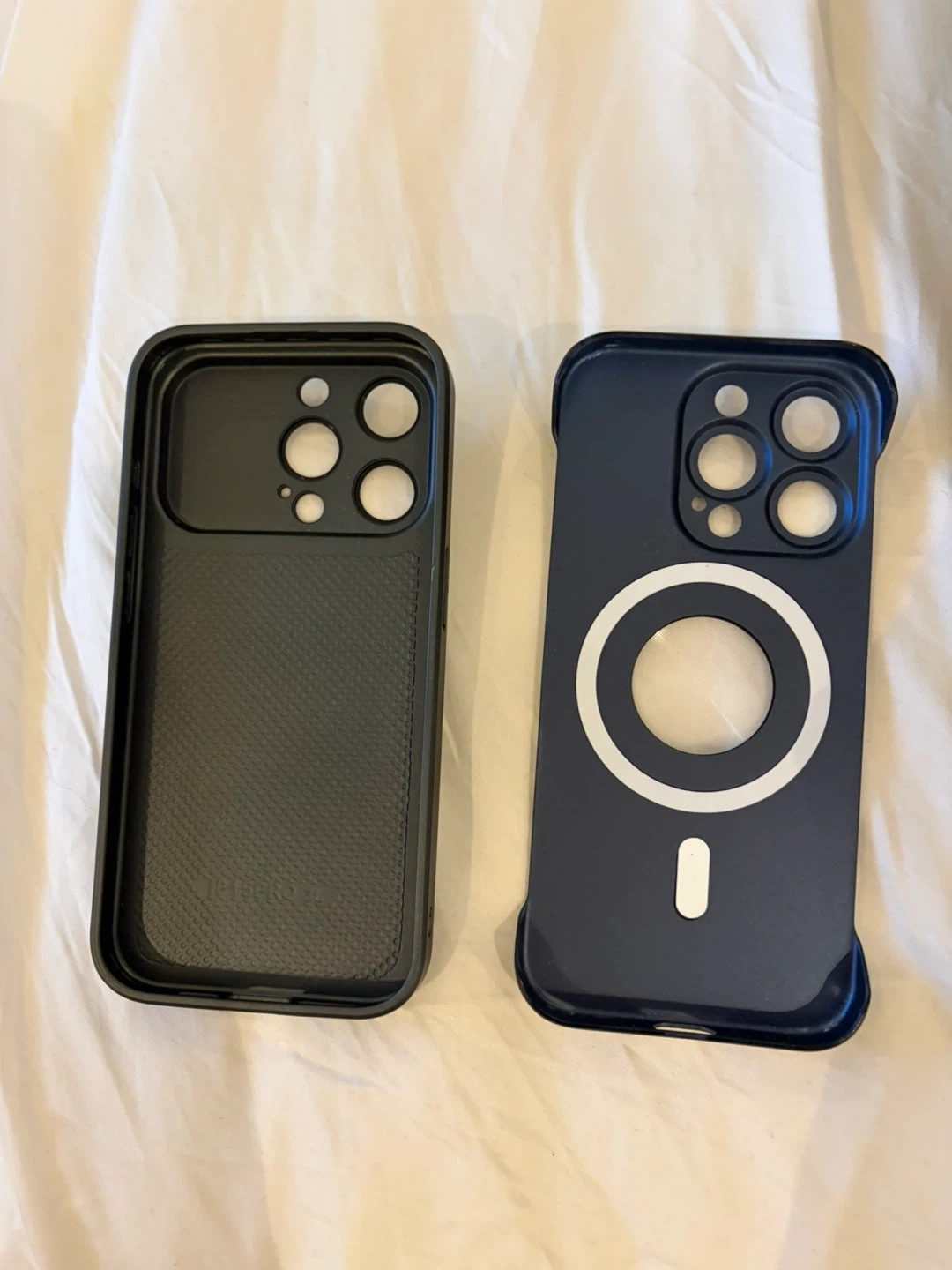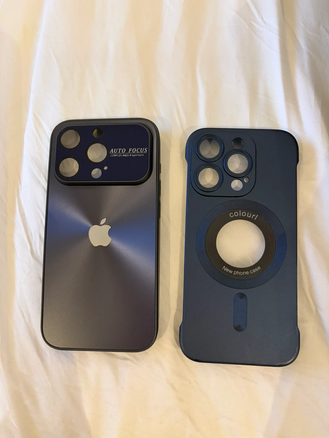 Selling two iPhone cases! One is a dark grey with "Auto Focus" and an apple logo on the back. The other is a dark blue colour with MagSafe! Both are in brand new condition.