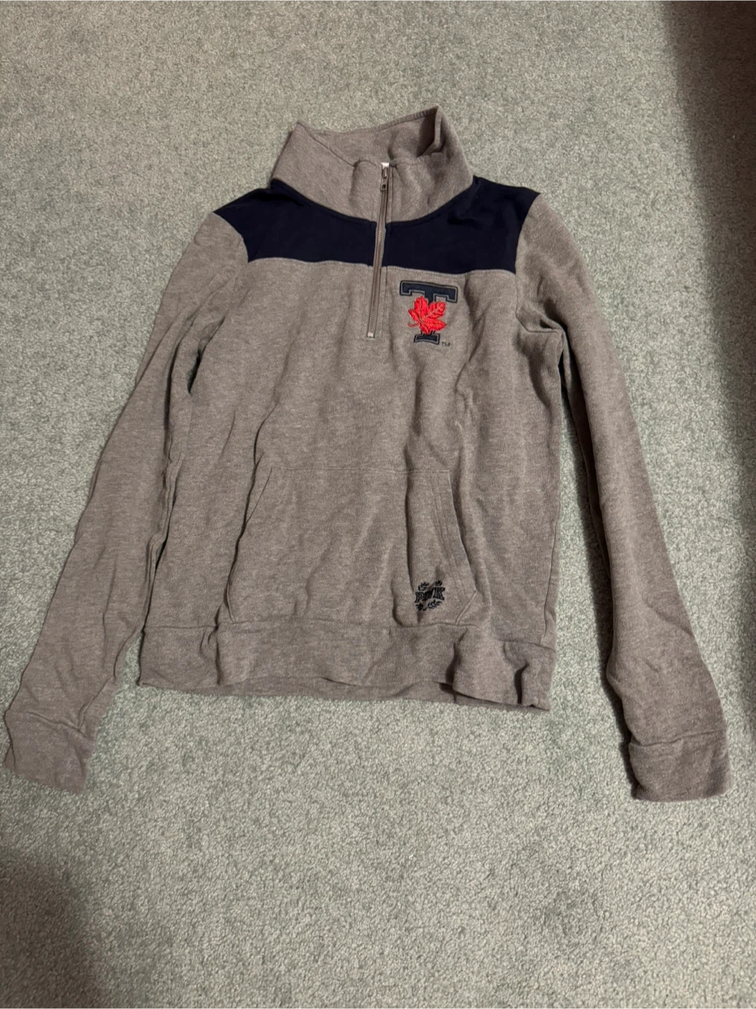 Cozy Toronto quarter-zip sweatshirt from VS Pink. The sweatshirt is a stylish grey with navy blue accents and features the iconic Toronto logo.