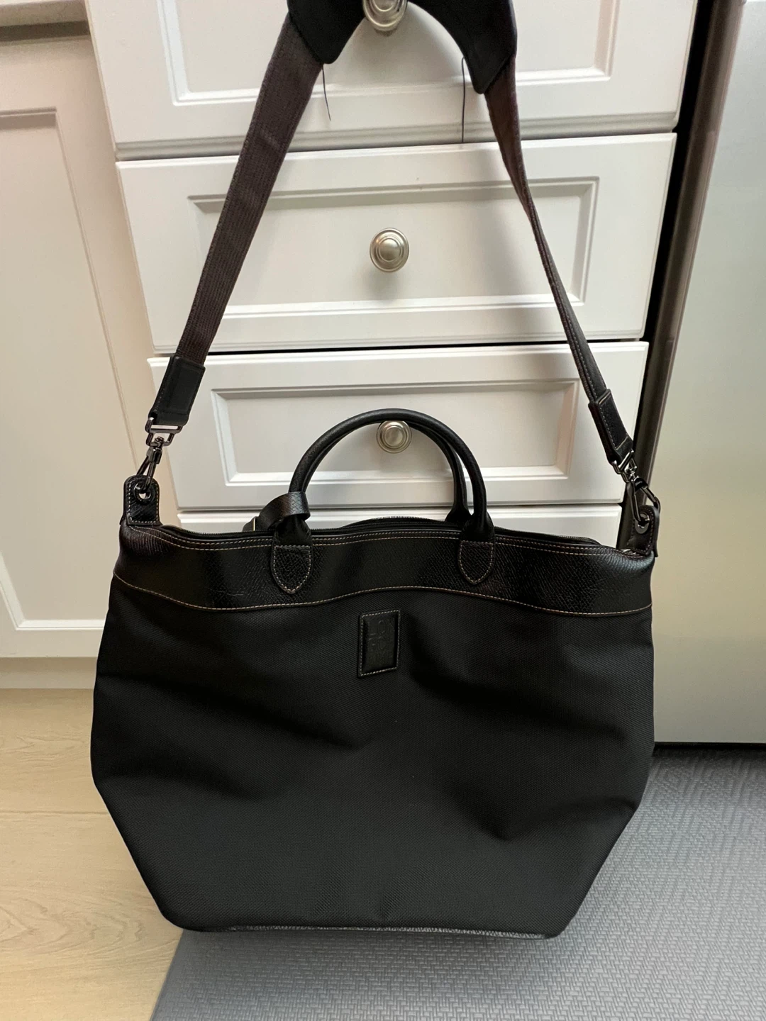 * Durable Materials: Crafted from black, textured canvas or nylon (recycled polyester) with genuine cowhide leather trim and top handles.