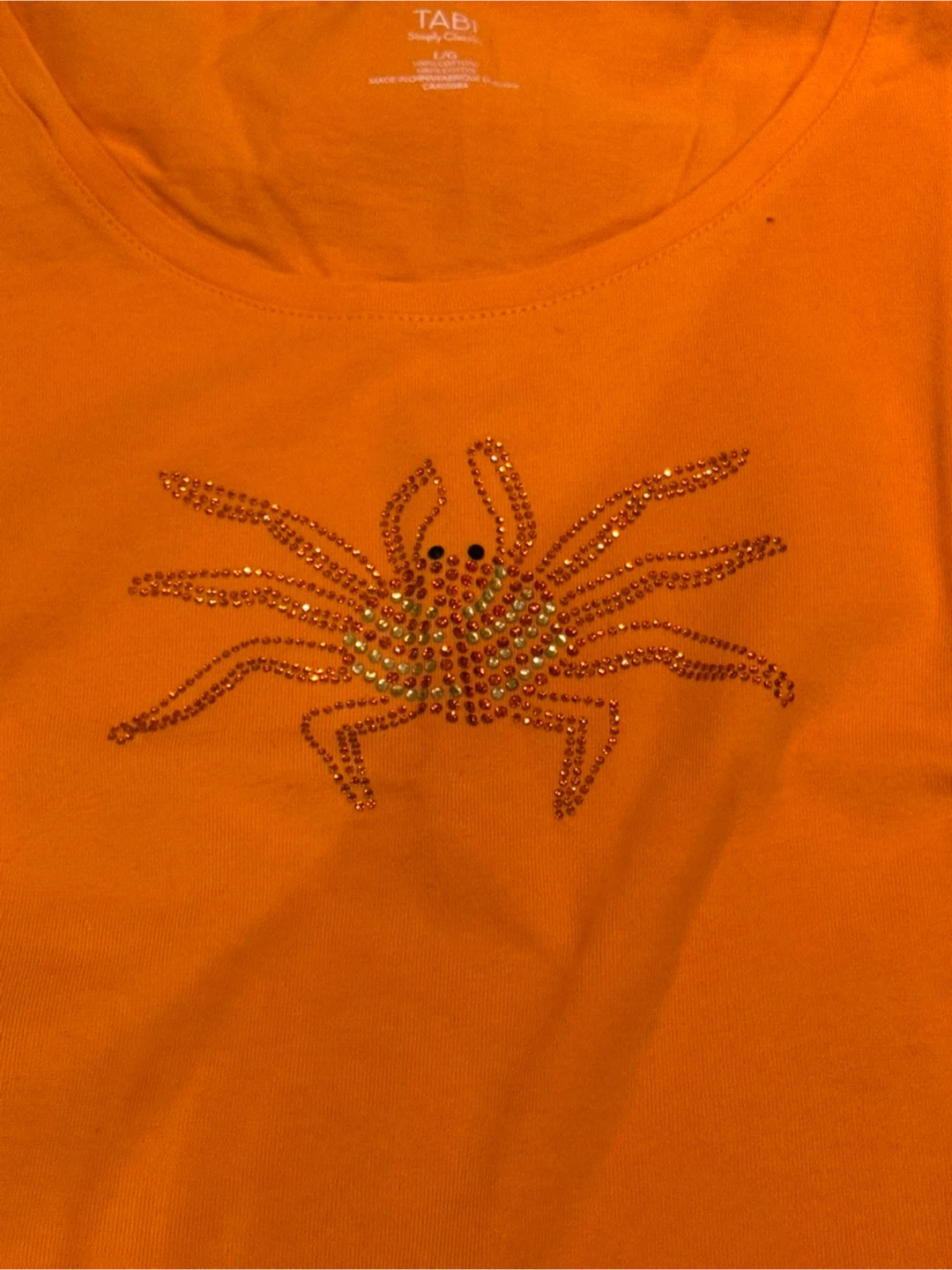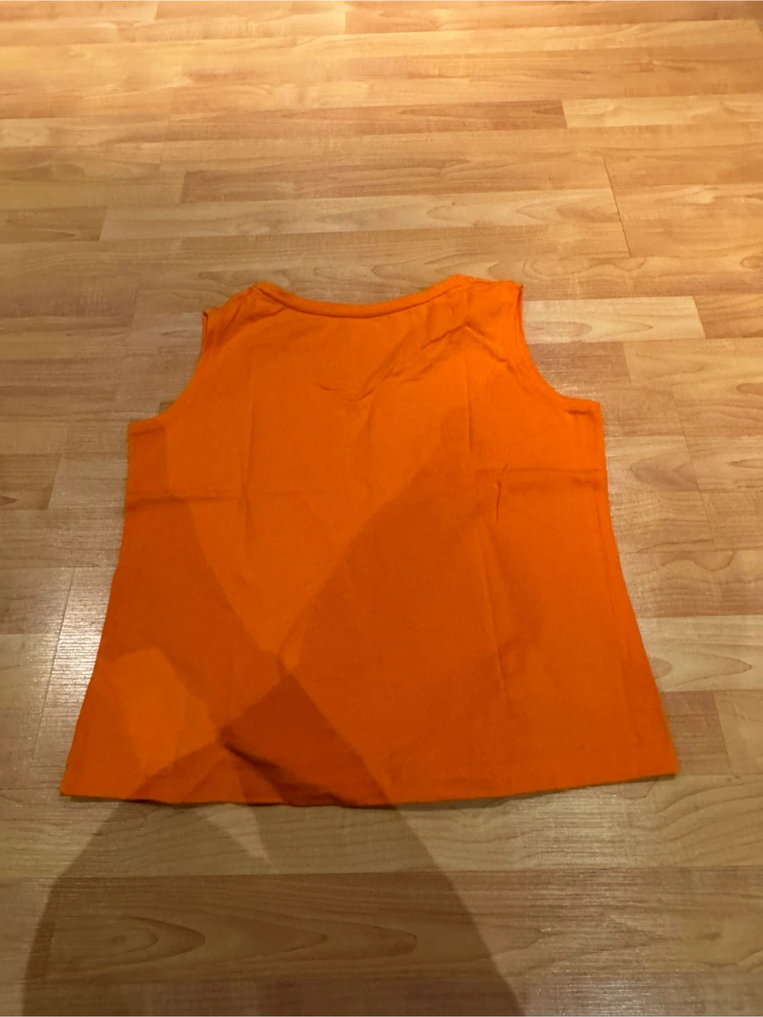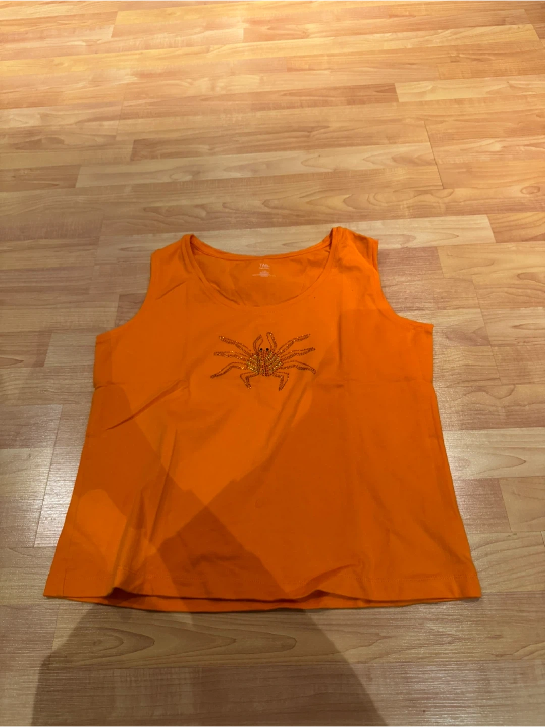 Here's a gently used orange tank top from TABI. It's a size large and features a fun, sparkly crav design on the front. Perfect for adding a pop of colour to your wardrobe!