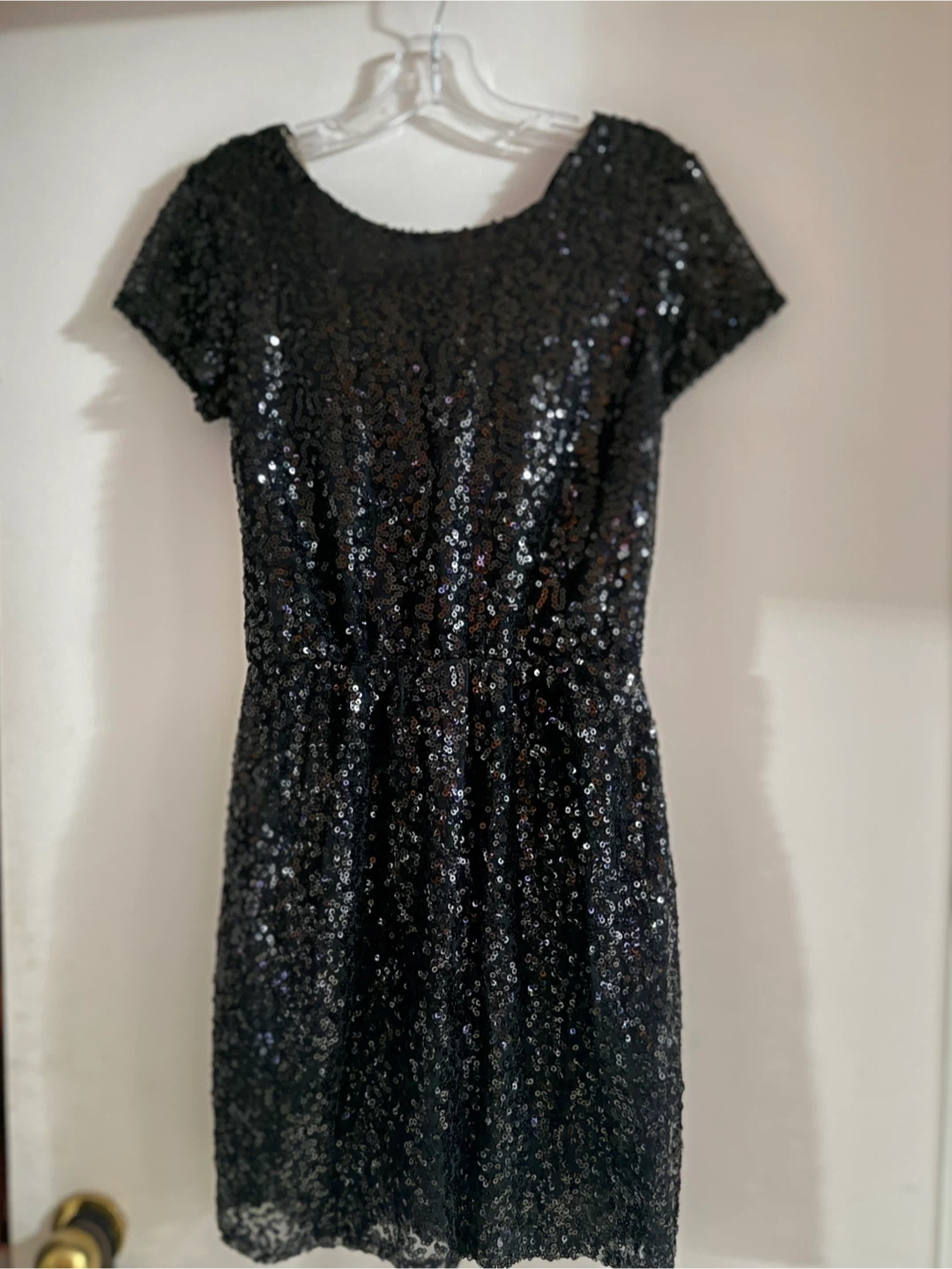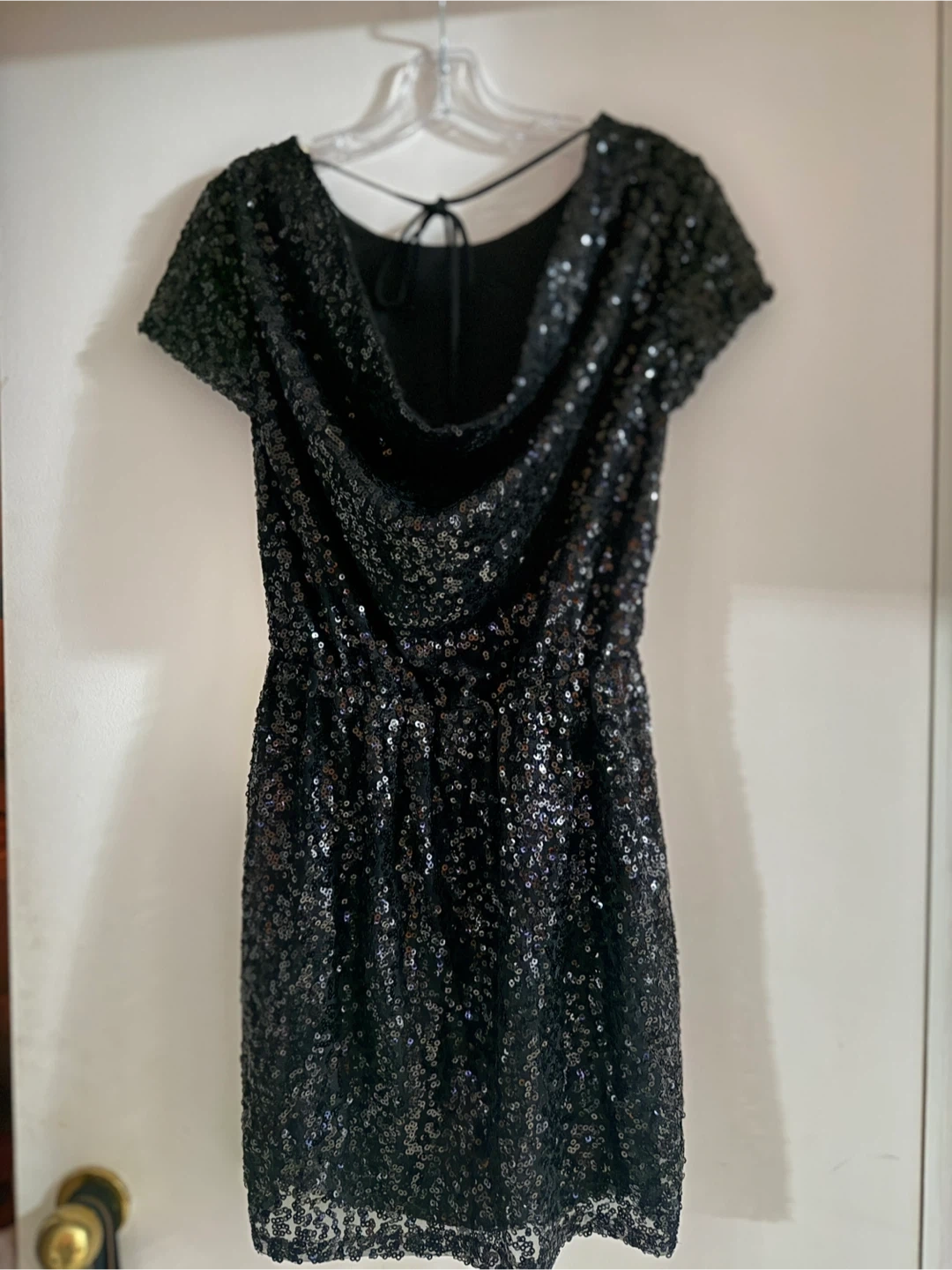 Selling a sparkly black sequin dress! It has short sleeves and a tie at the back. Perfect for NYE!