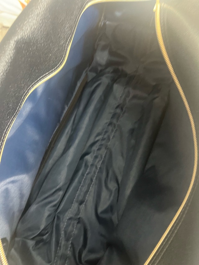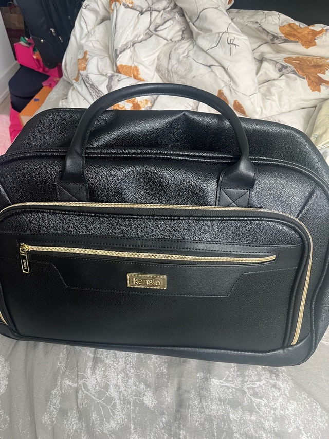 I'm selling a gently used Kensie carry-on luggage, perfect for short trips featuring a sleek black exterior with gold accents, a telescoping handle, and smooth-rolling wheels. The bag has some minor signs of wear, but it is in good condition and fully functional. Specifications: