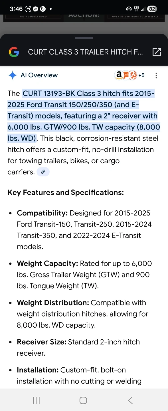 I'm selling a Curt Class 3 Trailer Hitch designed for Ford Transit 150, 250, 350, and E-Transit models from 2015-2025. This used hitch features a 2" receiver and is rated for up to 6,000 lbs gross trailer weight and 900 lbs tongue weight. It's also compatible with weight distribution hitches, allowing for 8,000 lbs WD capacity.