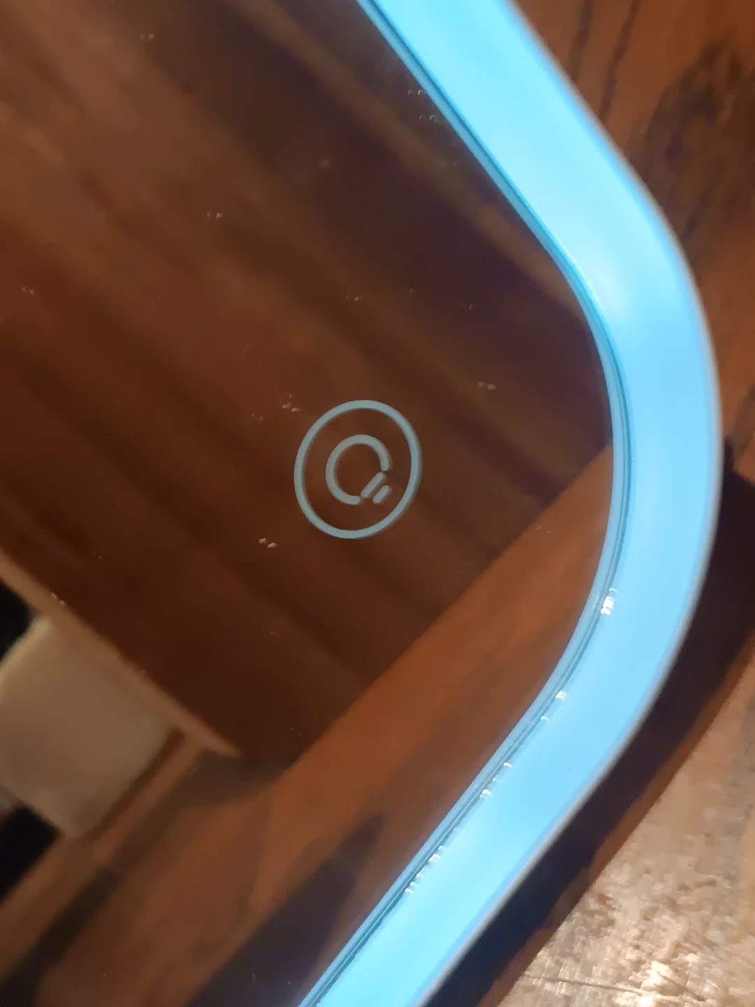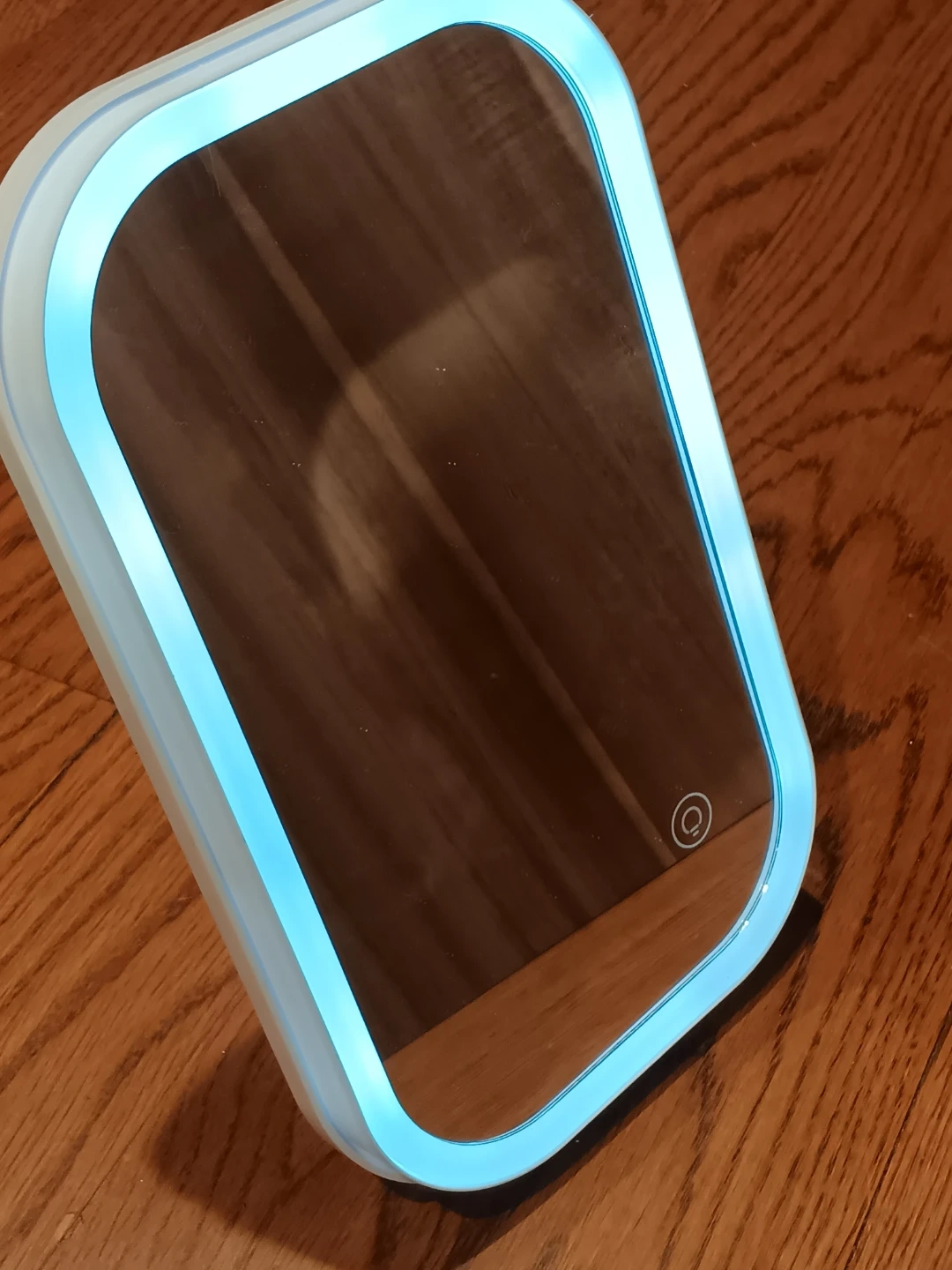 Here's an illuminated vanity mirror! It's in great condition and ready to use. Circle at the bottom right corner turns on/off light. Lever in the back is the stand. Perfect for makeup application or just checking your look.