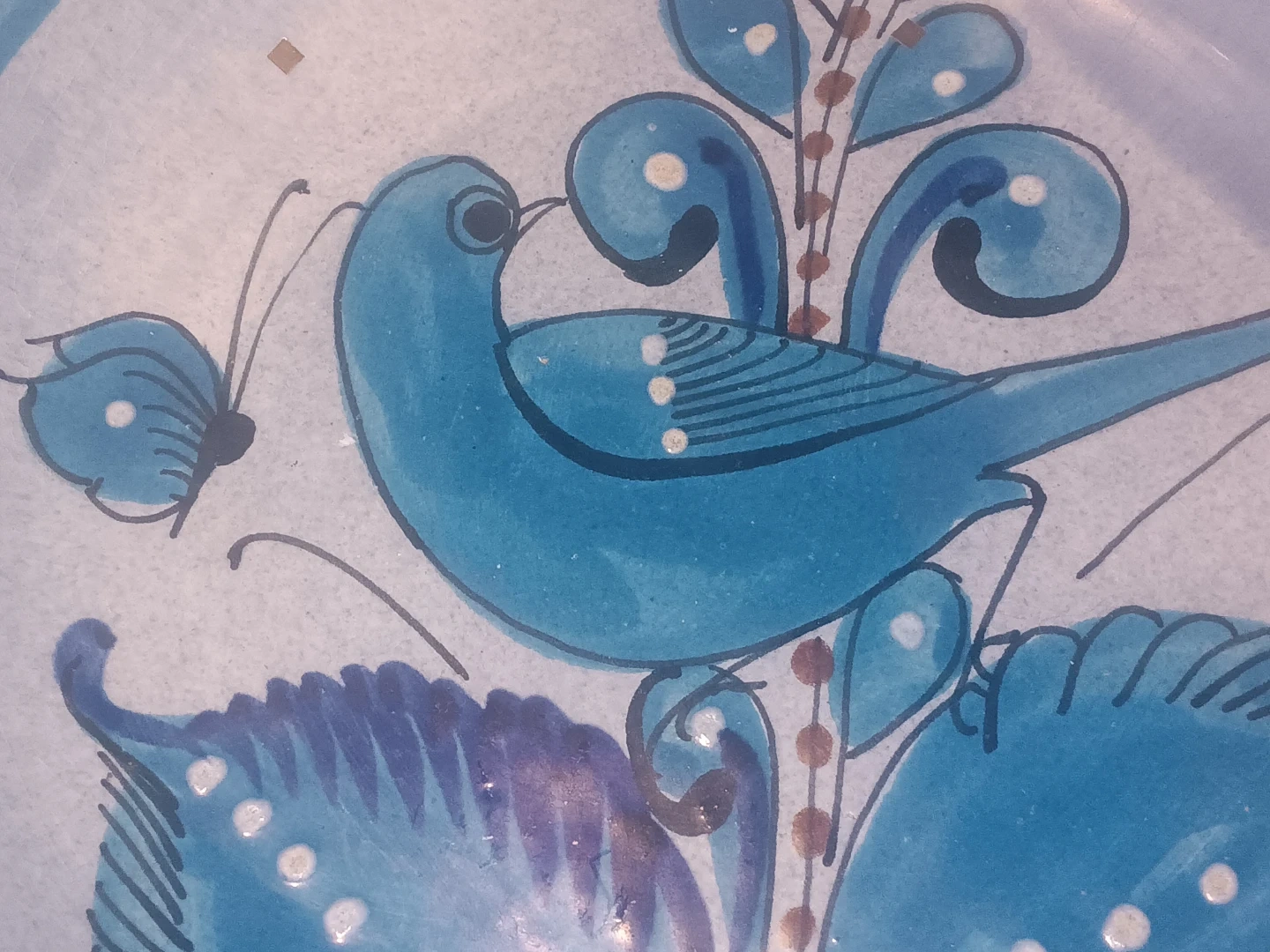 This is a beautiful, hand-painted bowl from Mexico! It features a lovely blue bird design. The bowl comes with its original box and packing material.