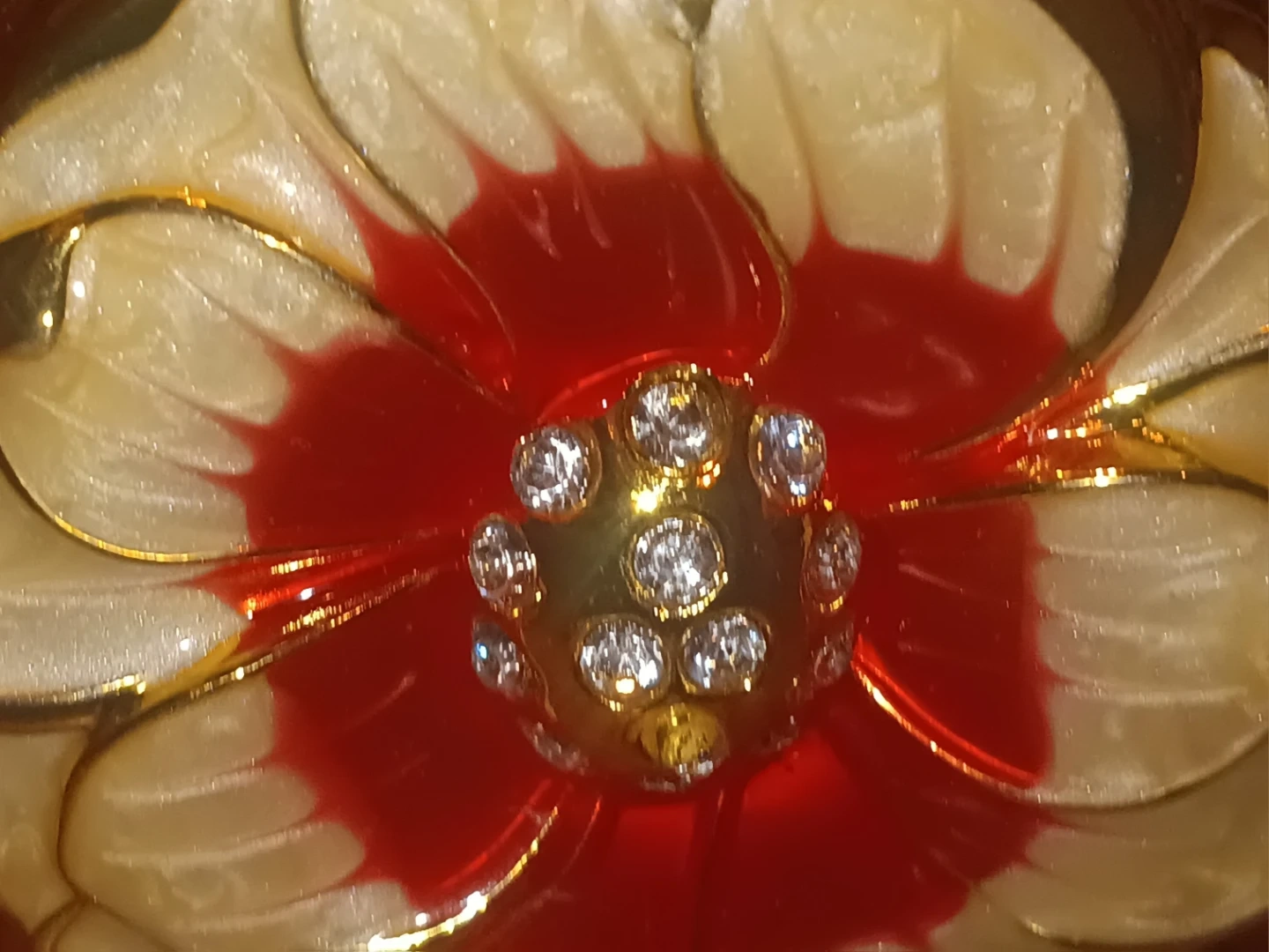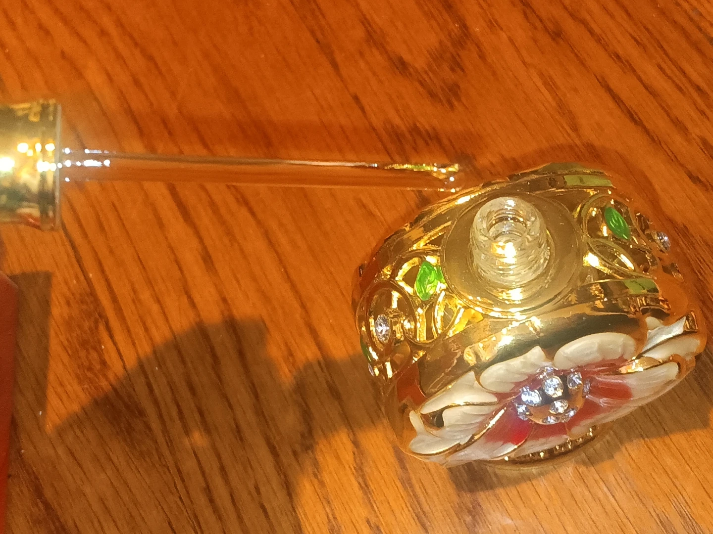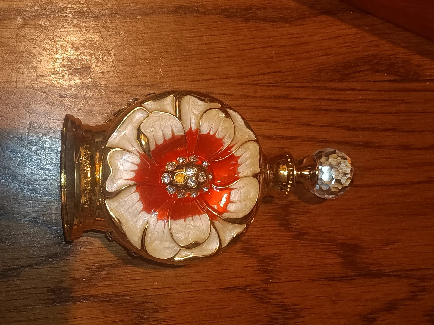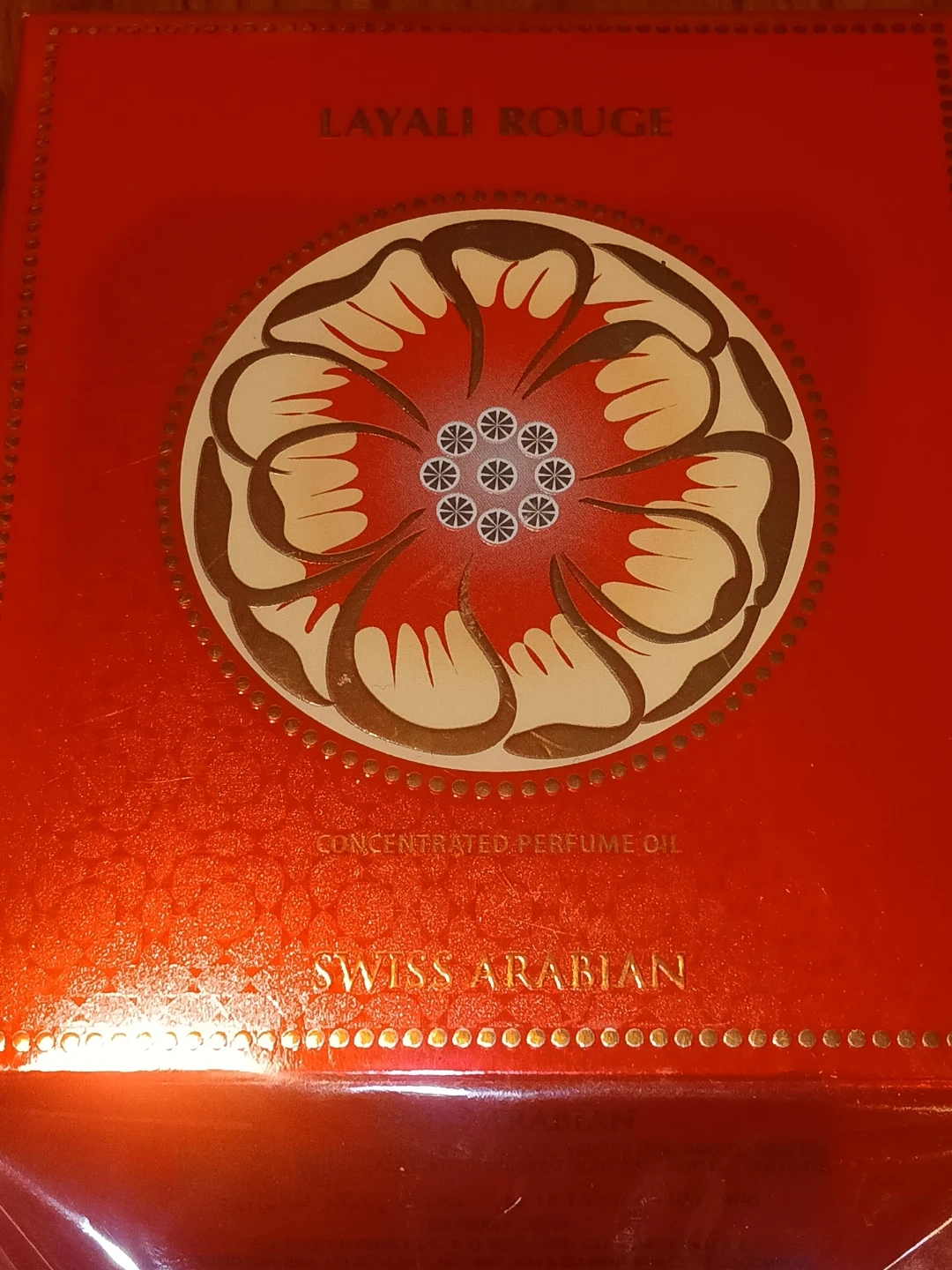 Selling a Swiss Arabian Layali Rouge concentrated perfume oil. It comes in a beautiful decorative bottle with a crystal-like top. The bottle is adorned with a flower design featuring red and white petals and sparkling accents. It also comes with the original box! 15ml. Made in U.A.E