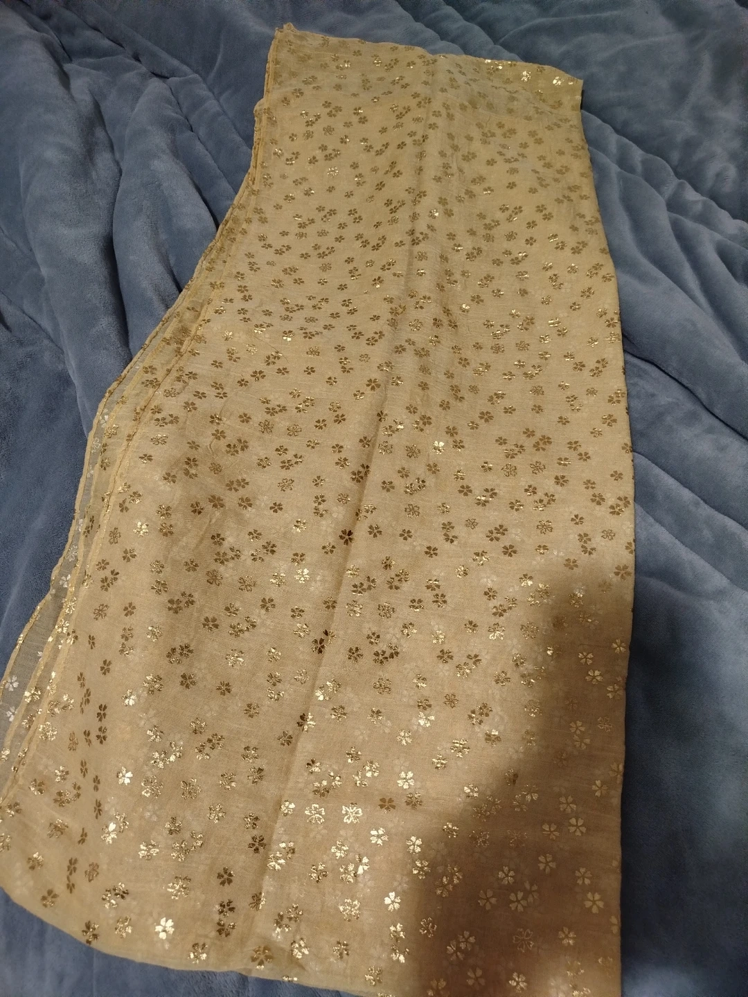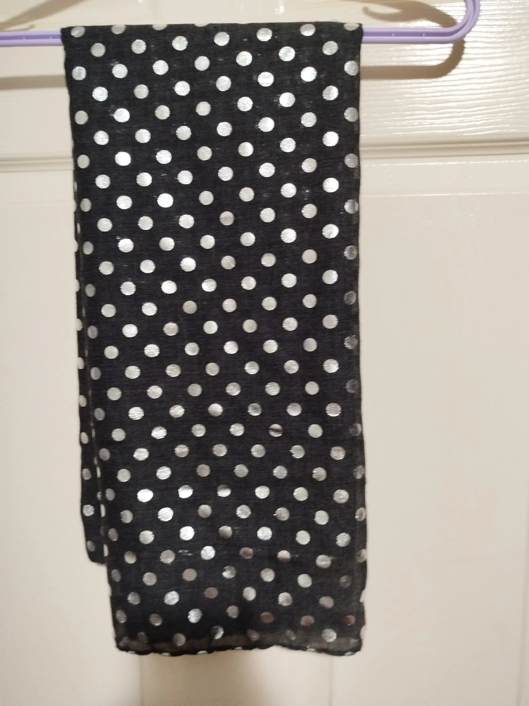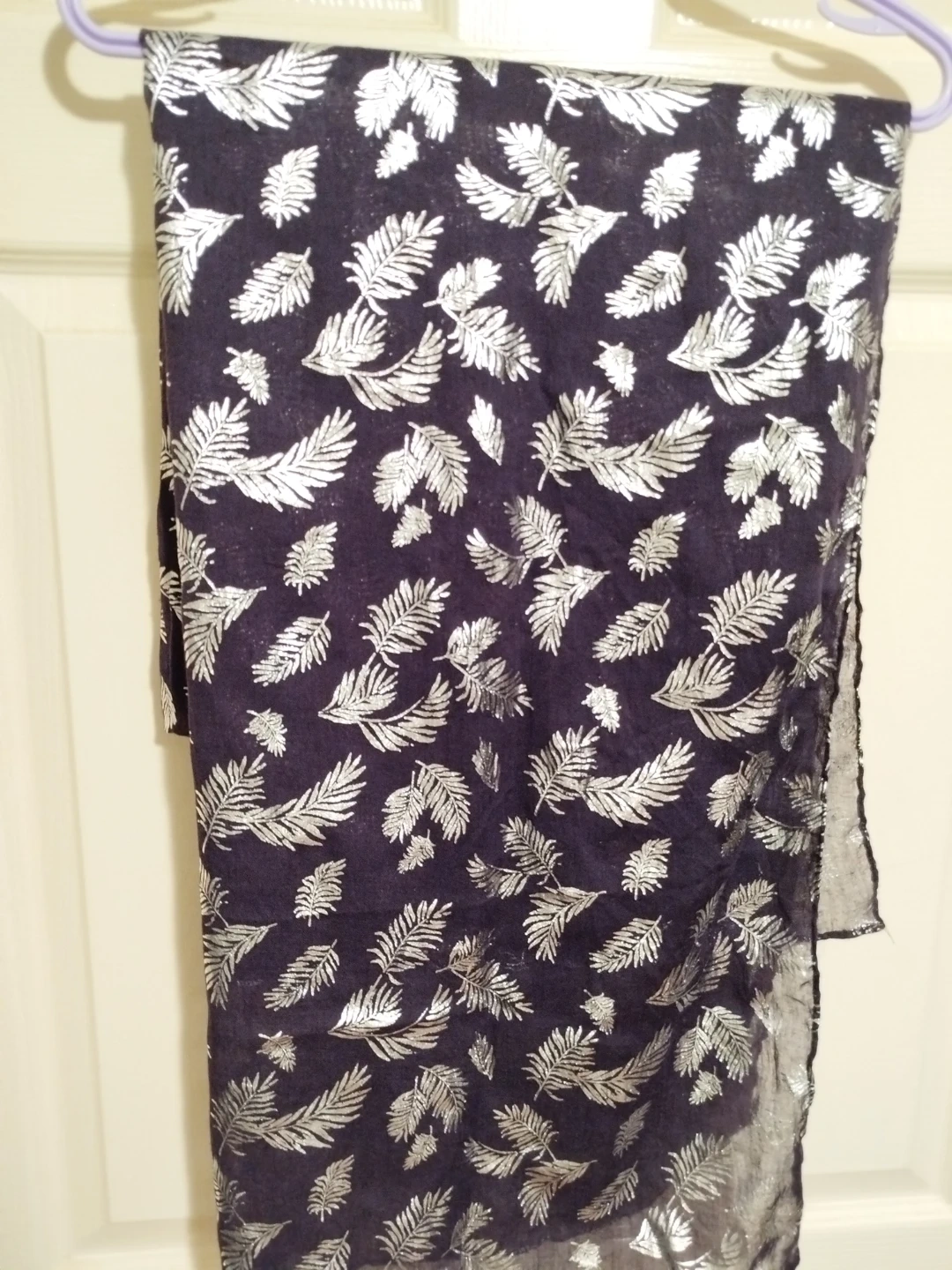Selling a few scarves with different patterns. There's one with silver leaves on a dark blue background, one with gold floral patterns on a beige background, and one with silver polka dots on a black background. They're all in great condition!