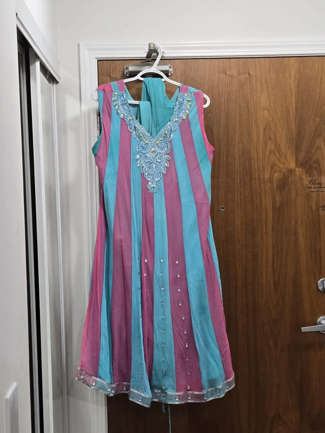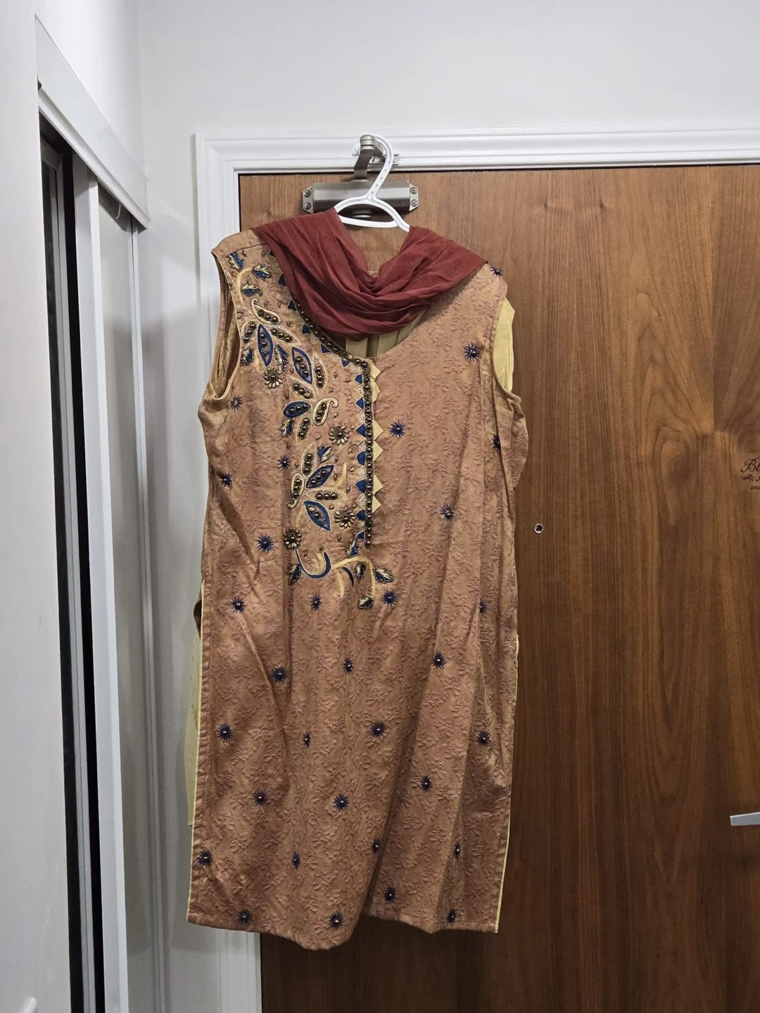 Selling a beautiful salwar kameez set. It's in great condition and perfect for special occasions! The set includes a kameez (tunic), salwar (pants), and dupatta (scarf).