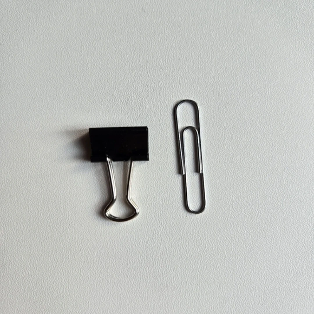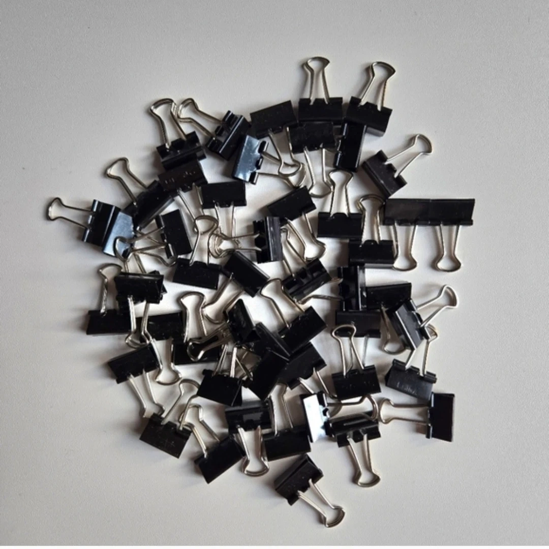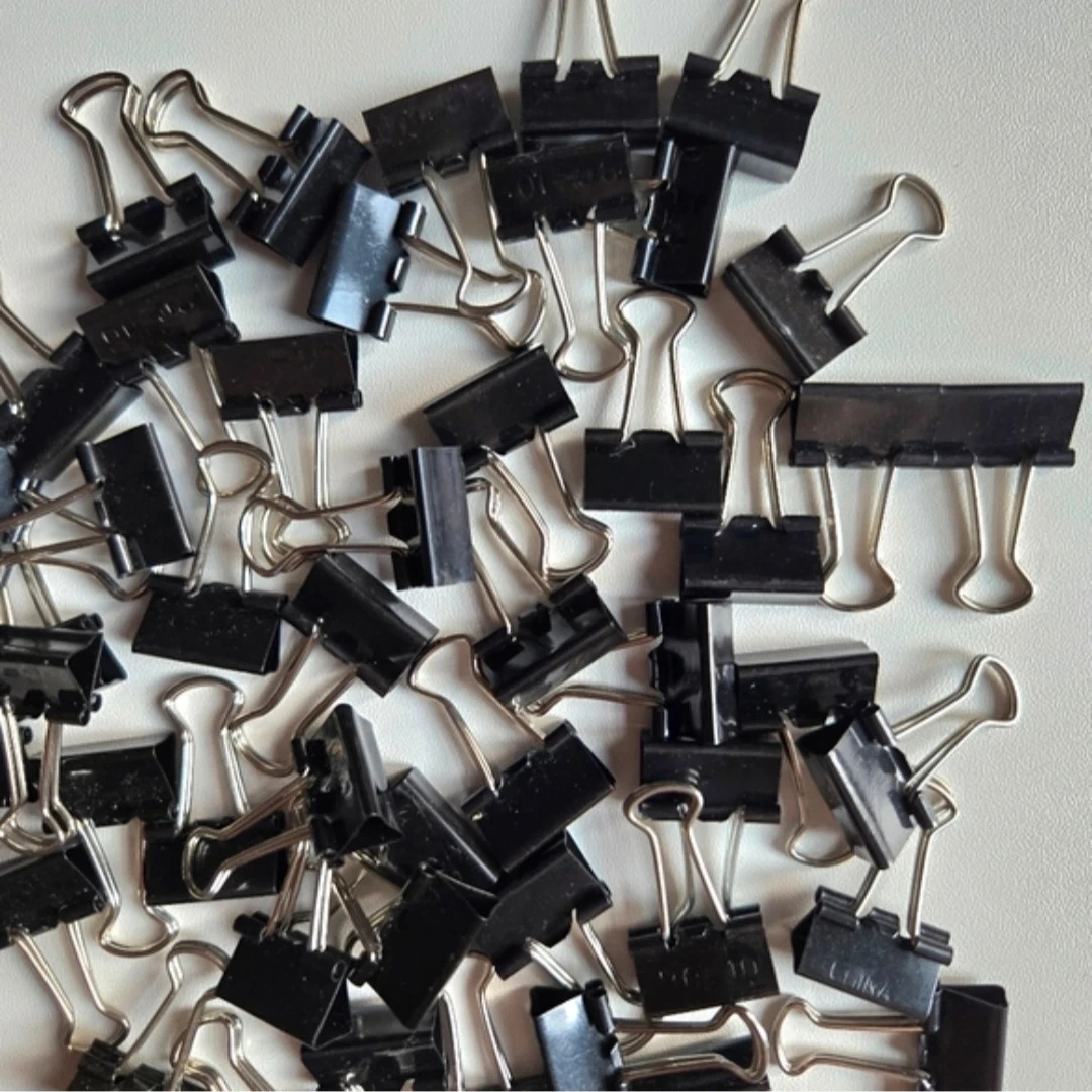 Set of 50 mini black binder clips with metal handles. All in the picture. Perfect for organizing papers.