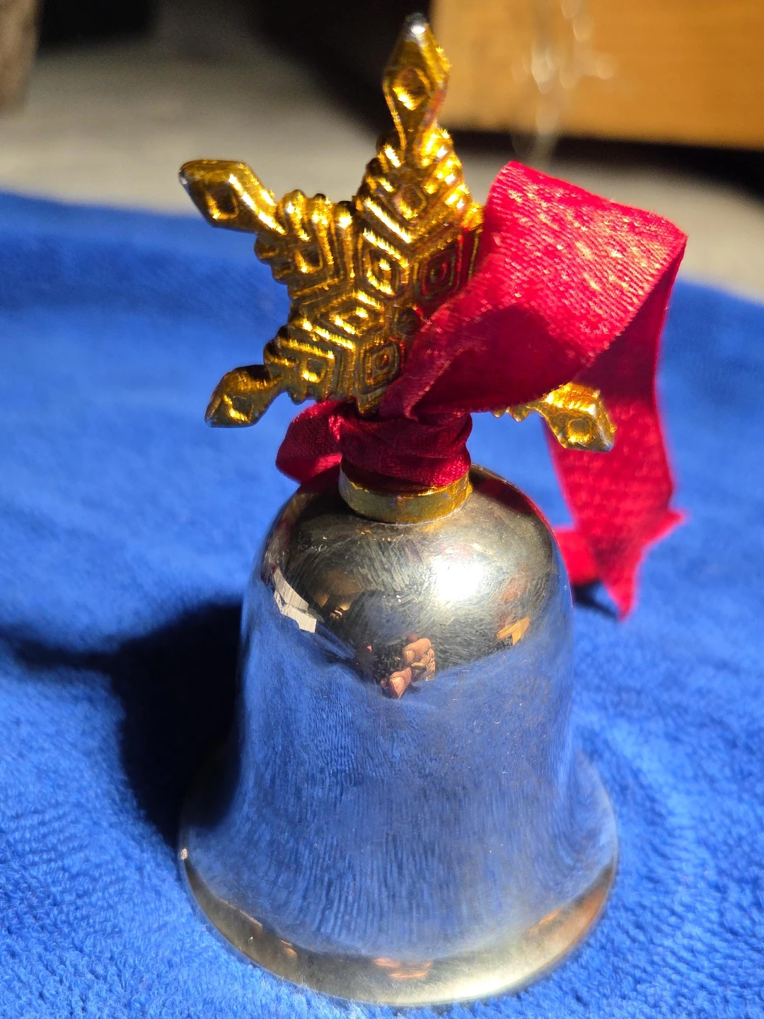 Here's a cute silver Christmas bell. It has a gold snowflake on top and a red ribbon around the neck. It's in good condition and ready to add some holiday cheer to your home