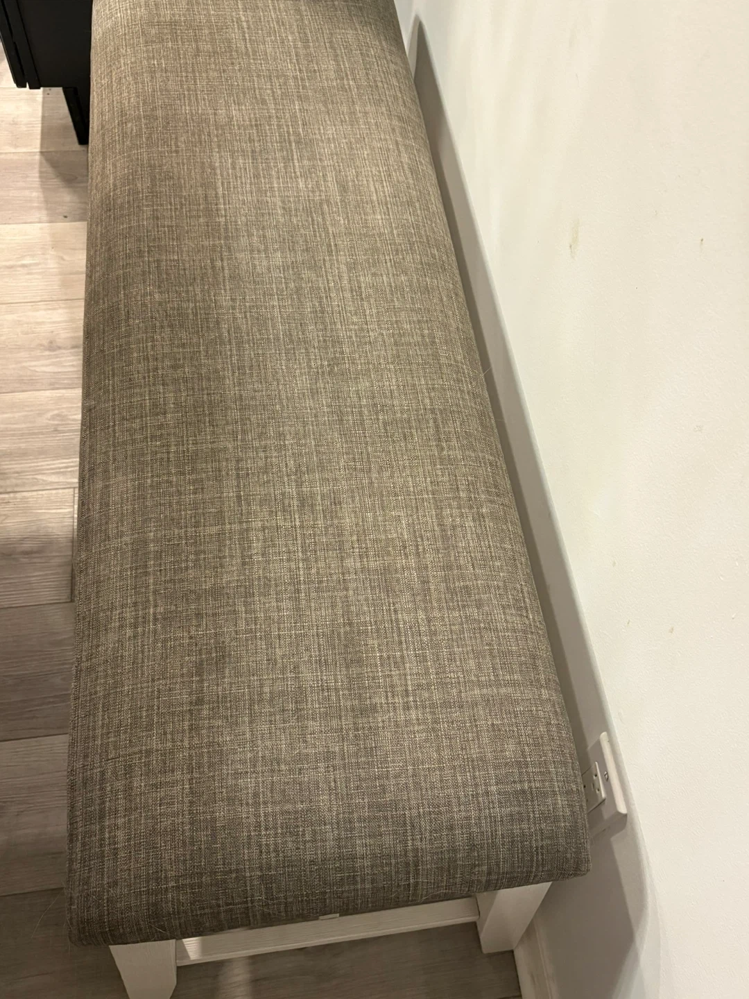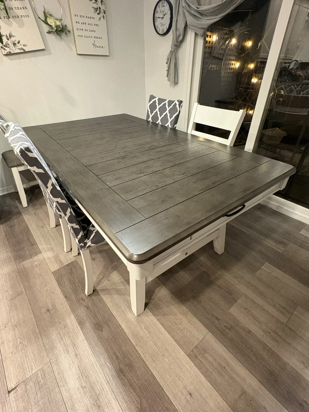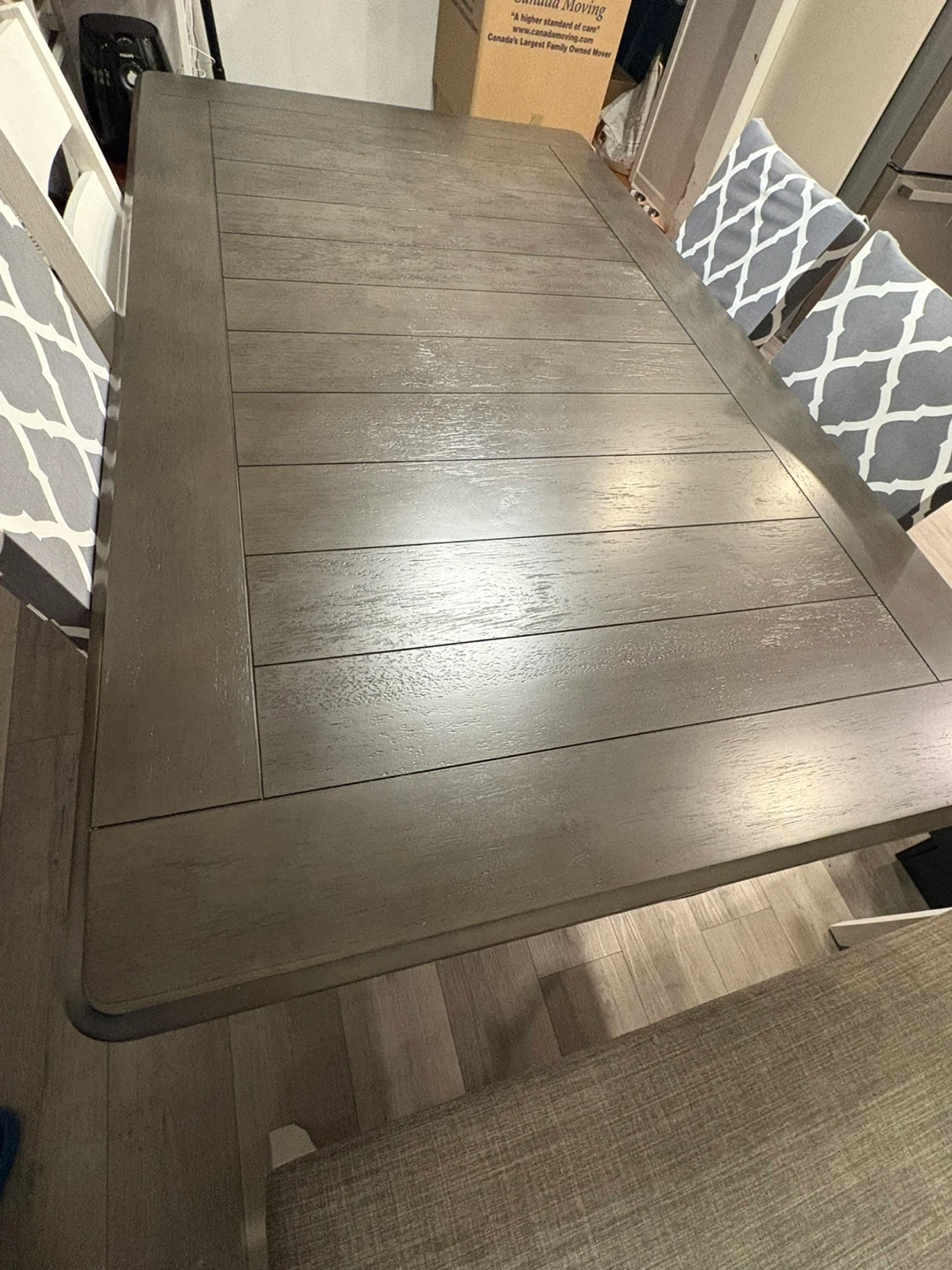 Selling a lovely dining table set that includes four chairs and a matching bench. The table has a beautiful wood-grain top with a sturdy base. The chairs are upholstered with a stylish grey and white pattern, and the bench is a neutral brown fabric. This set would be perfect for family dinners or entertaining guests!