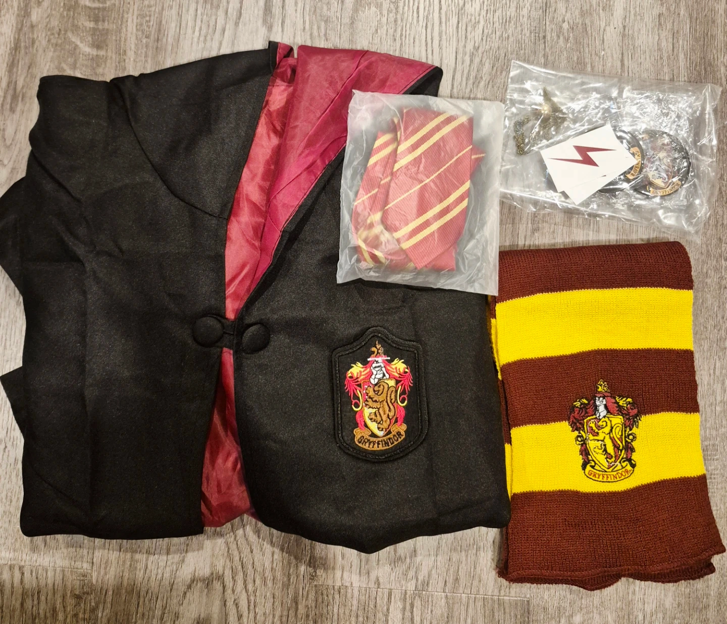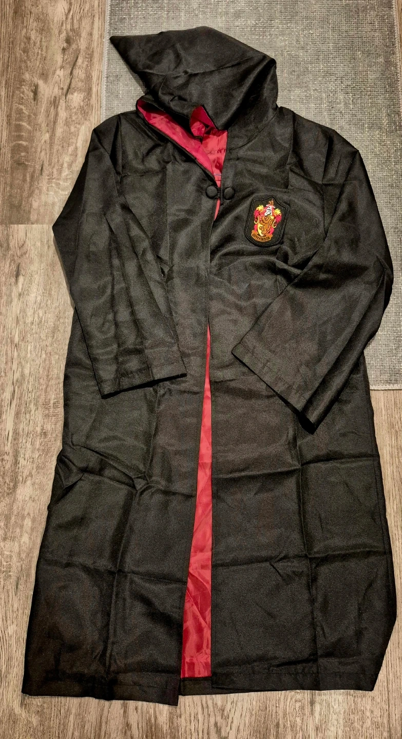 Wizard costume set, includes a robe, scarf, tie, hat, necklace and pins. Everyone wants to be a wizard, wear it, make your dream come ture. Never worn. Dress up as your favorite wizard for fun selfies and photo-shoots.
