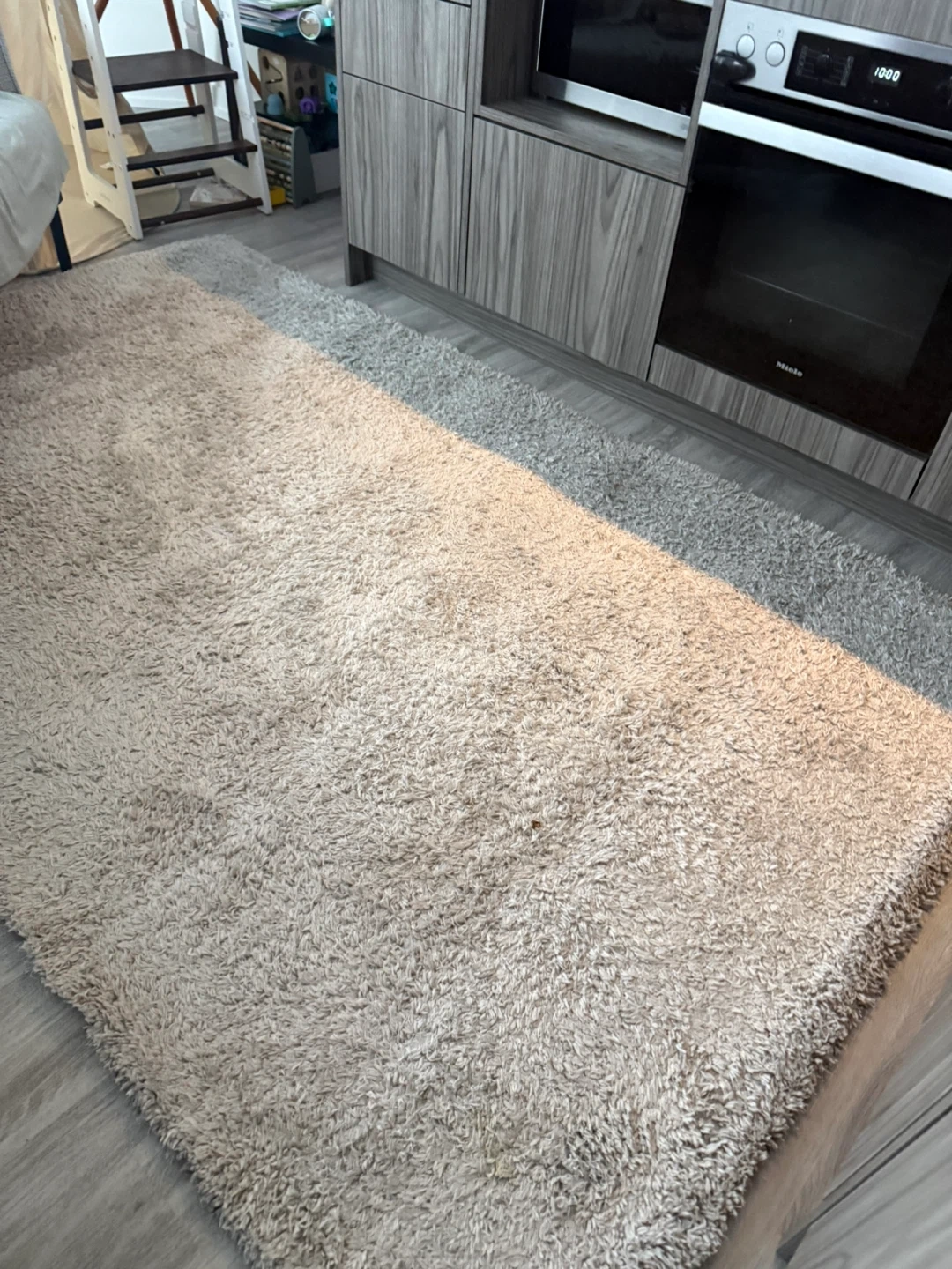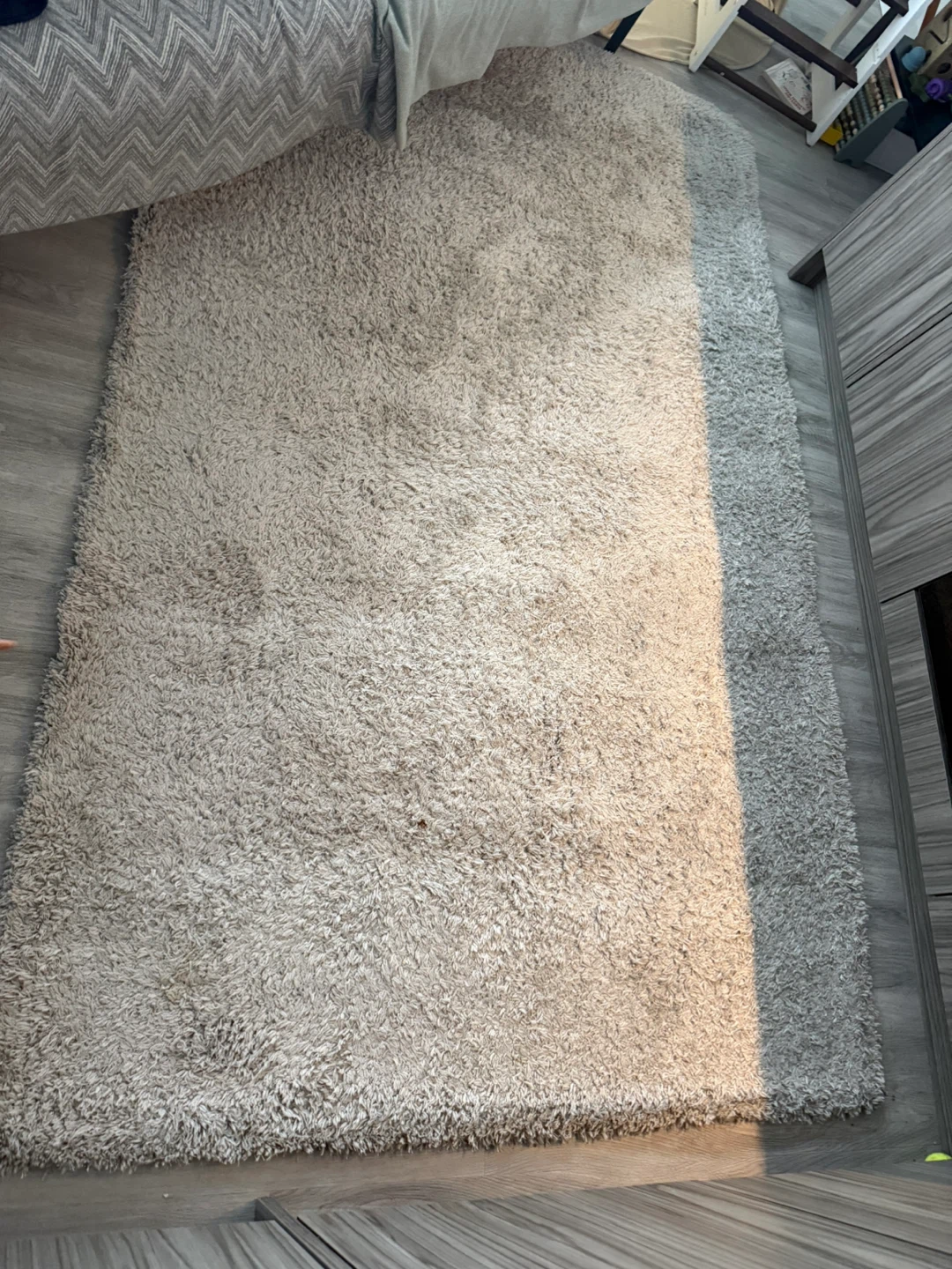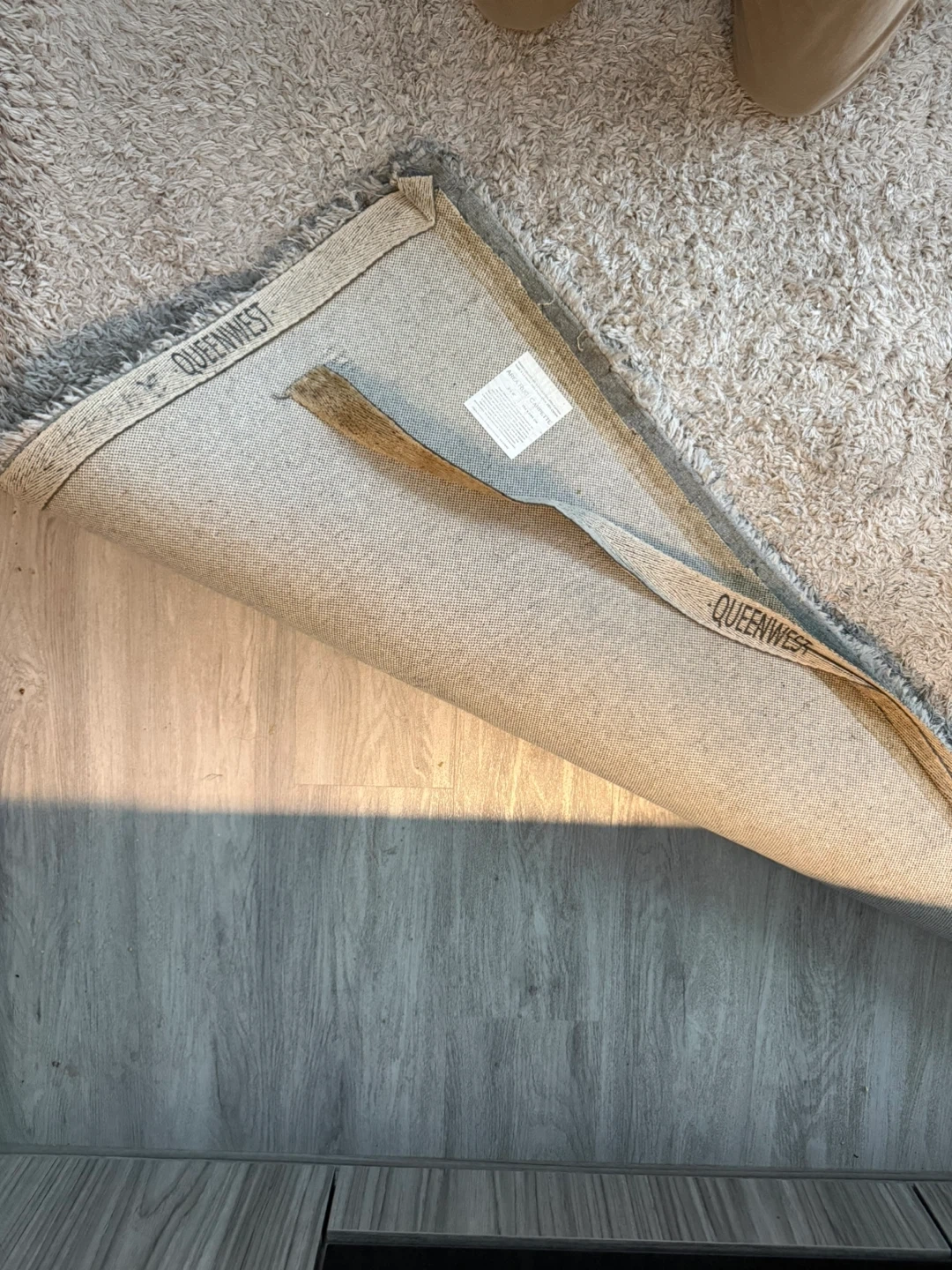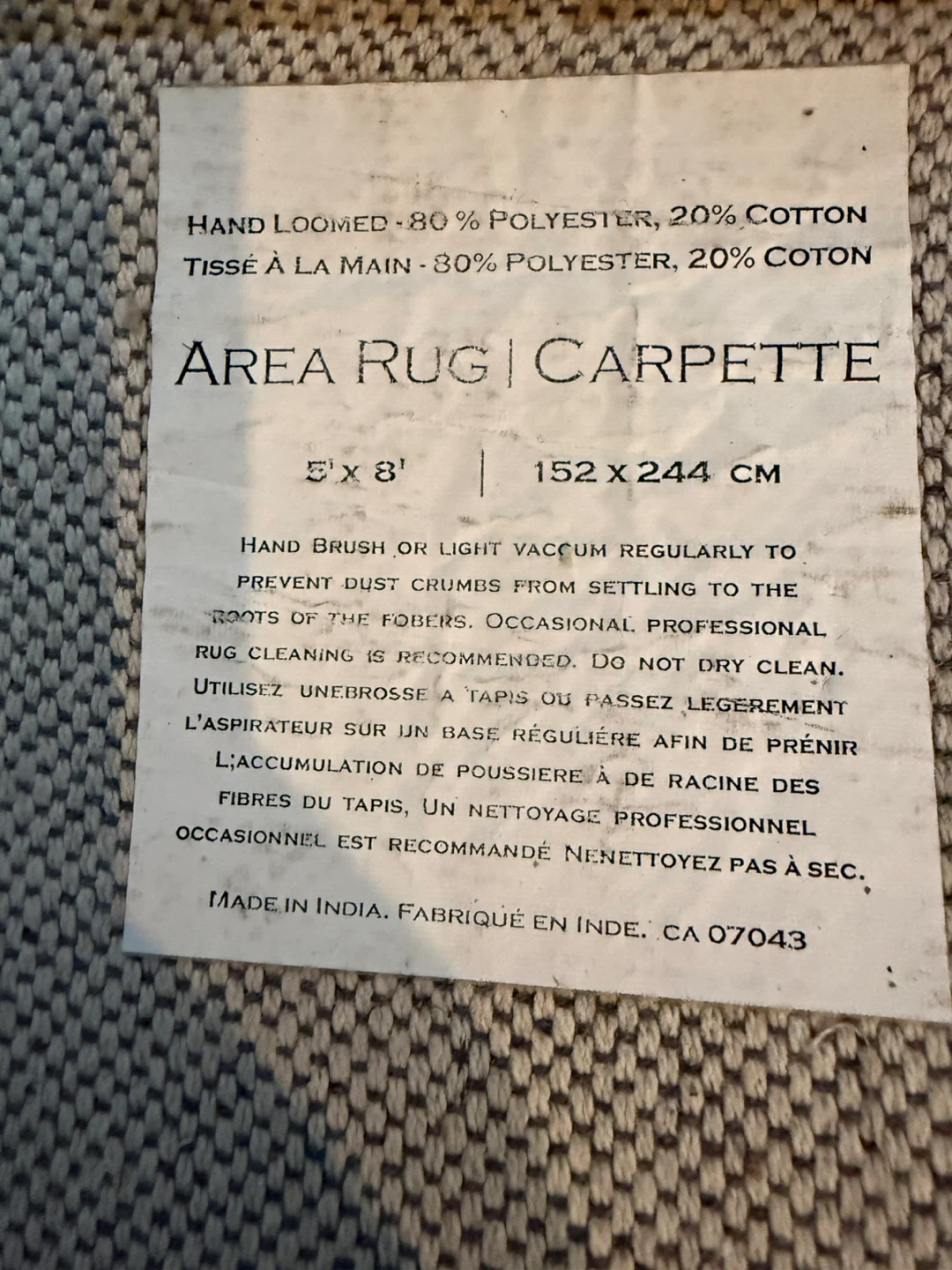 Selling a Queenwest area rug that's 5' x 8'. It's made from 80% polyester and 20% cotton. This rug is hand-loomed.