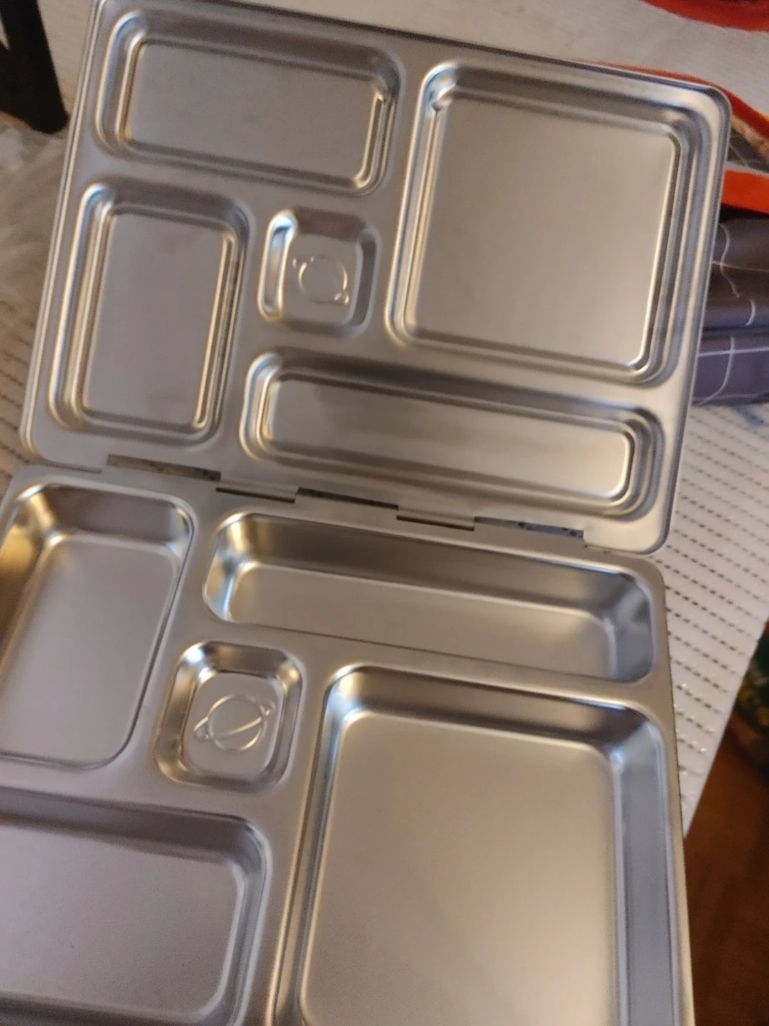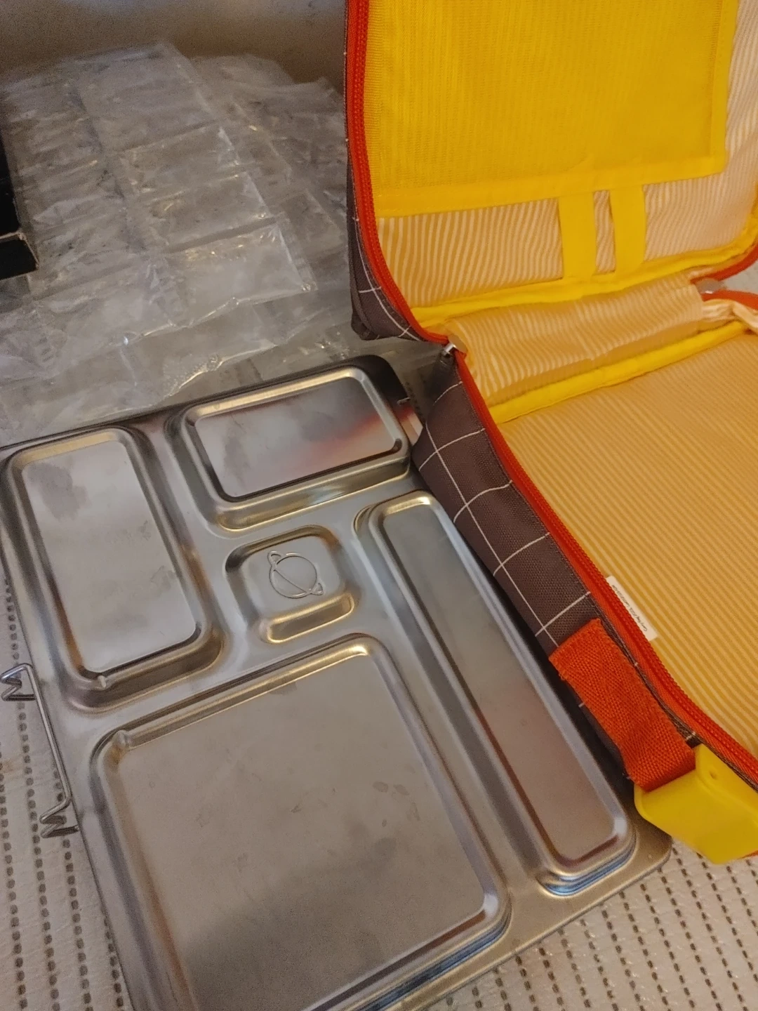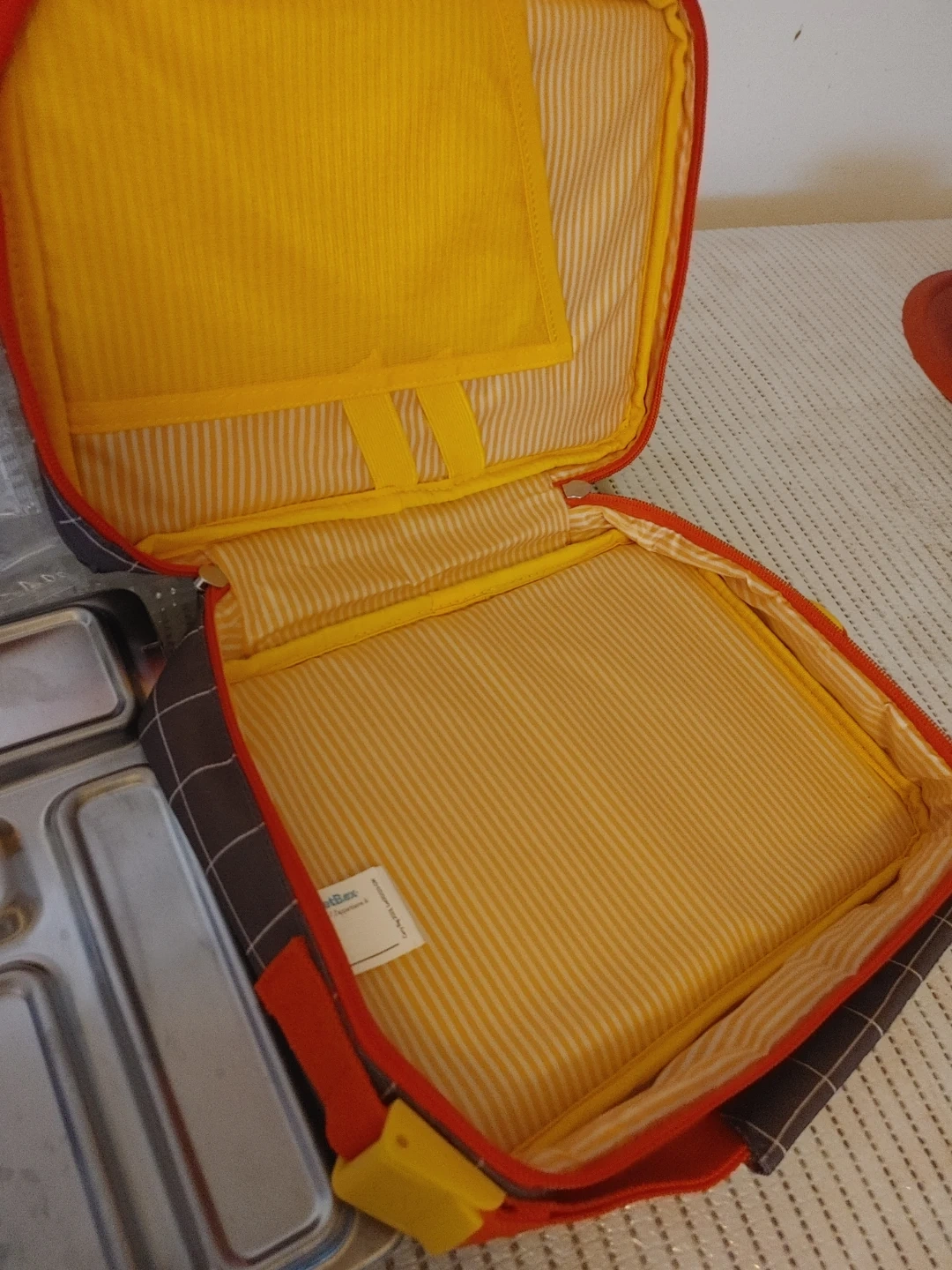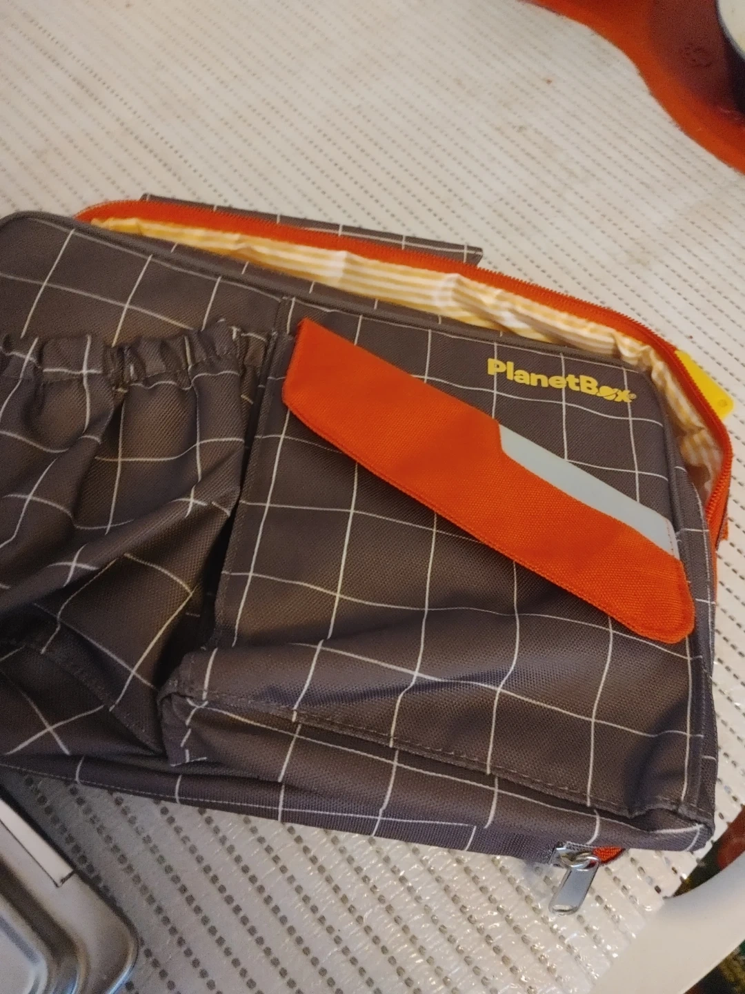 Selling a PlanetBox lunchbox, complete with its carry bag! It's perfect for packing lunches for school or work. The stainless steel container is divided into compartments, making it easy to pack a variety of foods. The bag is grey and white plaid with orange accents and a yellow interior. Aprox 11 x 8 XL 2