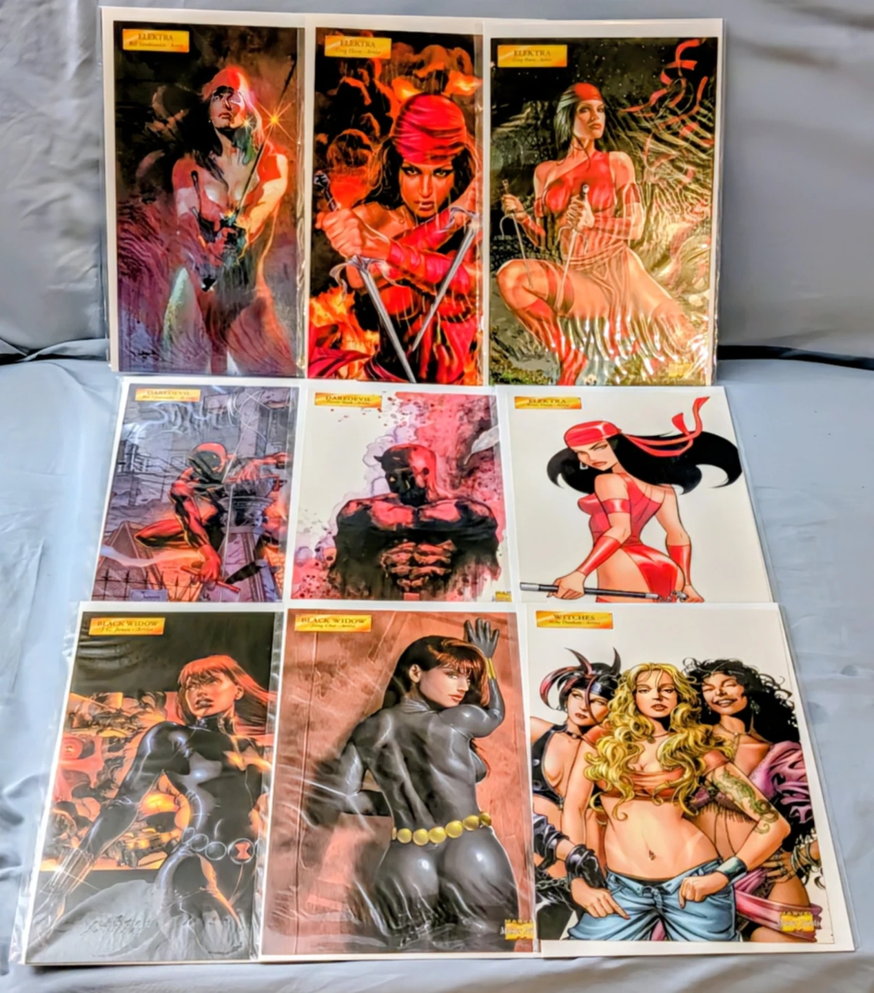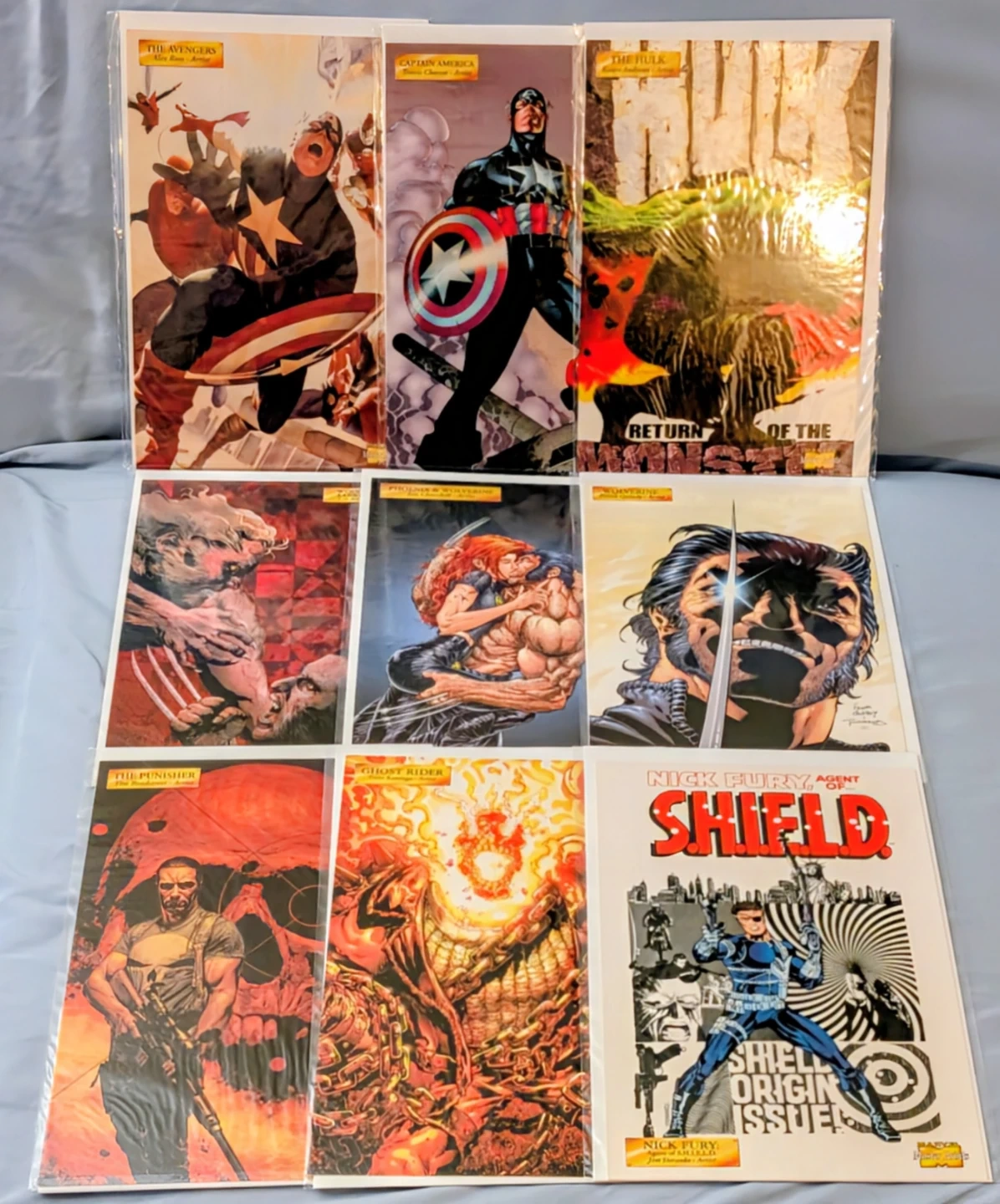 Selling a collection of Marvel comic art prints on glossy card stock. Prints are comic book size. This lot includes various titles featuring popular characters like Spider-Man, Daredevil, Rogue, Storm, Elektra, Black Widow, Captain America, Punisher, and Nick Fury. Great for any Marvel fan or collector! Cash only please.
