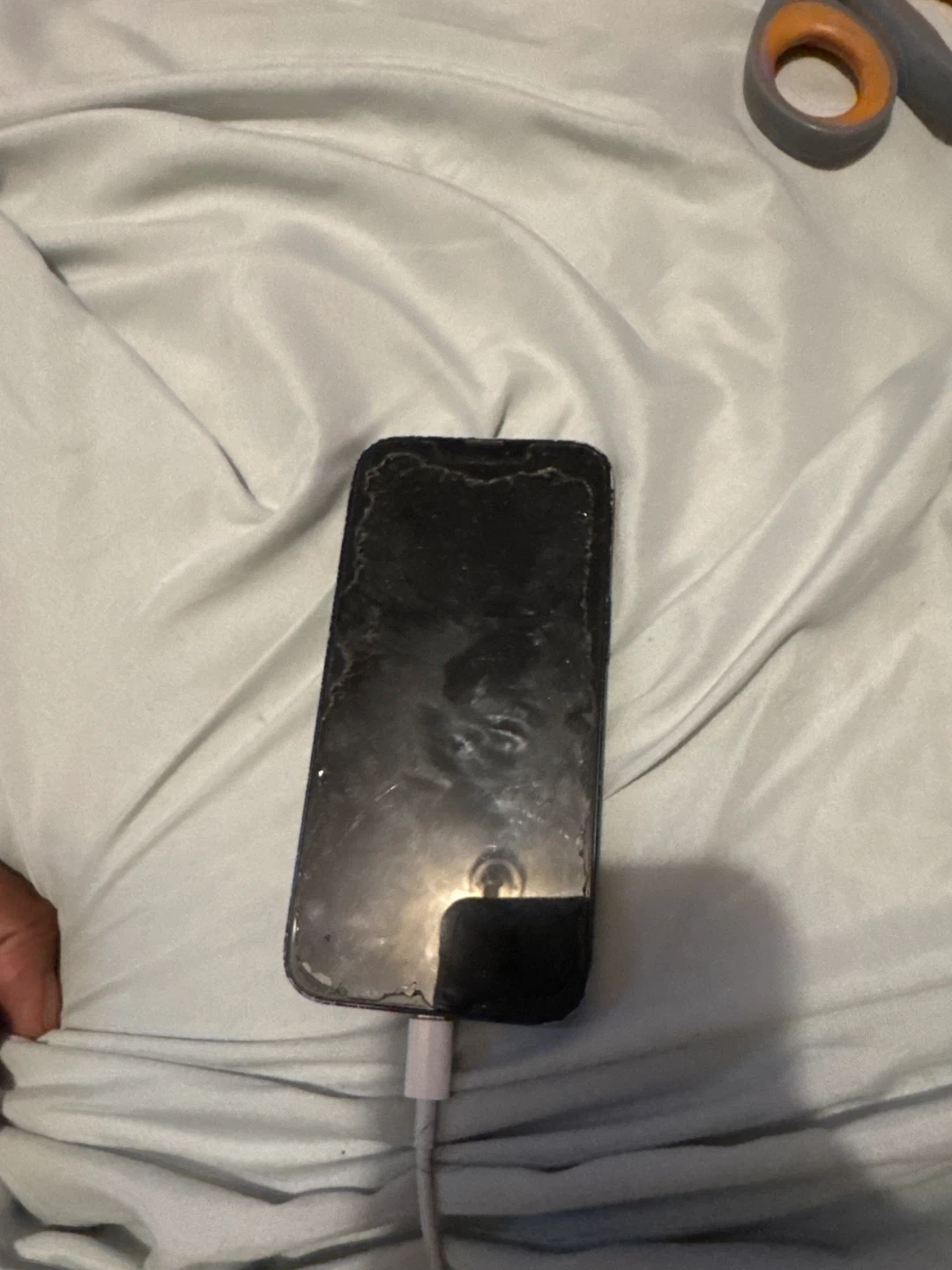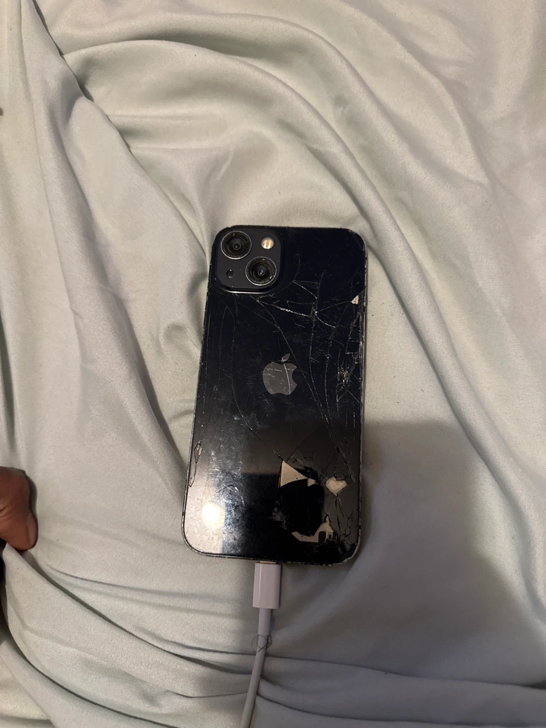 Selling a used iPhone 13. It's heavily damaged with cracks on the screen and back. Good for parts or repair if you're handy!still in working condition