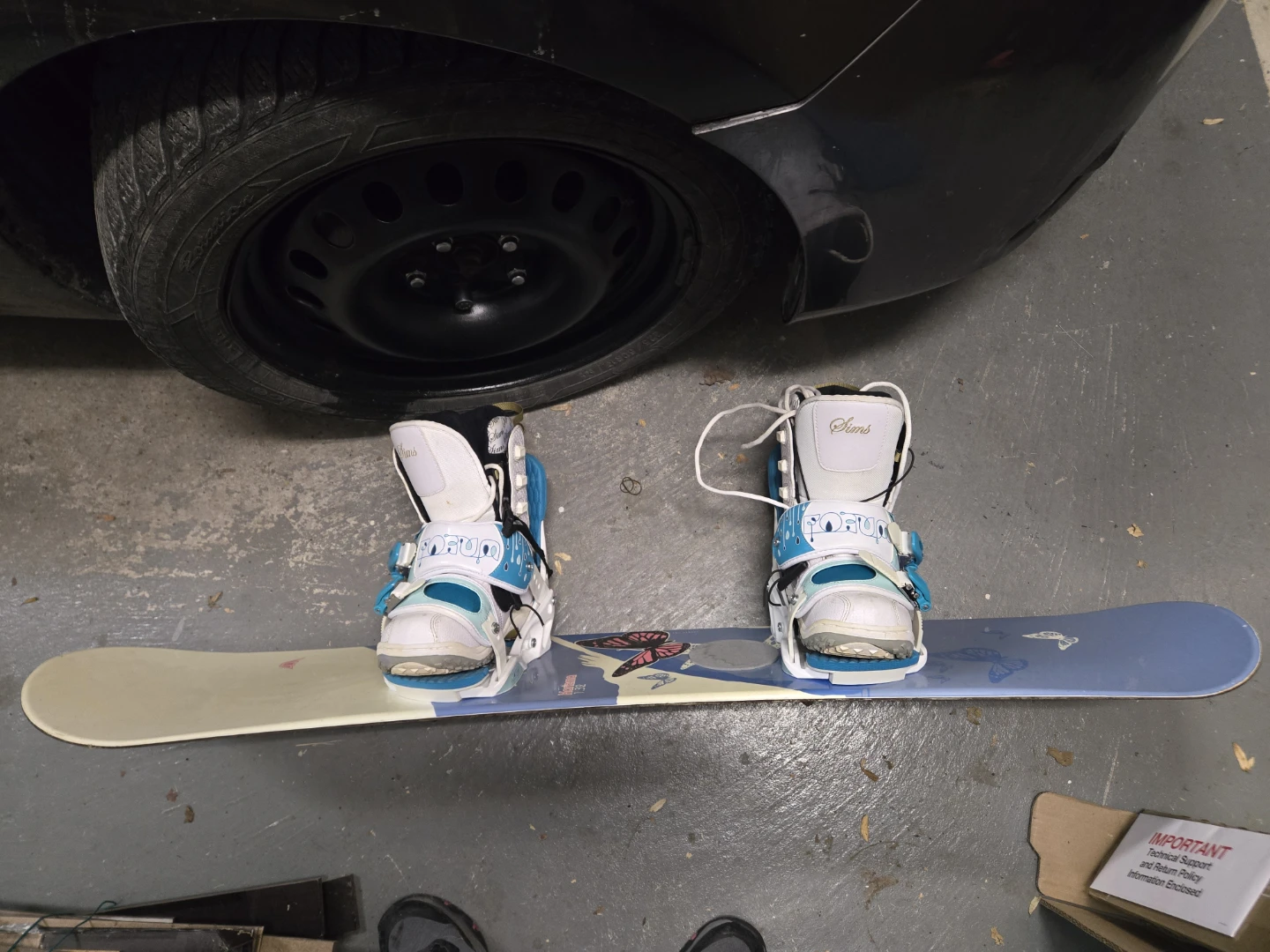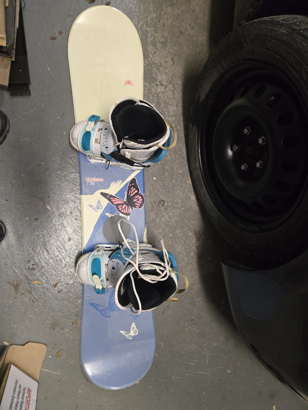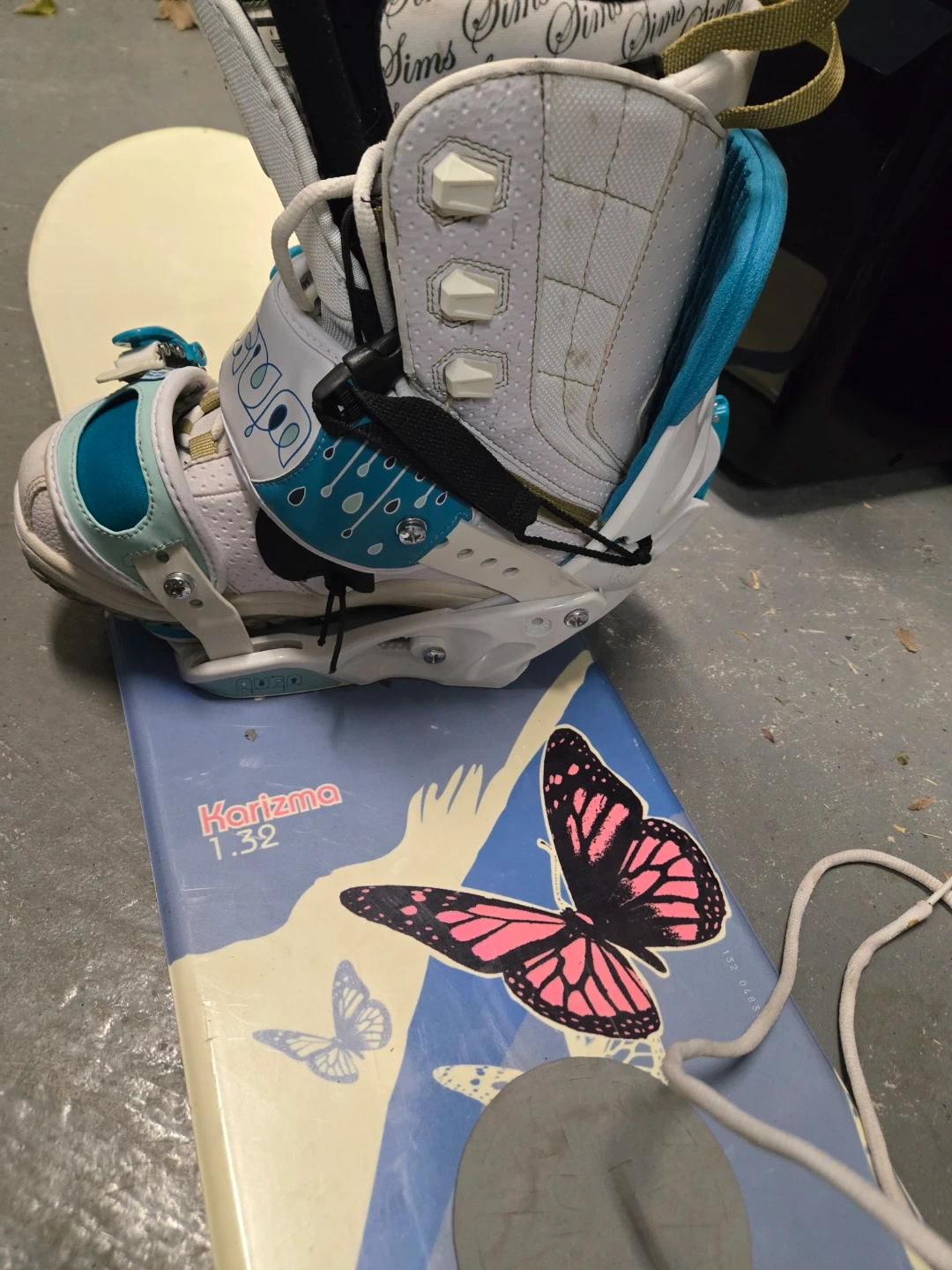 Selling a Sims Karizma 1.32 snowboard with Sims snowboard boots. The boots are a women's size 7 (US). Brand new installed bindings.