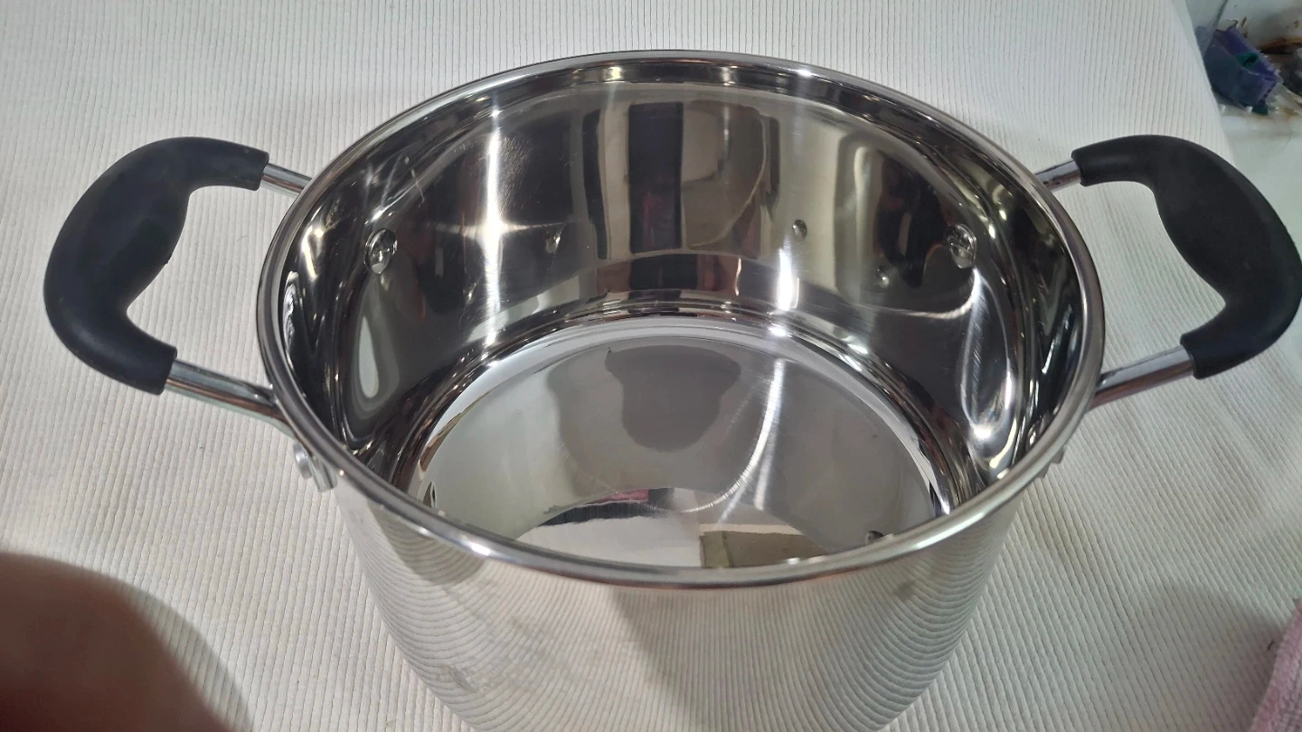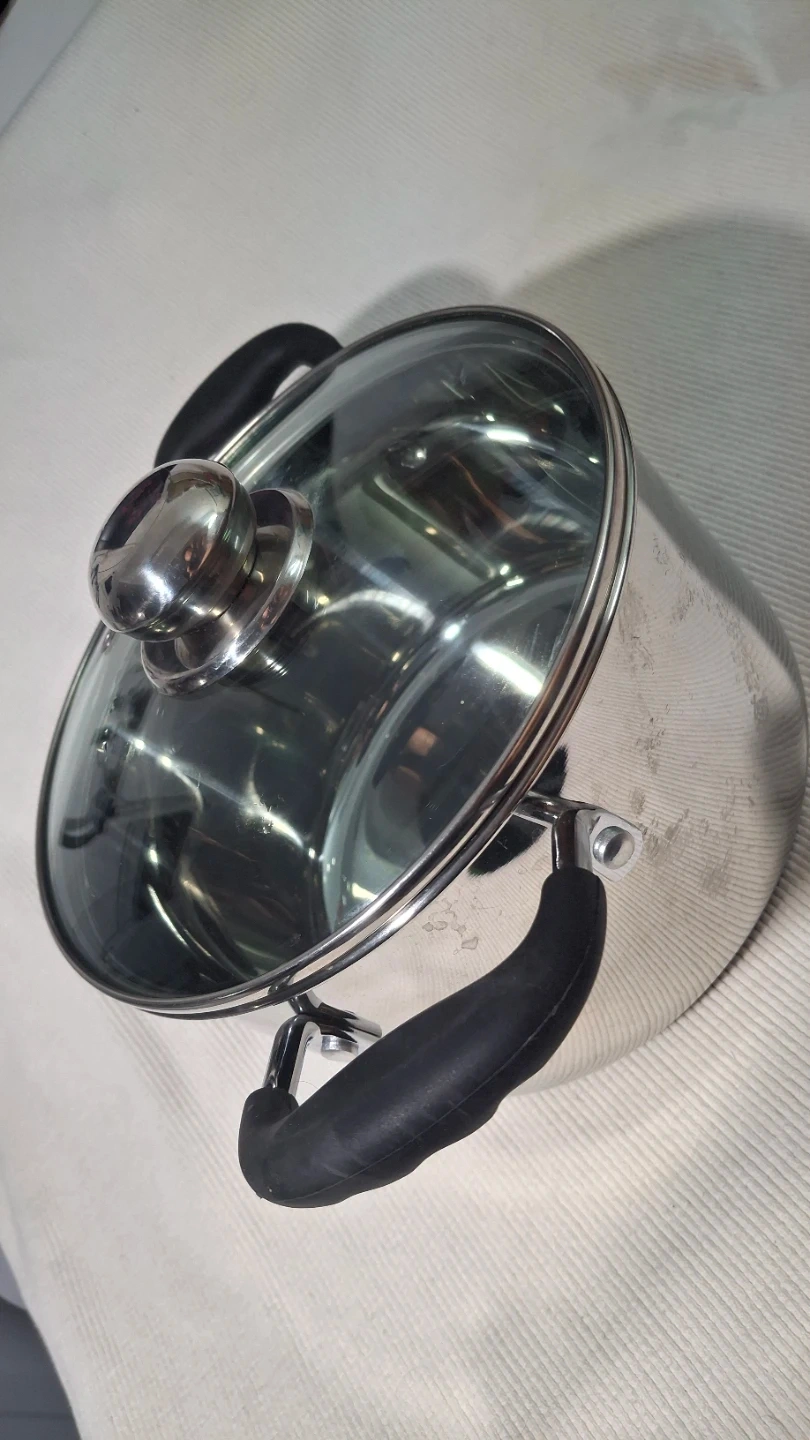 Selling a Cusina Classica stock pot made of 18/10 stainless steel. Thick bottom for induction stoves. It comes with a glass lid and black handles. Mirror finish