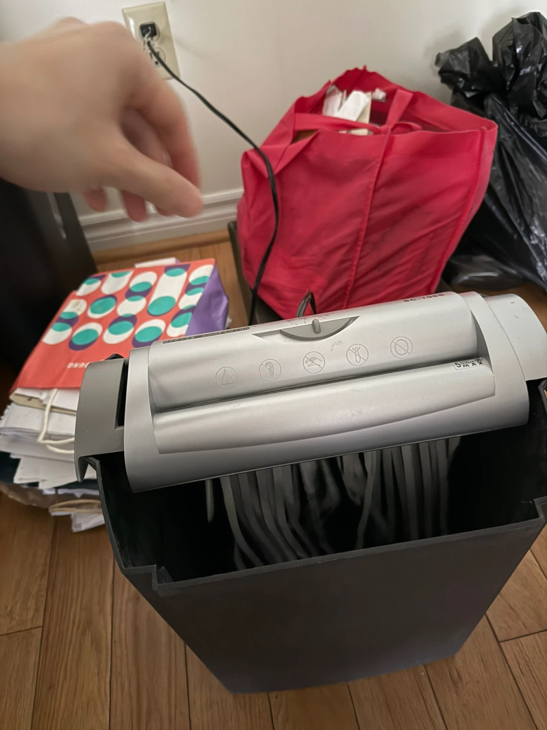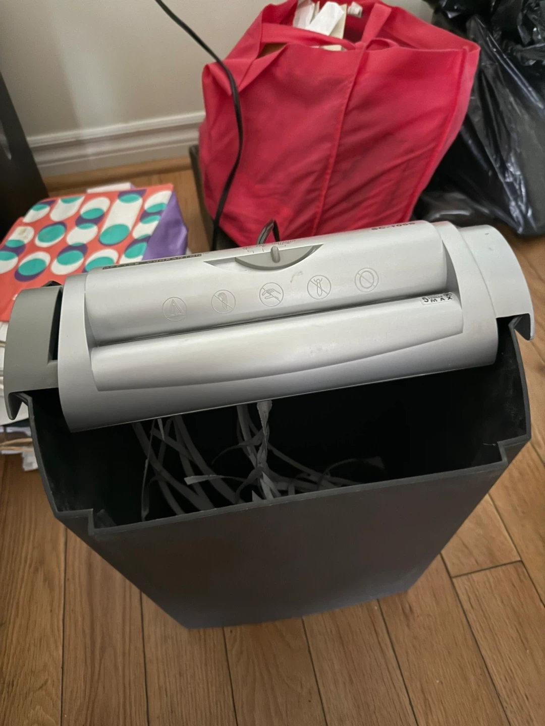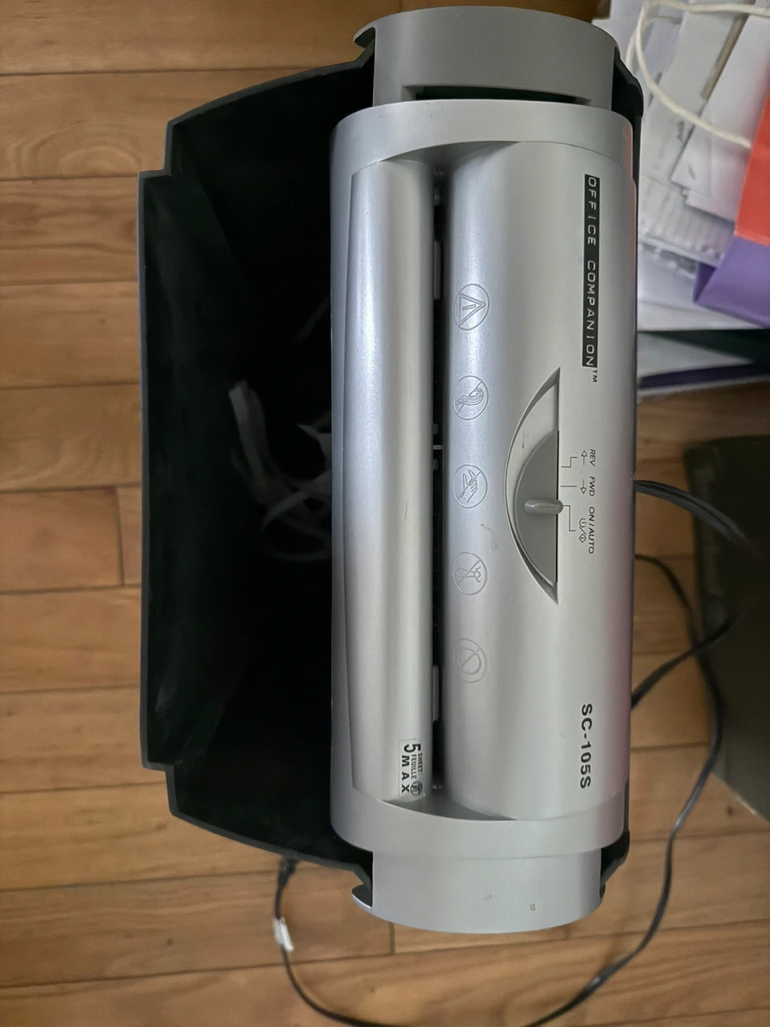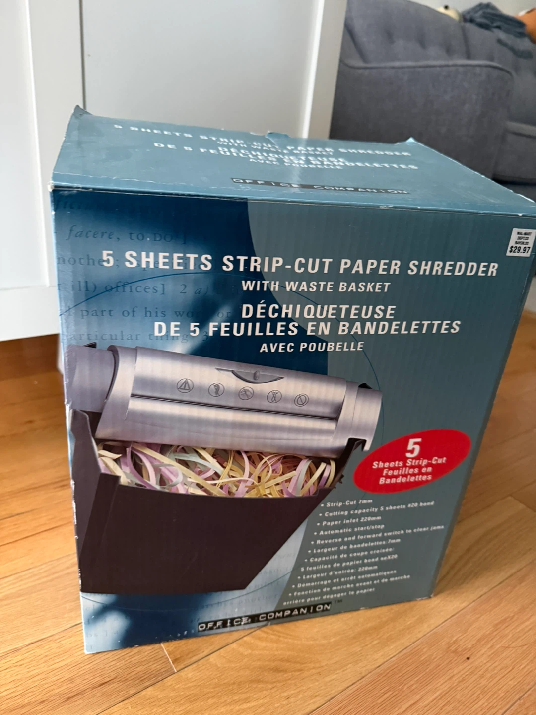 Selling an Office Companion 5-Sheet Strip-Cut Paper Shredder with waste basket. It has a cutting capacity of 5 sheets and automatic start/stop. Also features reverse and forward switch to clear jams