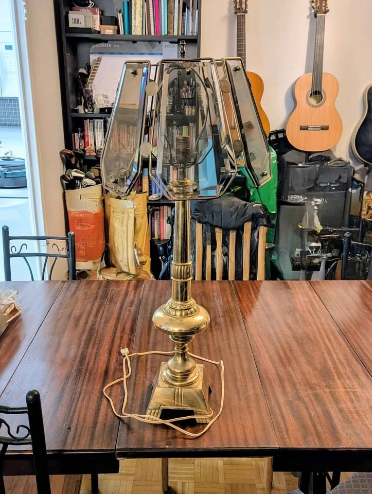 Beautiful and heavy vintage brass table lamp featuring a unique glass panel shade.