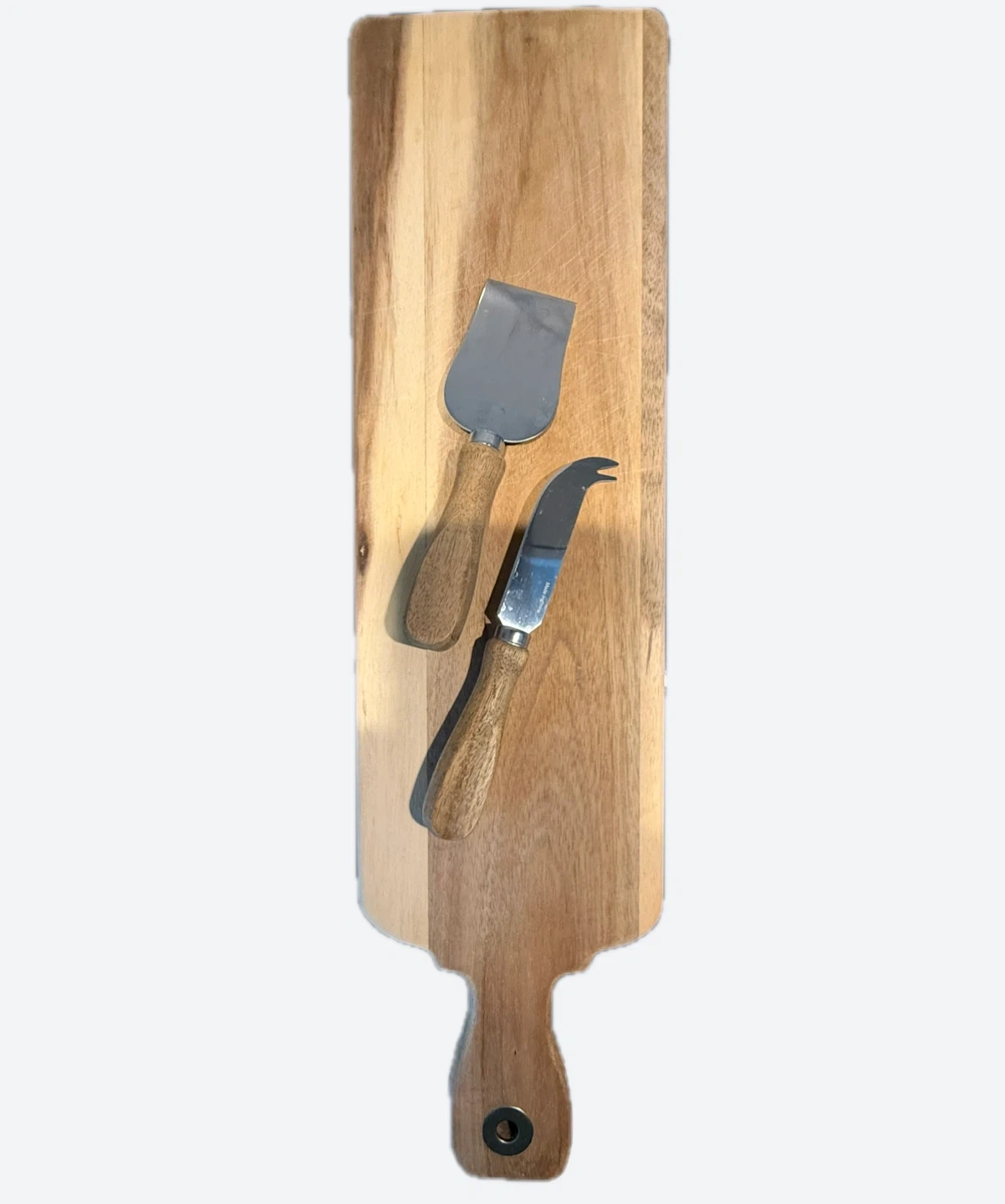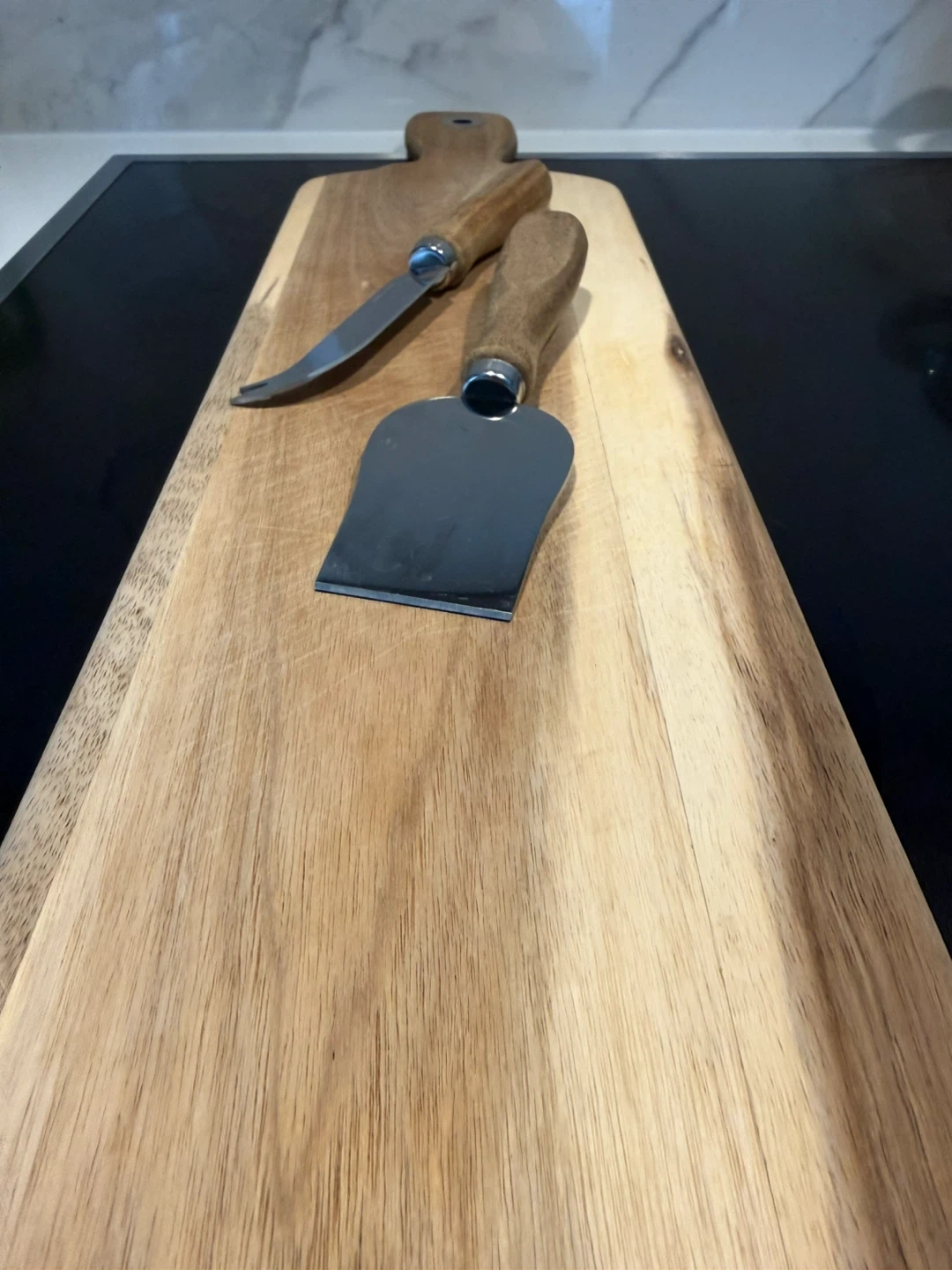 Selling a wooden cheese board with a cheese knife. It's in great condition and ready for your next charcuterie night!