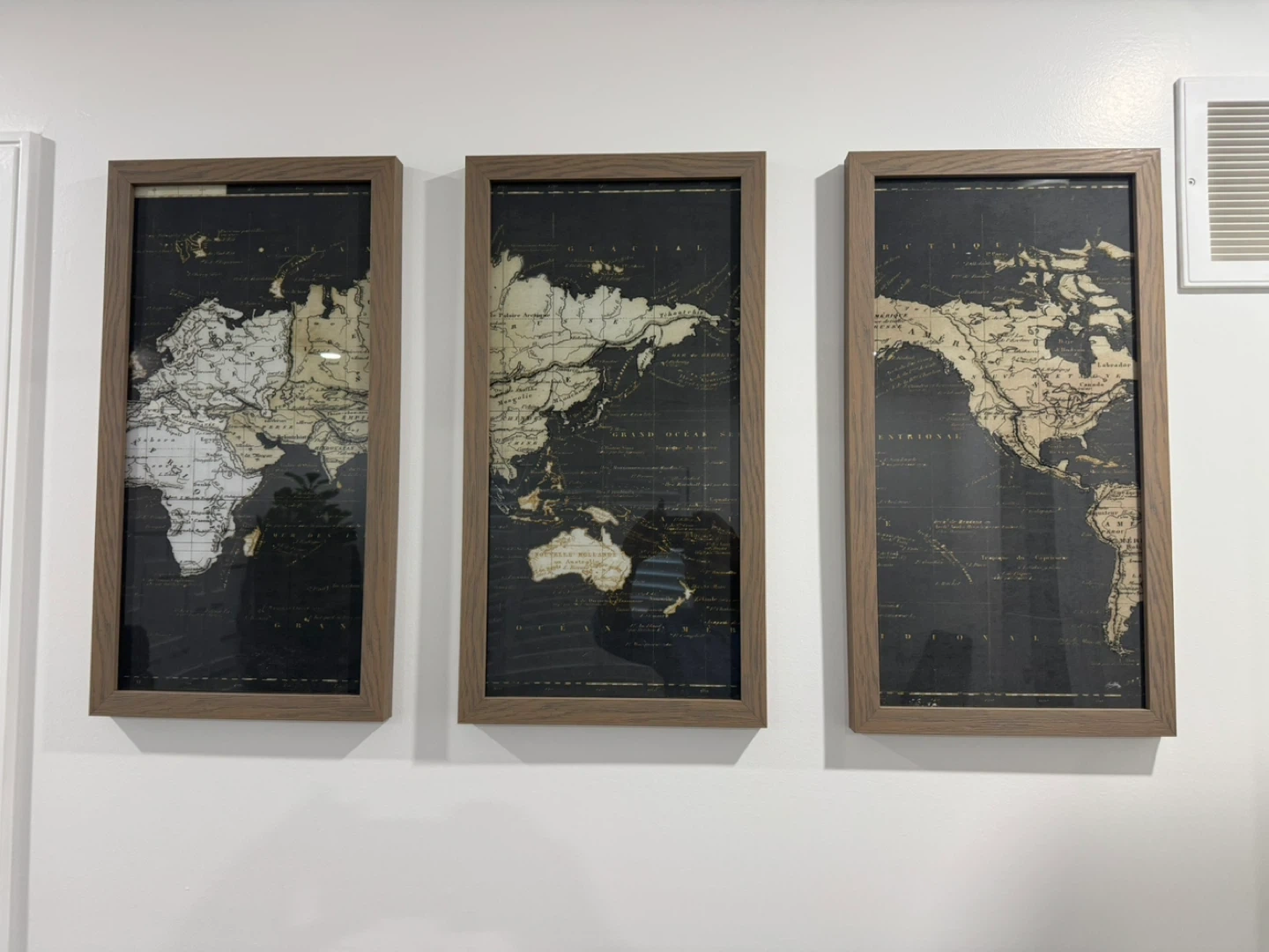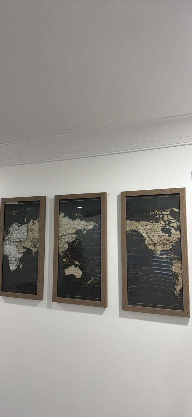 Modern and beautiful world map art pieces. The frames are a nice neutral brown colour that would match most decor styles.
