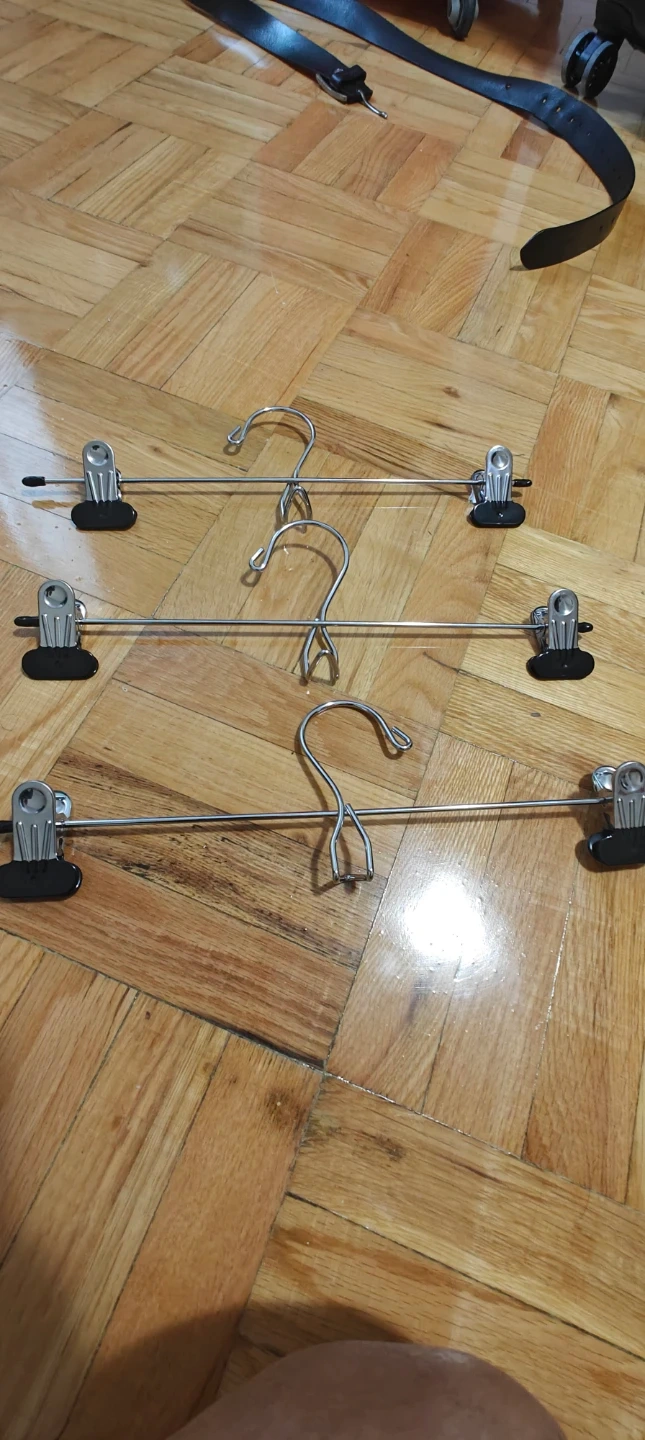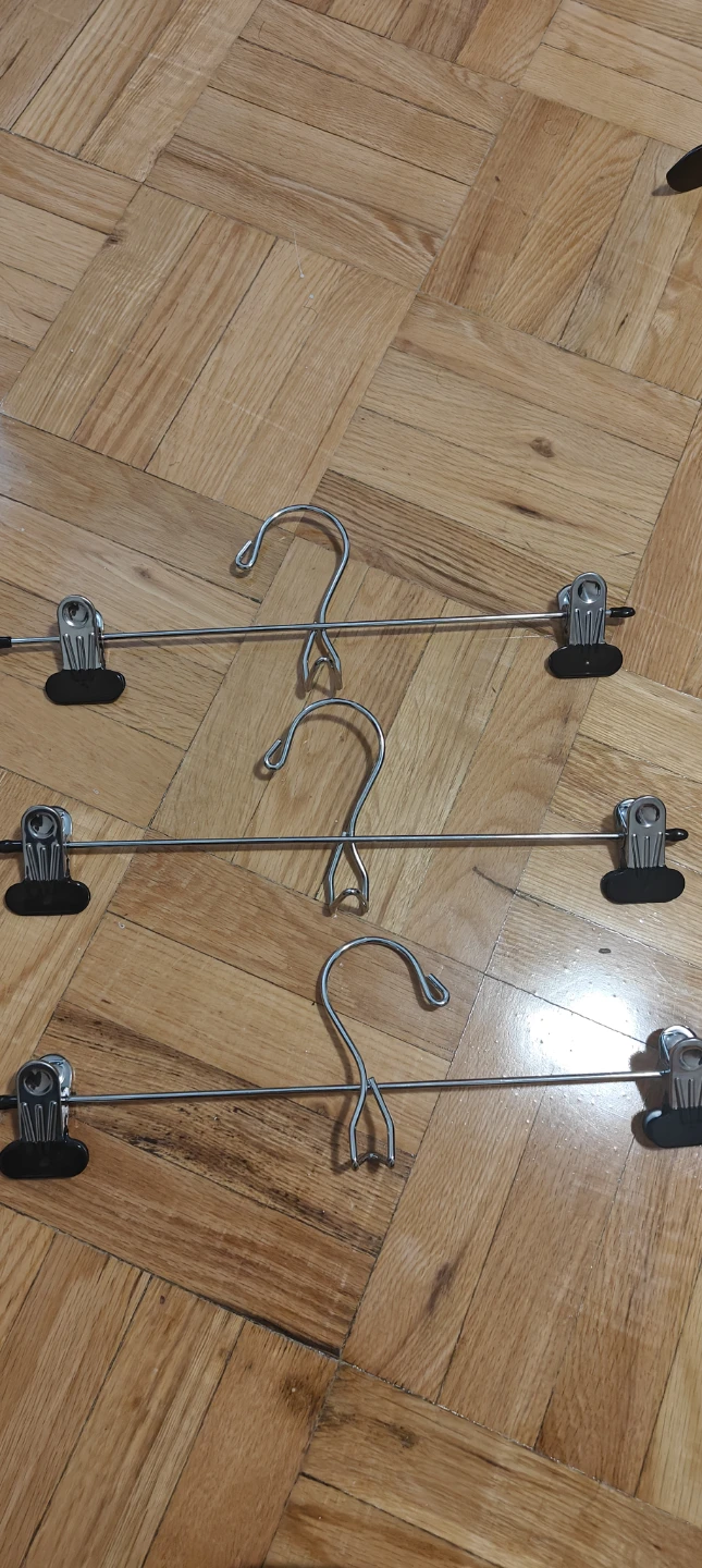 Selling a set of three pants hangers. They come with clips to keep your pants neatly hung in your closet. Great for organizing your wardrobe!