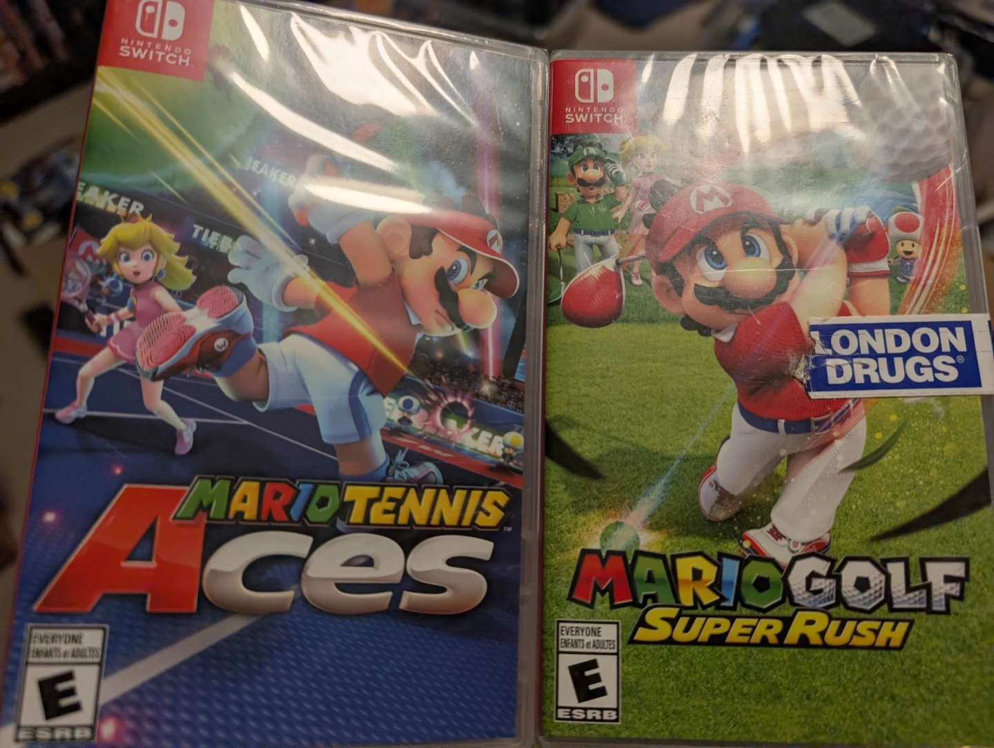 Selling two Nintendo Switch games together: Mario Tennis Aces and Mario Golf Super Rush! Both games are rated E for Everyone by the ESRB