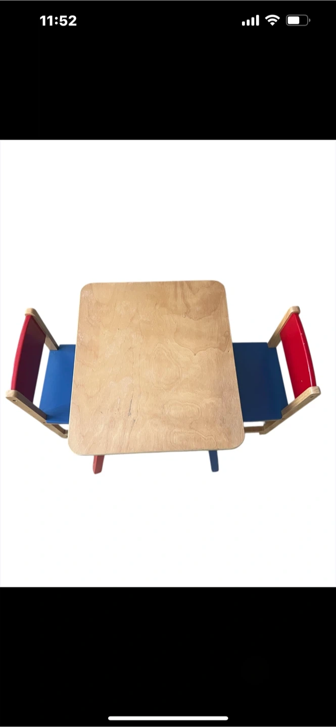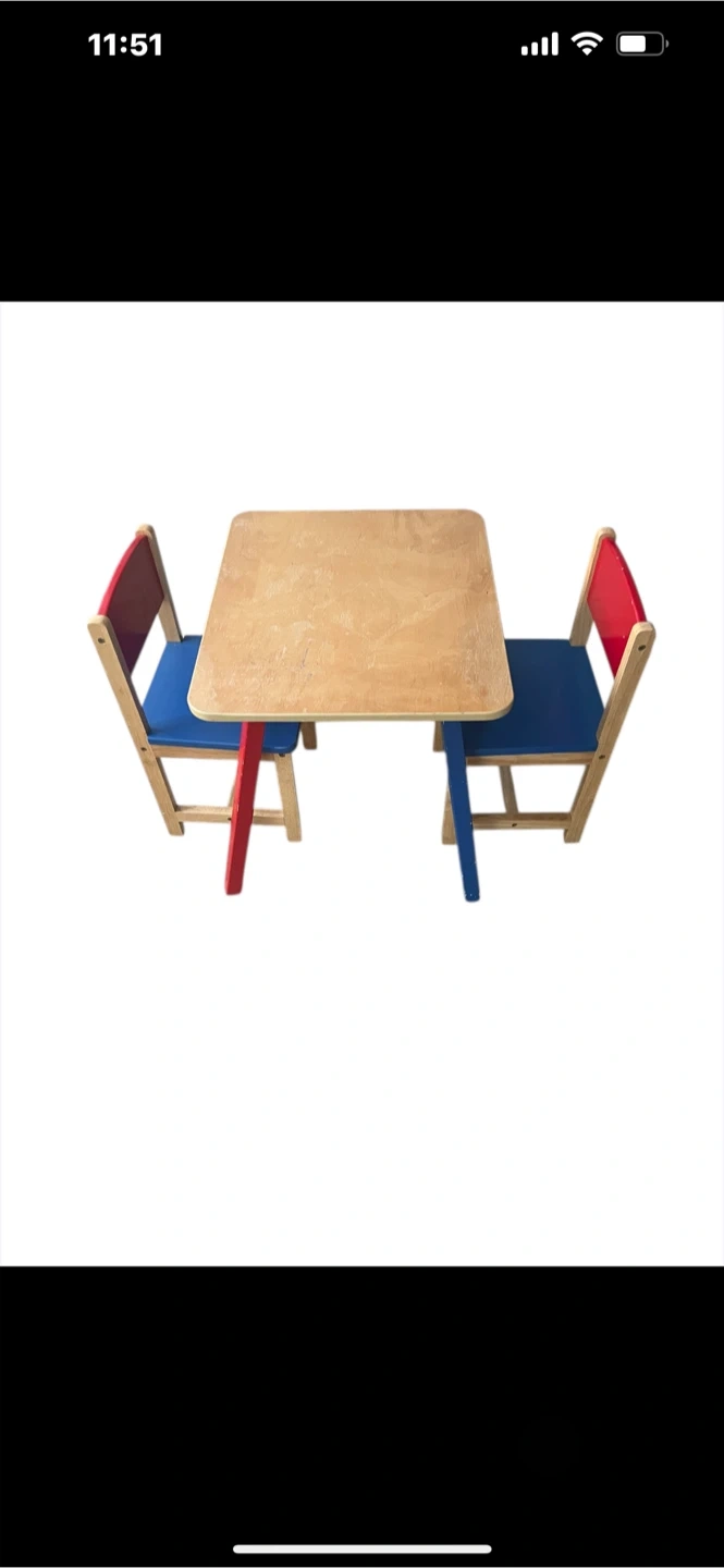 Selling a cute kids' table and chairs set! The table has a natural wood finish, and the chairs feature a red and blue colour scheme. Perfect for arts and crafts, snack time, or just a fun place for the little ones to hang out