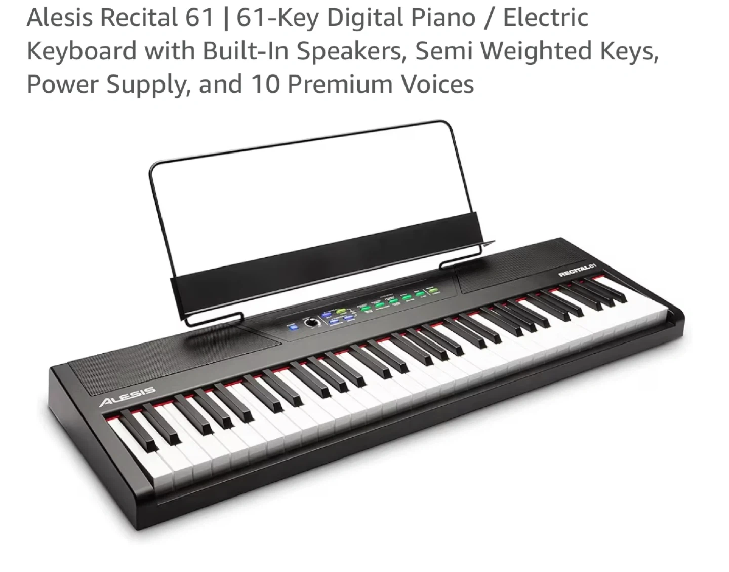 Alesis Recital 61-key digital piano! It comes with built-in speakers, semi-weighted keys, a power supply, and 10 premium voices.