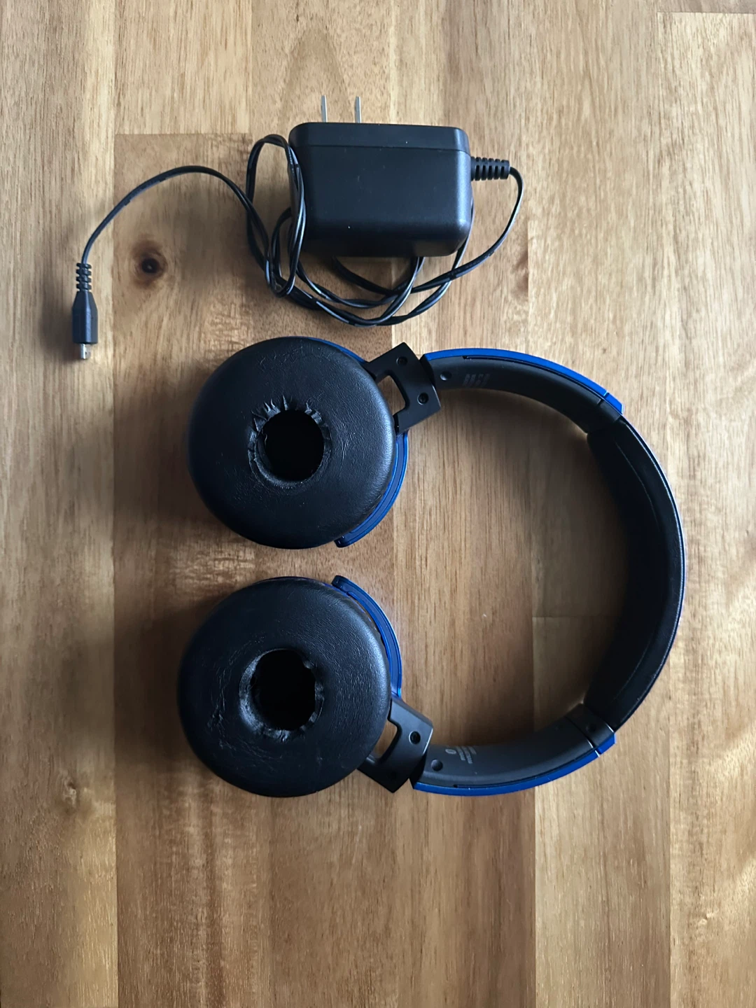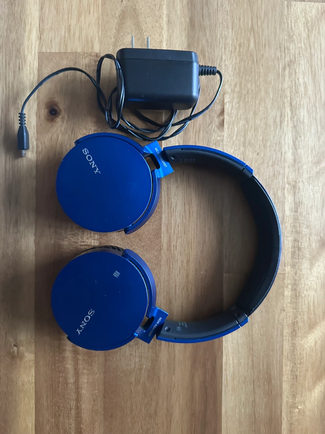 Selling a pair of Sony MDR-XB450AP wireless bluetooth headphones in blue! They come with a charger. These headphones are lightweight and portable, perfect for on-the-go listening. Let me know if you're interested!