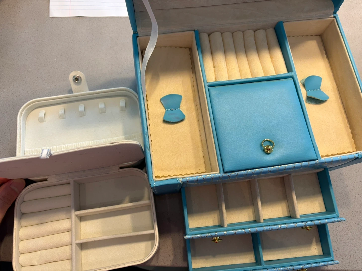 Here are two jewellery box organizers. One is a light blue multi-level box with drawers and the other is a smaller white travel case. They're both in good condition!