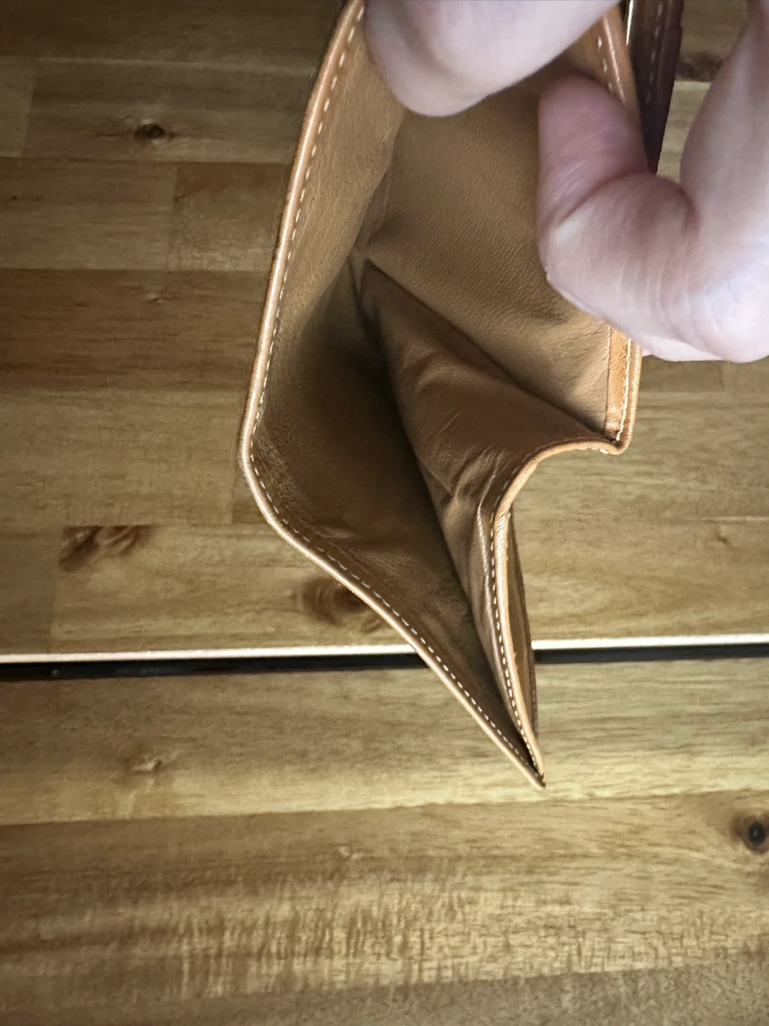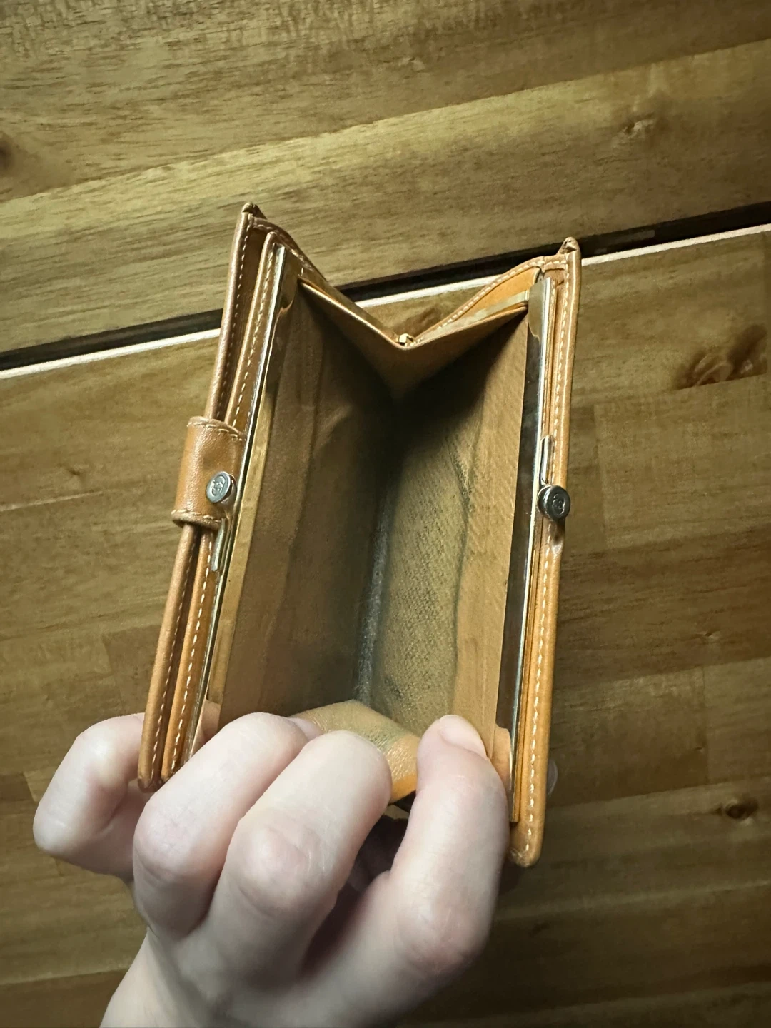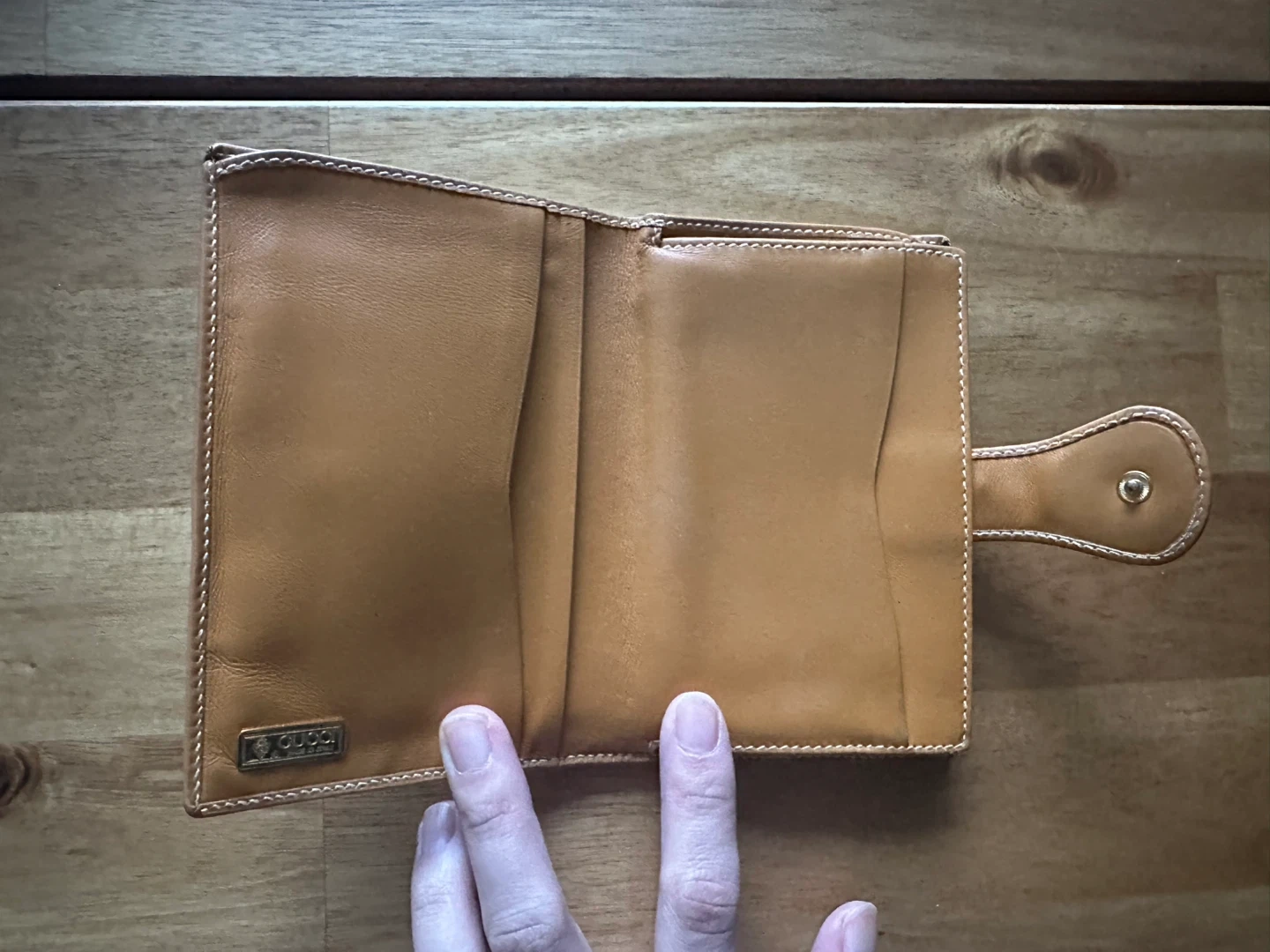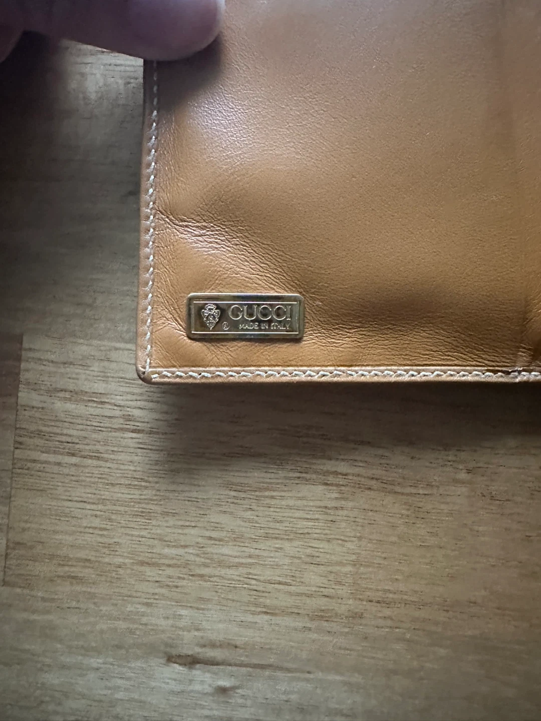 Selling a cute Gucci wallet! It has a beige and light brown design with the Gucci logo subtly patterned throughout. It's in great condition and perfect for keeping your cards, bills, and coins organized.