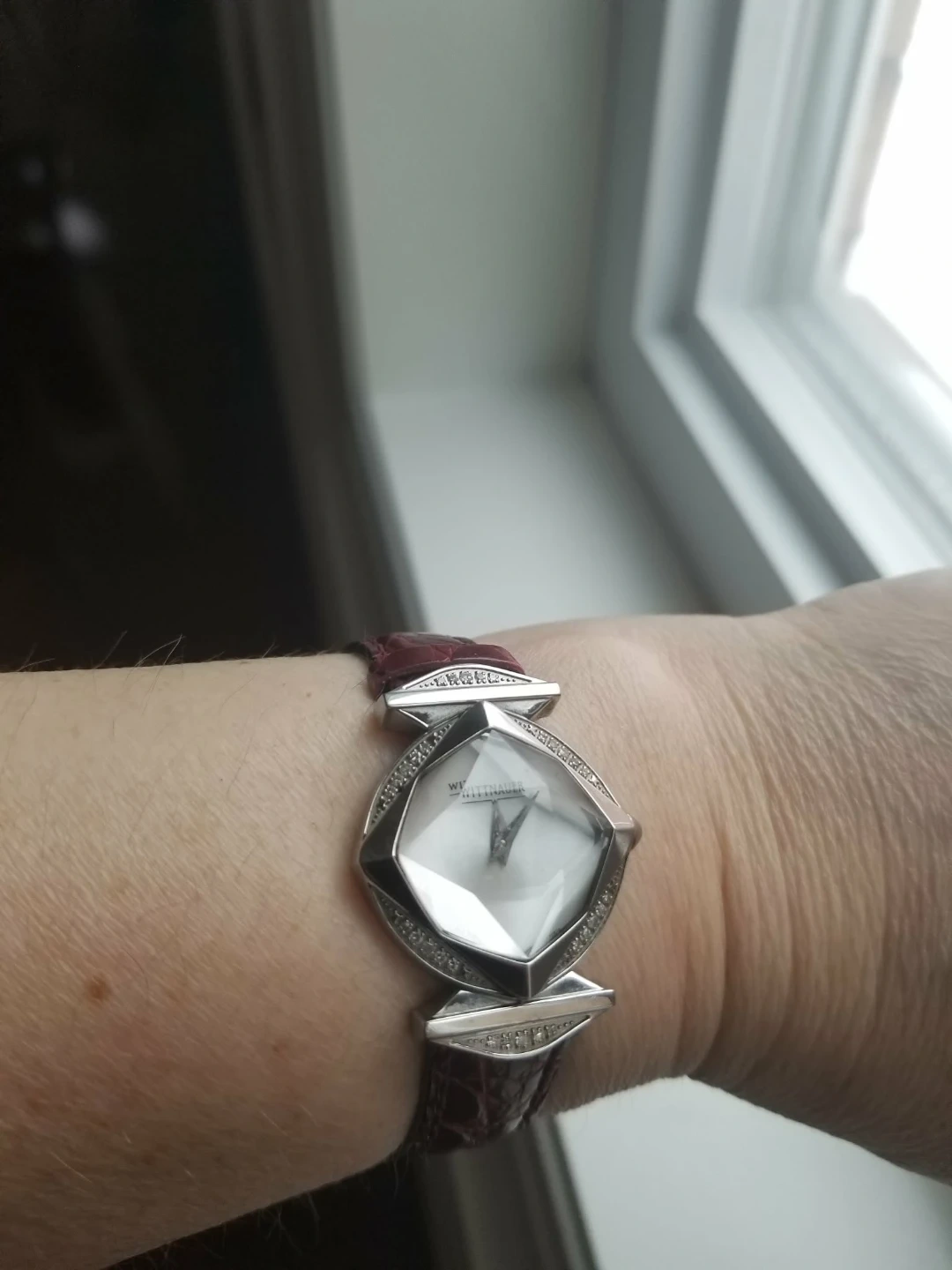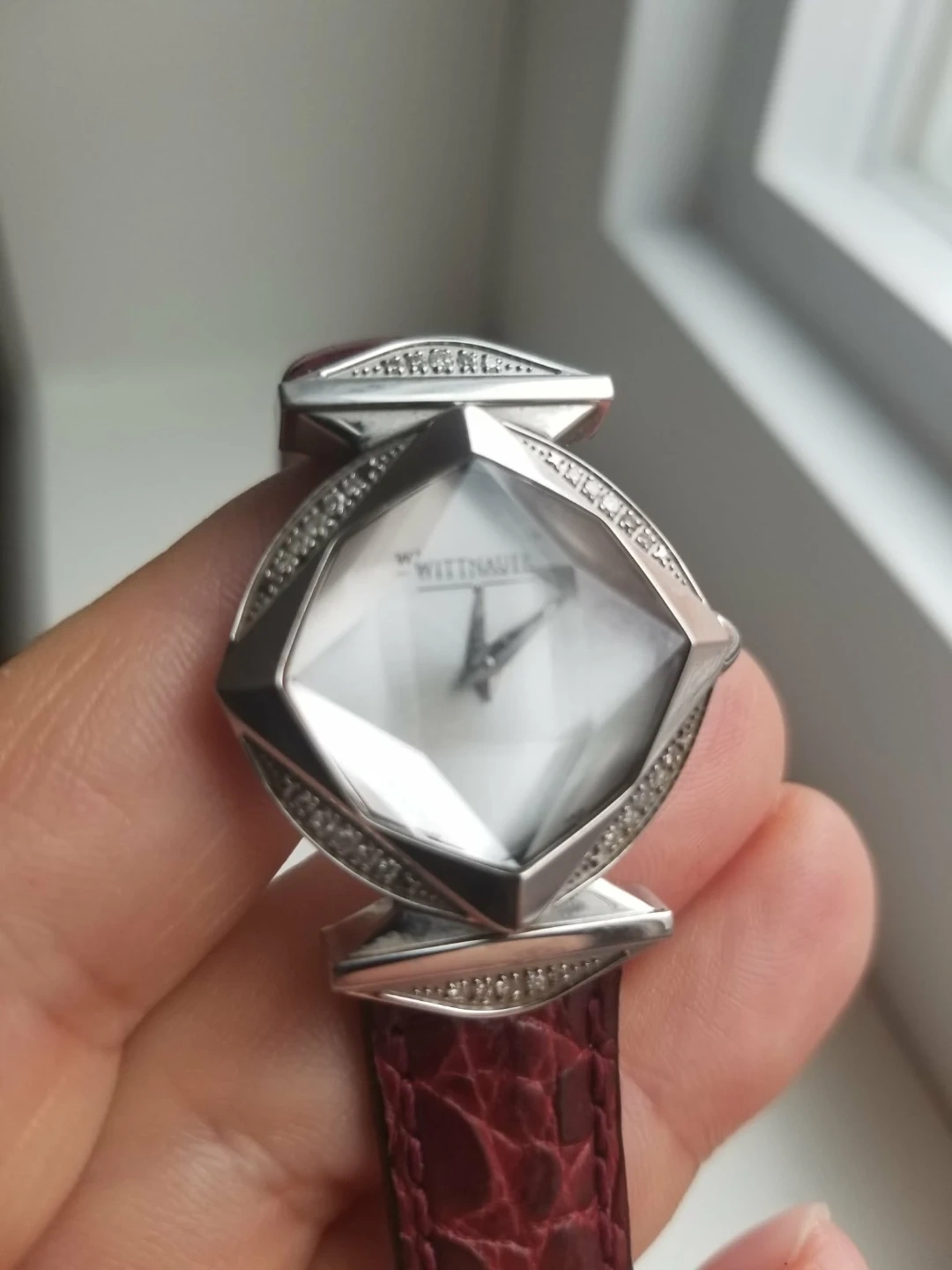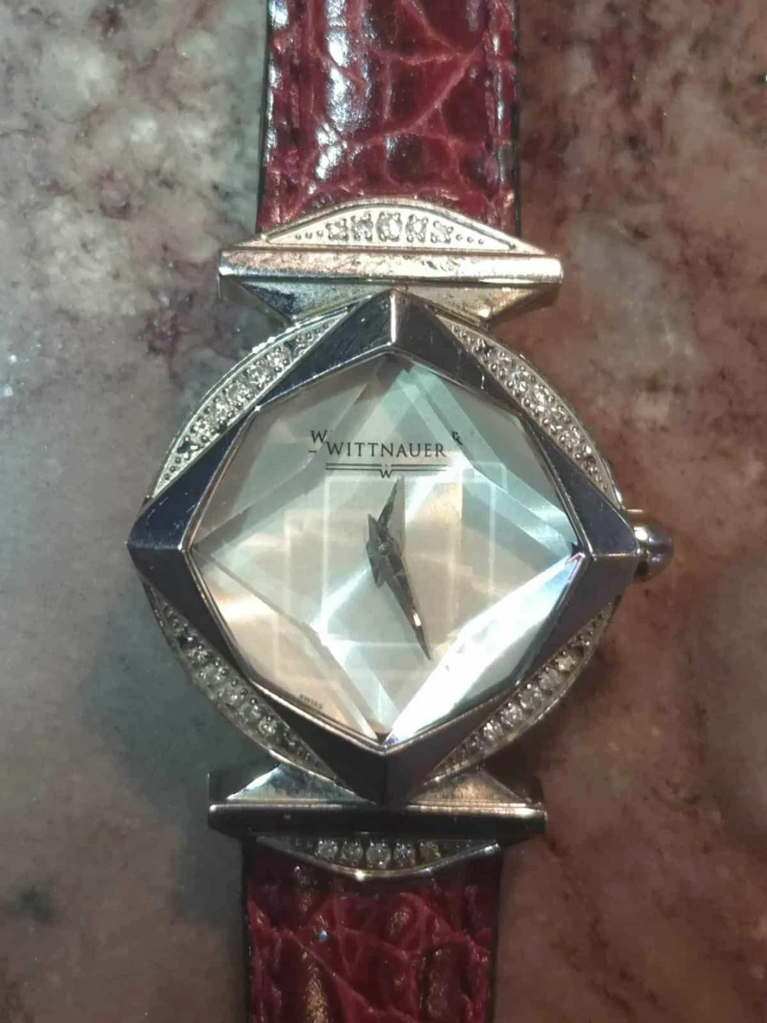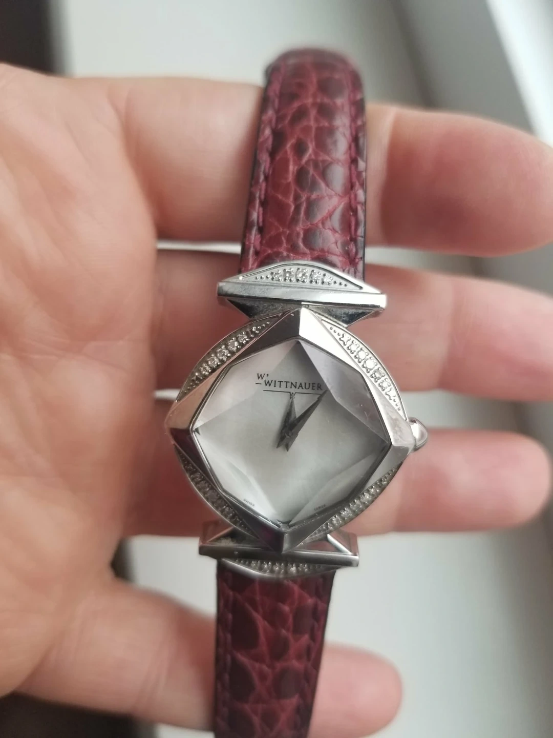 Wittnauer women's watch. It features a unique diamond-shaped face and a burgundy leather strap.