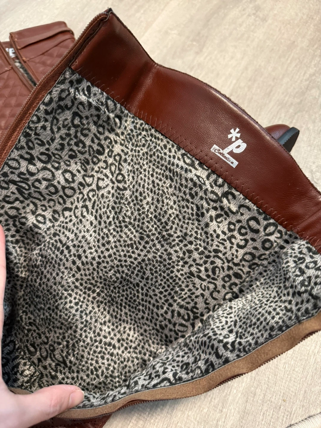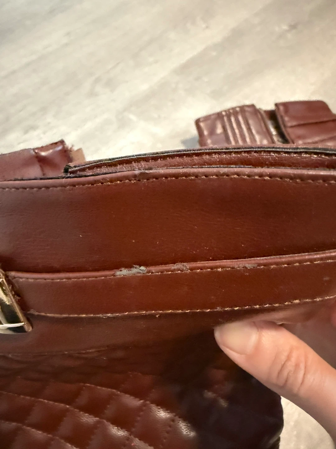 Never worn. Minor peeling on the leather edges (visible in photos), likely from storage.