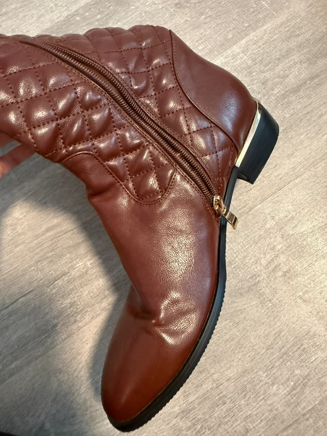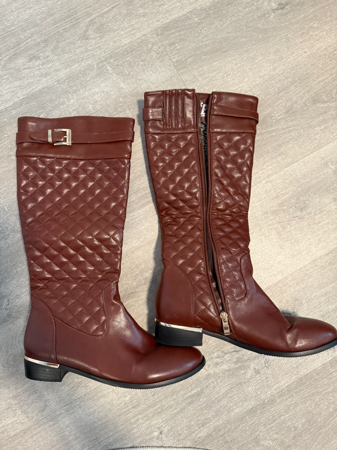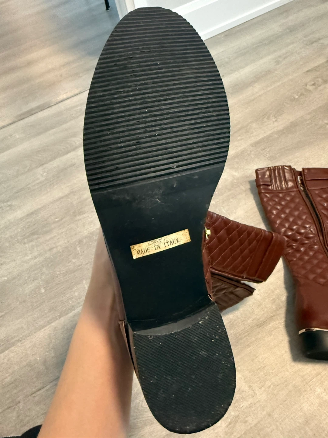 Selling a pair of knee-high boots in a lovely brown colour from Italy. They feature a quilted design and a convenient zipper.