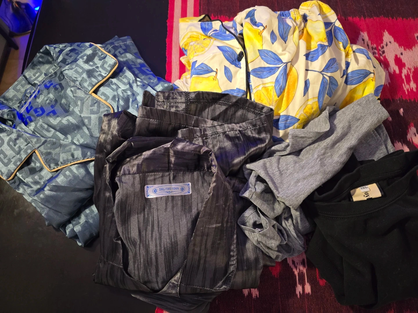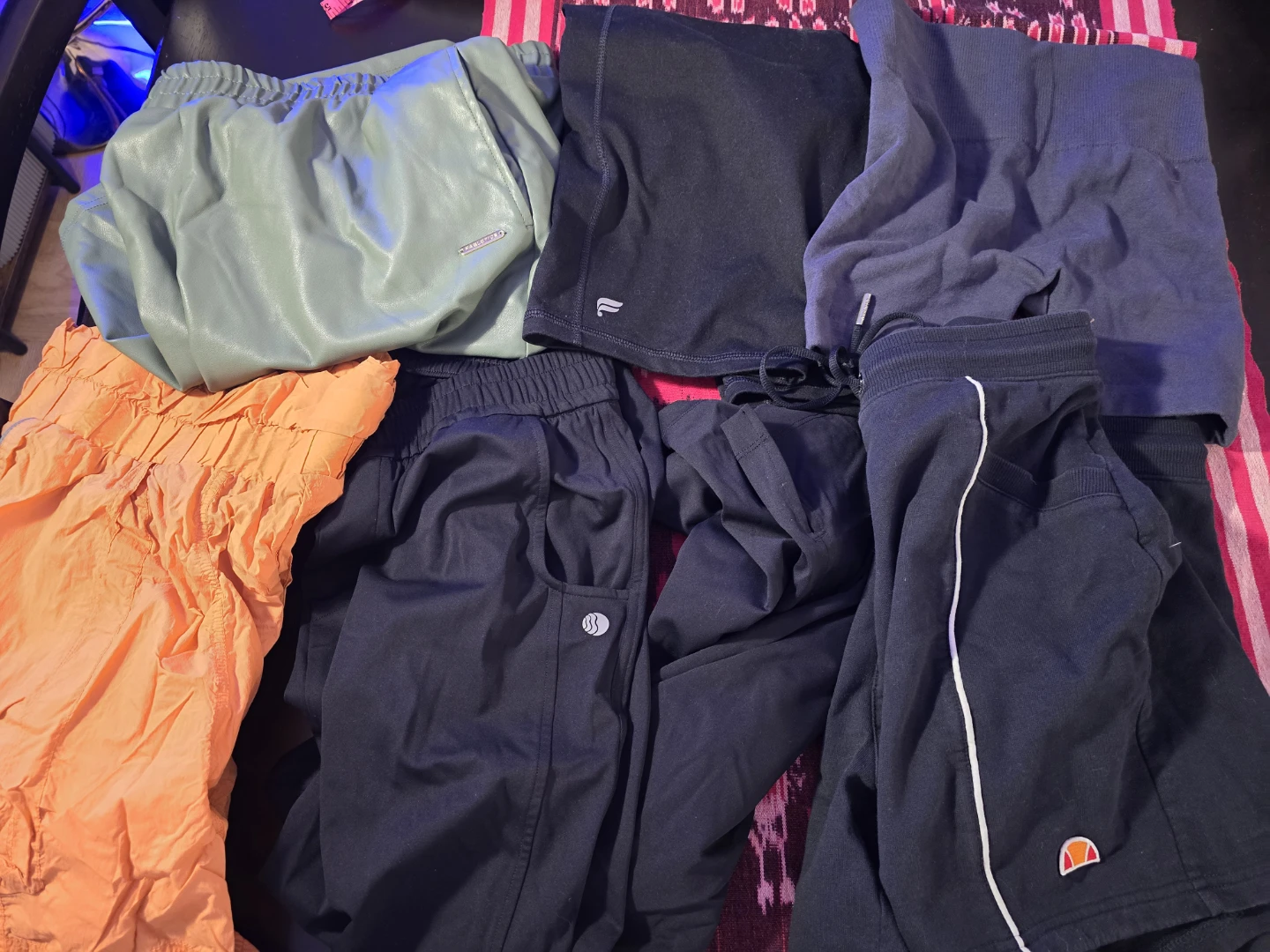 A mixed lot of clothing items for free! You'll find a variety of pajamas, shorts, and pants in different colors and sizes.