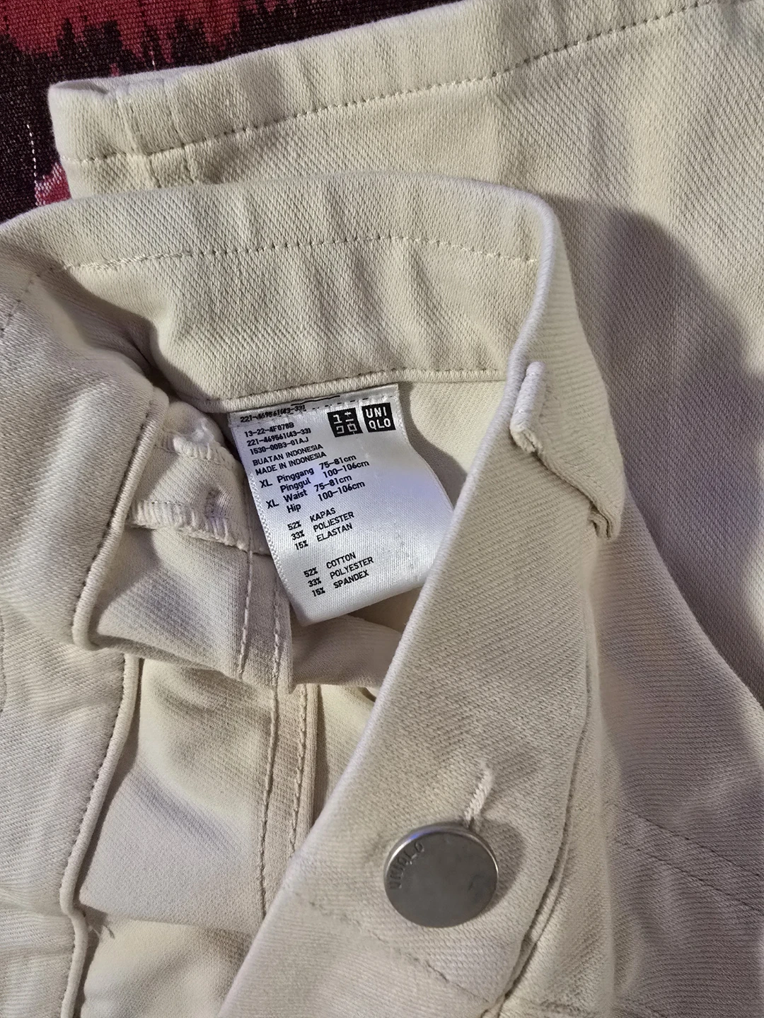 Included is a pair of Uniqlo pants, size XL, made of 62% cotton, 33% polyester, and 5% spandex.