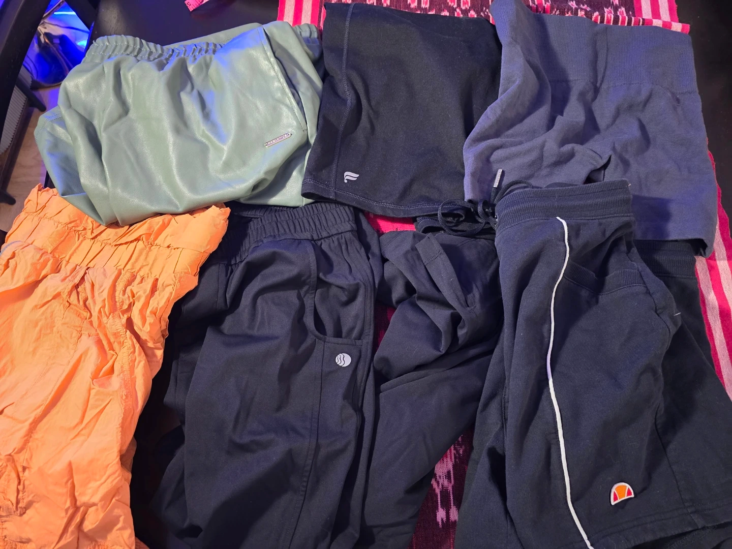 A mixed lot of clothing items for free! You'll find a variety of pajamas, shorts, and pants in different colors and sizes.