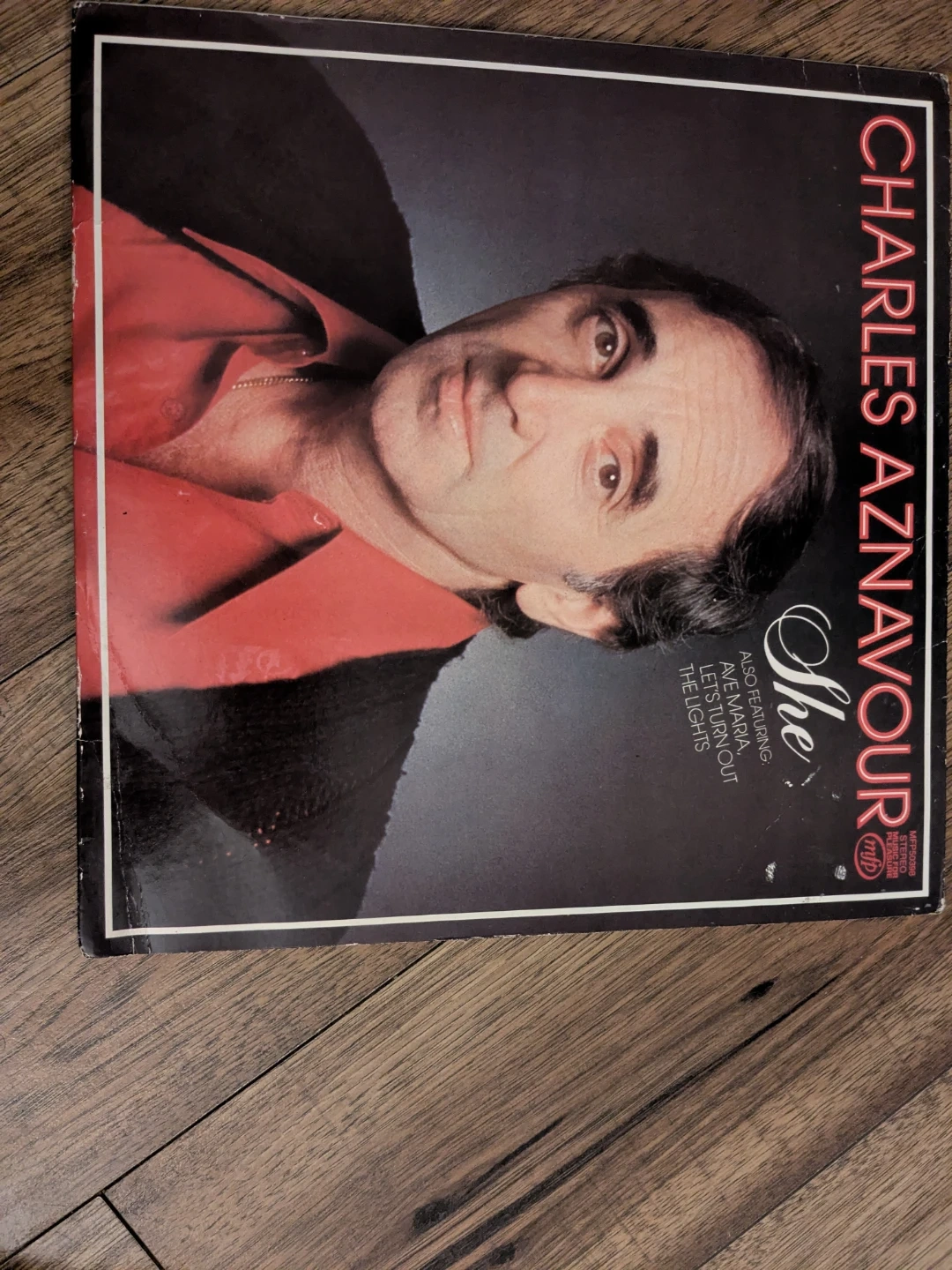 Selling a Charles Aznavour vinyl record featuring the song 'She' and also 'Ave Maria' and 'Let's Turn Out The Lights'. The record is in good condition and ready to be enjoyed!
