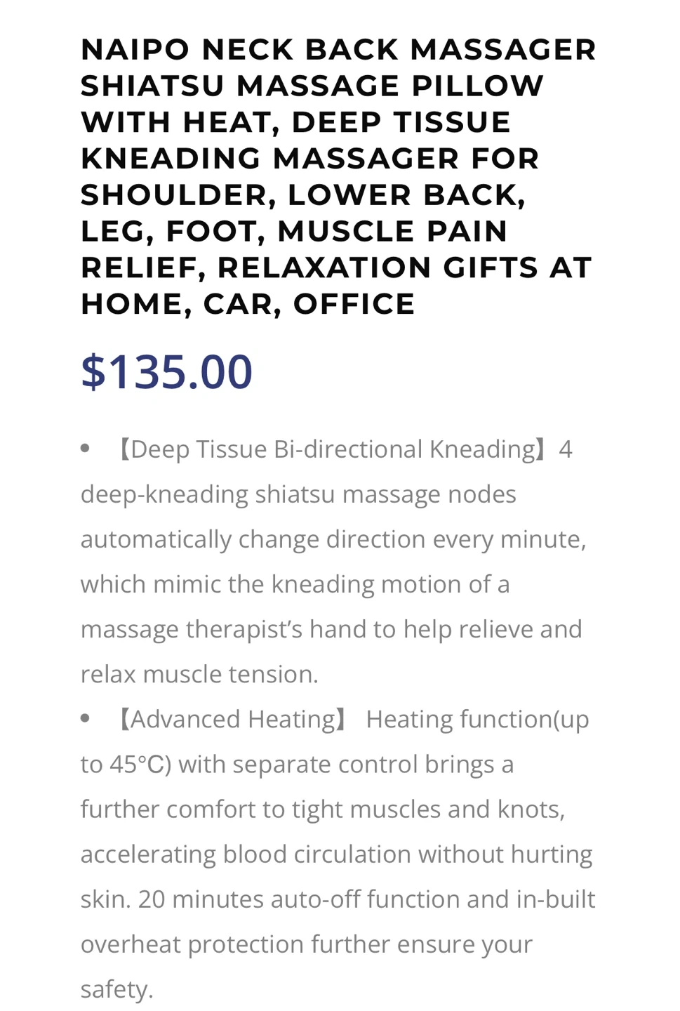 NAIPO NECK BACK MASSAGER SHIATSU MASSAGE PILLOW WITH HEAT, DEEP TISSUE KNEADING MASSAGER FOR SHOULDER, LOWER BACK, LEG, FOOT, MUSCLE PAIN RELIEF, RELAXATION GIFTS AT HOME, CAR, OFFICE