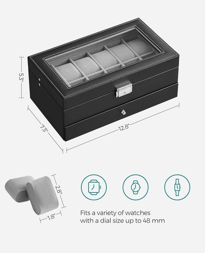 ⌚ SONGMICS 12-Slot Watch Box Case with Glass Lid – NEW